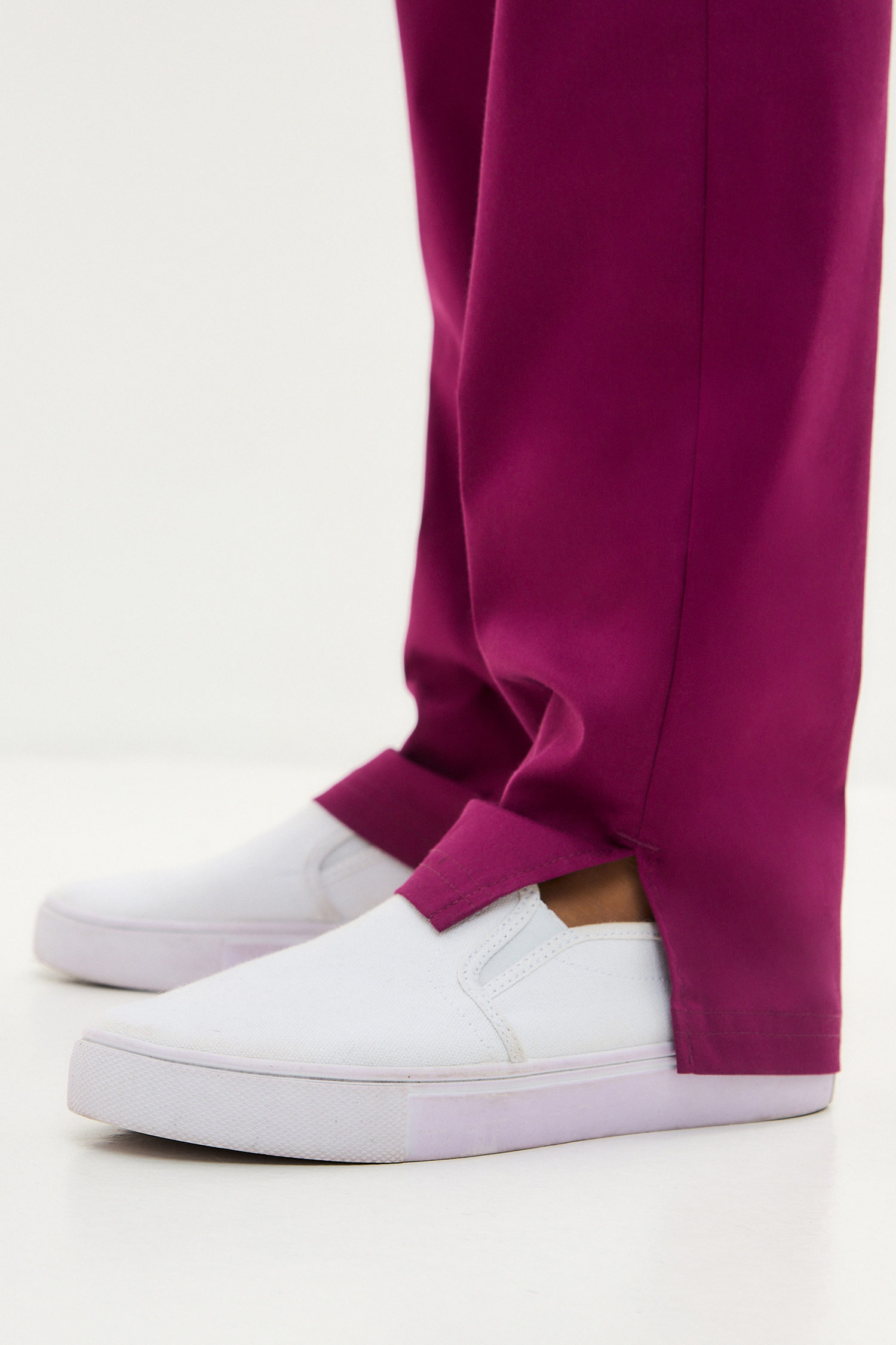 Длинные брюки прямого кроя имеют модные в этом сезоне разрезы в нижней части боковых швов.