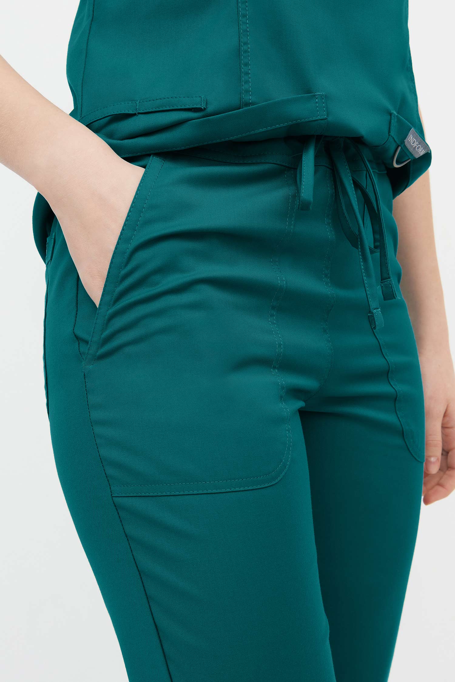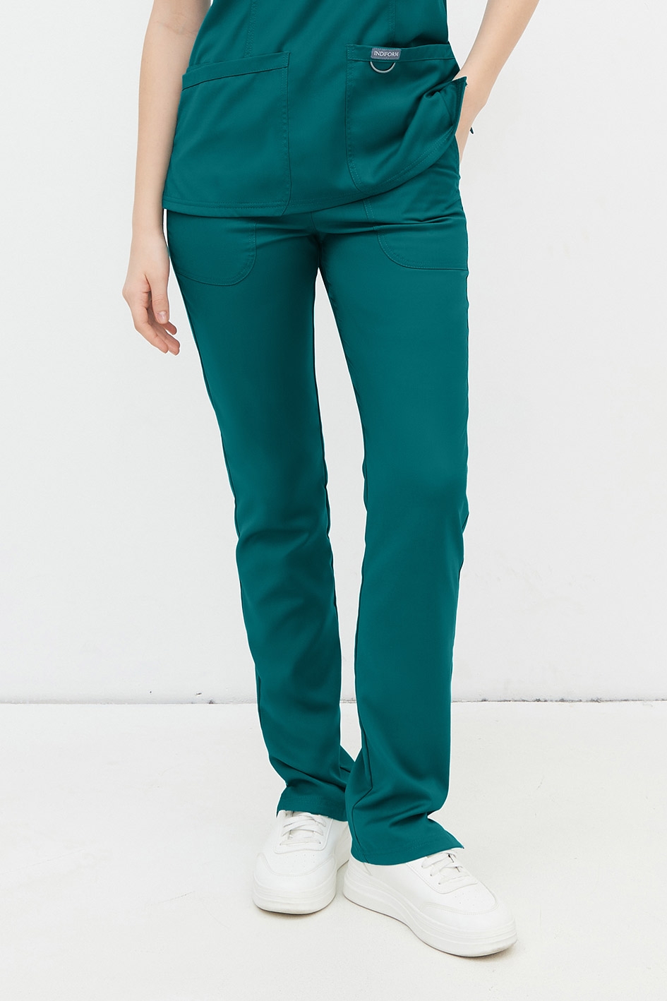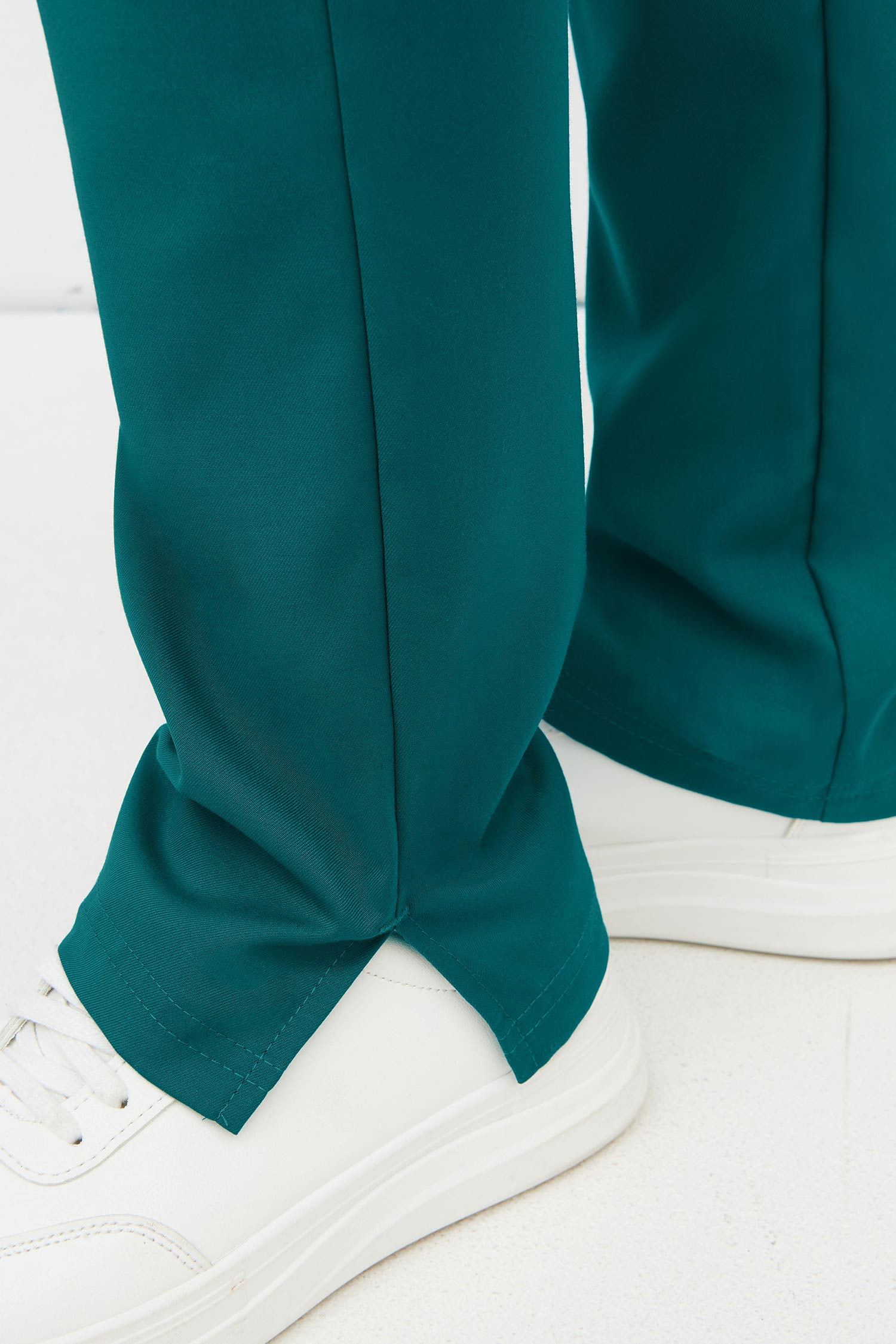 Брюки средней посадки, прямые, длинные с разрезами по низу боковых швов. Брюким комфортно прилегают в области бёдер. Пояс на мягкой эластичной резинке с дополнительной регулировкой ширины с помощью шнура. В брюках предусмотрено три удобных накладных кармана - два боковых и один задний.