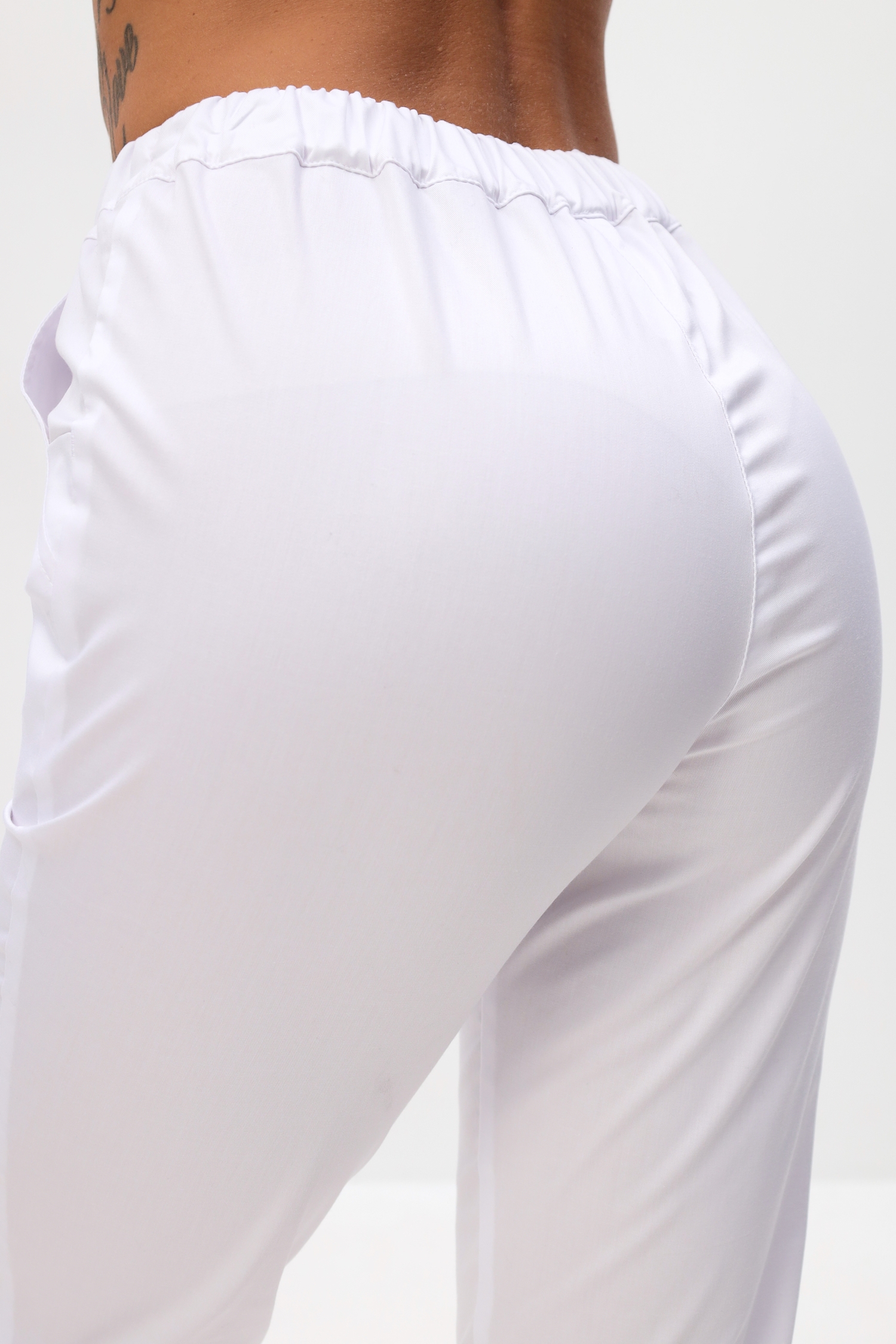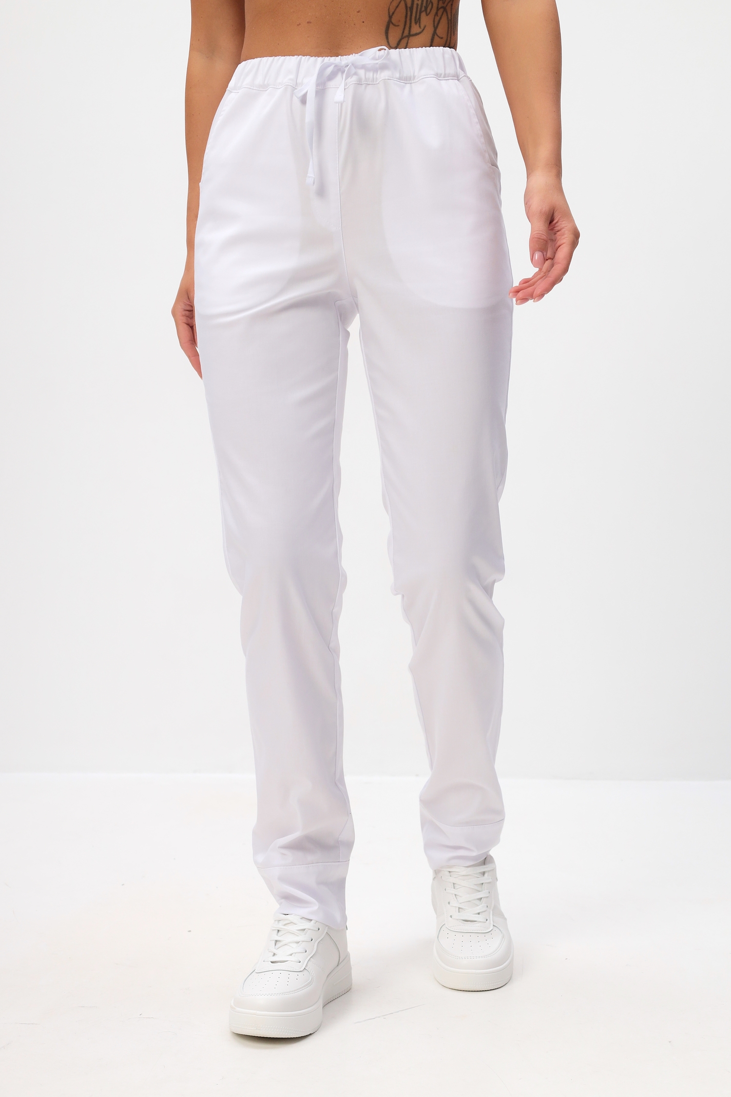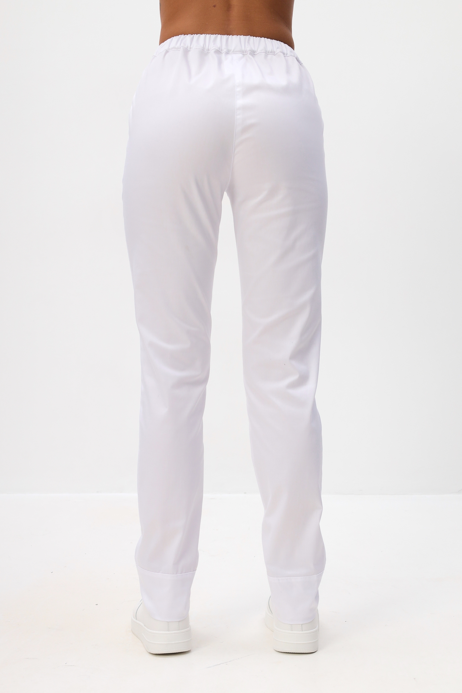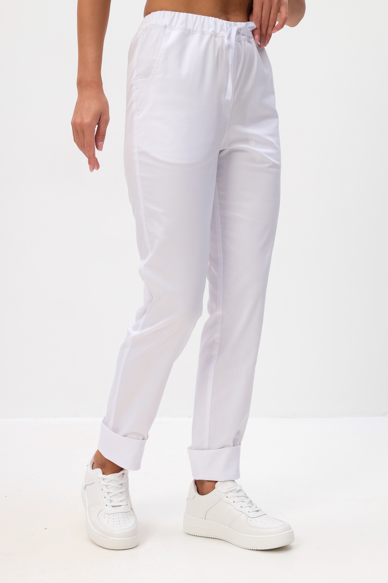 Брюки комфортно прилегают в зоне бёдер и слегка заужены книзу. В брюках обработана имитация застежки. Пояс брюк стянут мягкой эластичной лентой с дополнительной фиксацией объемов с помощью шнура.