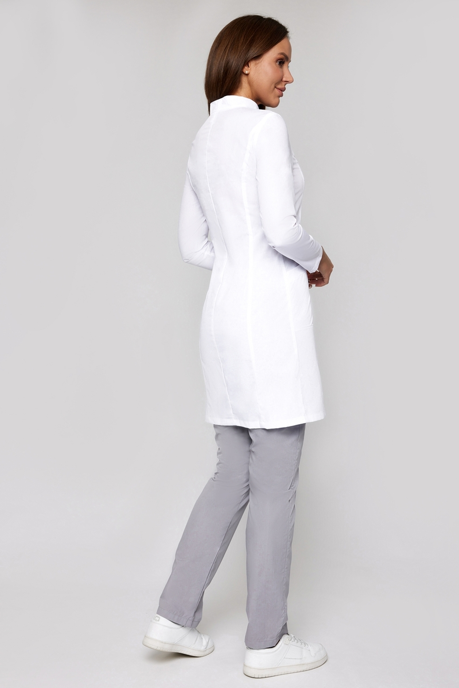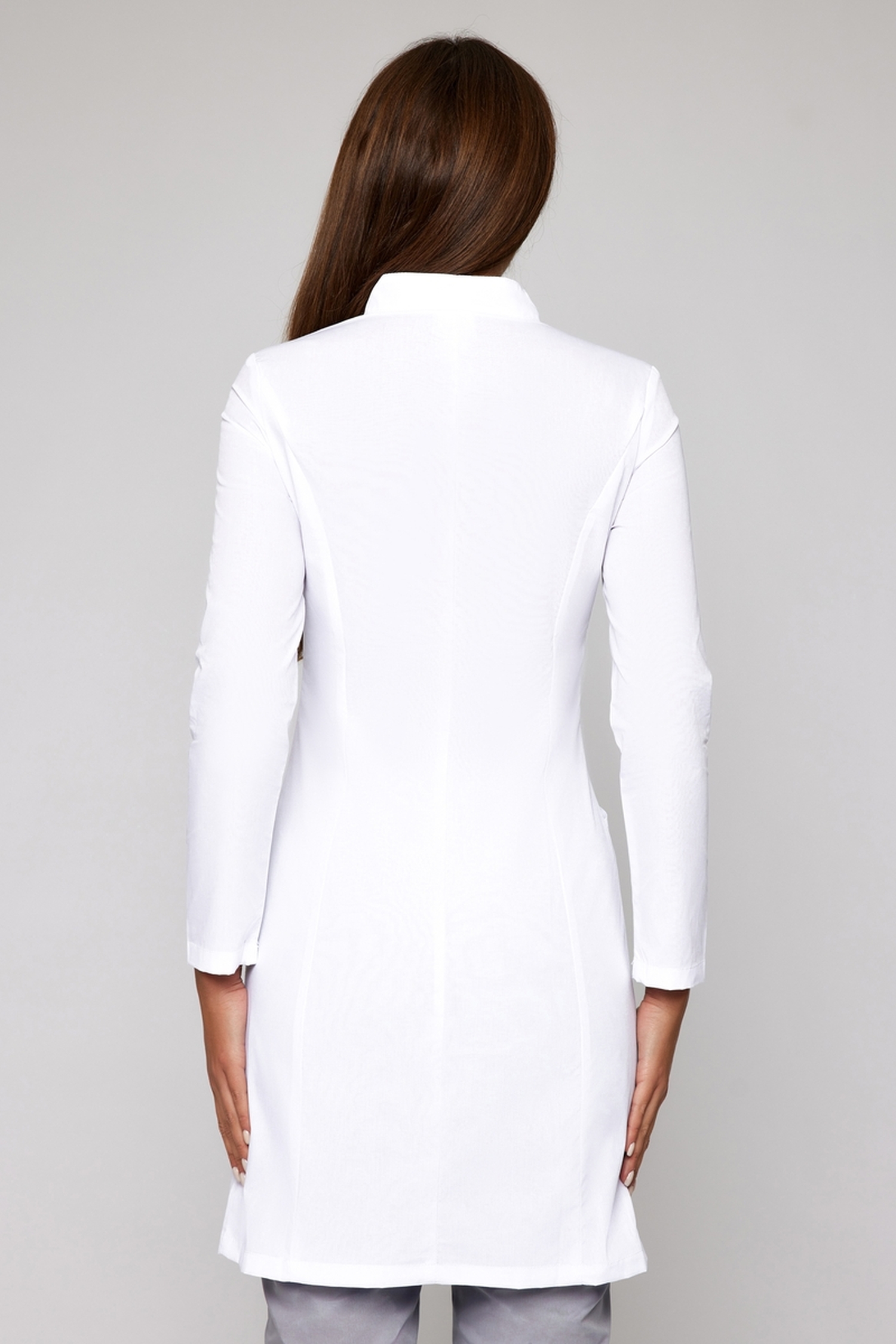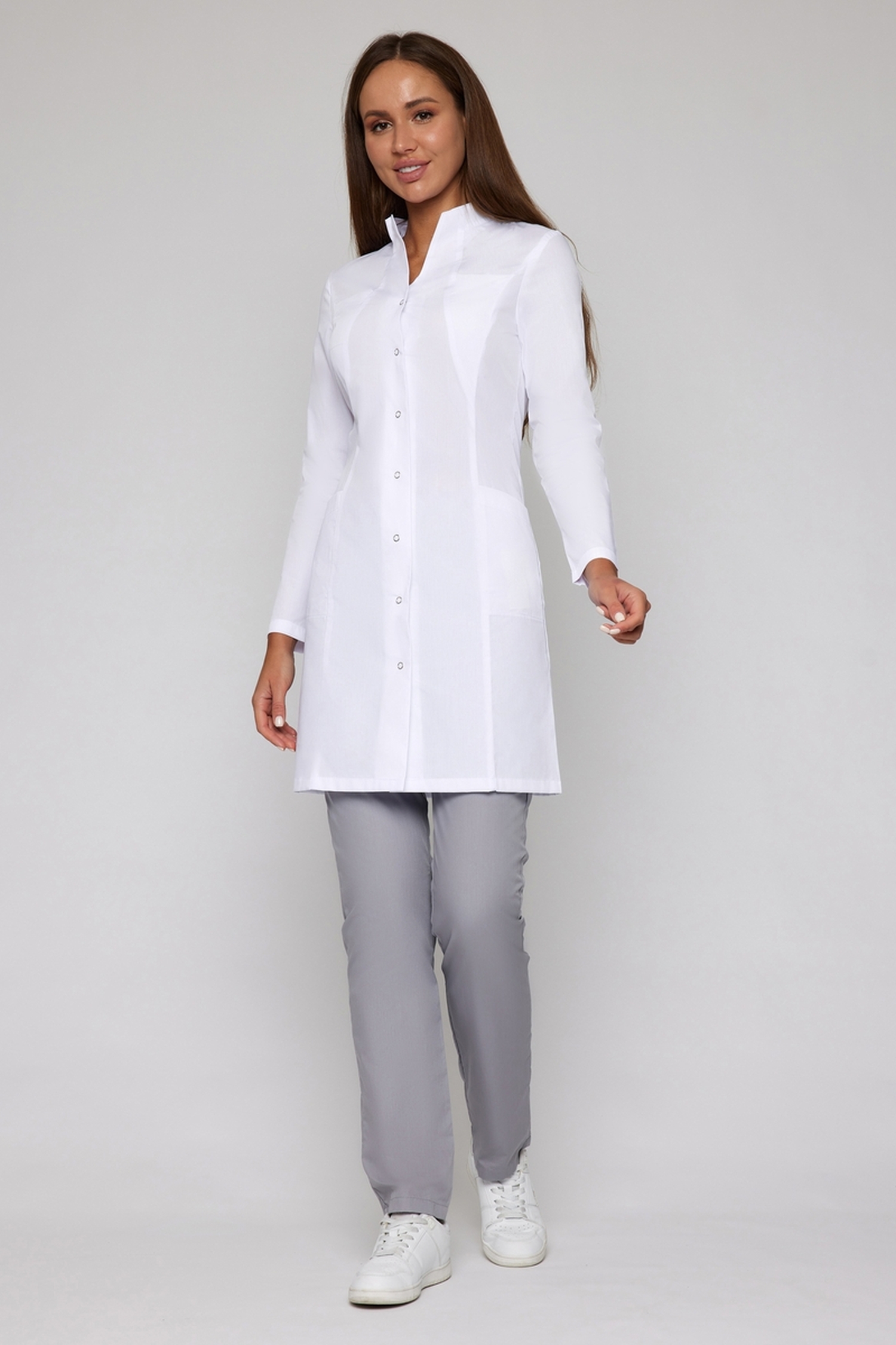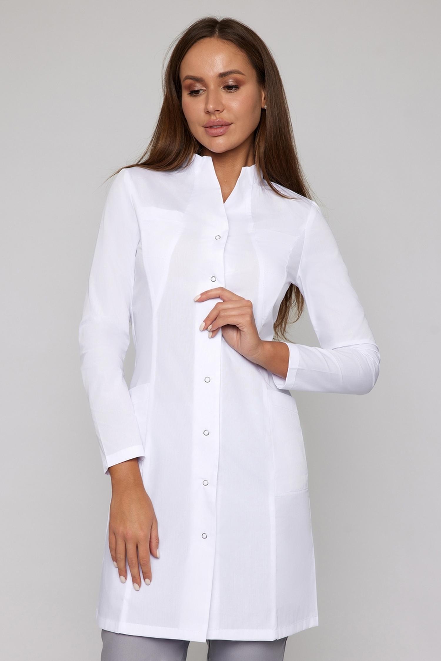 Изюминкой этой классической модели является воротник-стойка, который одновременно и строг за счет четких линий, и в то же время изящен. Вертикальные швы подчеркивают стройность силуэта. Длина халата чуть выше колена, рукава длинные. Ткань (TC Премиум) содержит 35% хлопка и 65% полиэфира. Материал тонкий, легкий, подходит для лета или теплых помещений. Благодаря полиэфиру изделие легко отстирывается и долго носится.