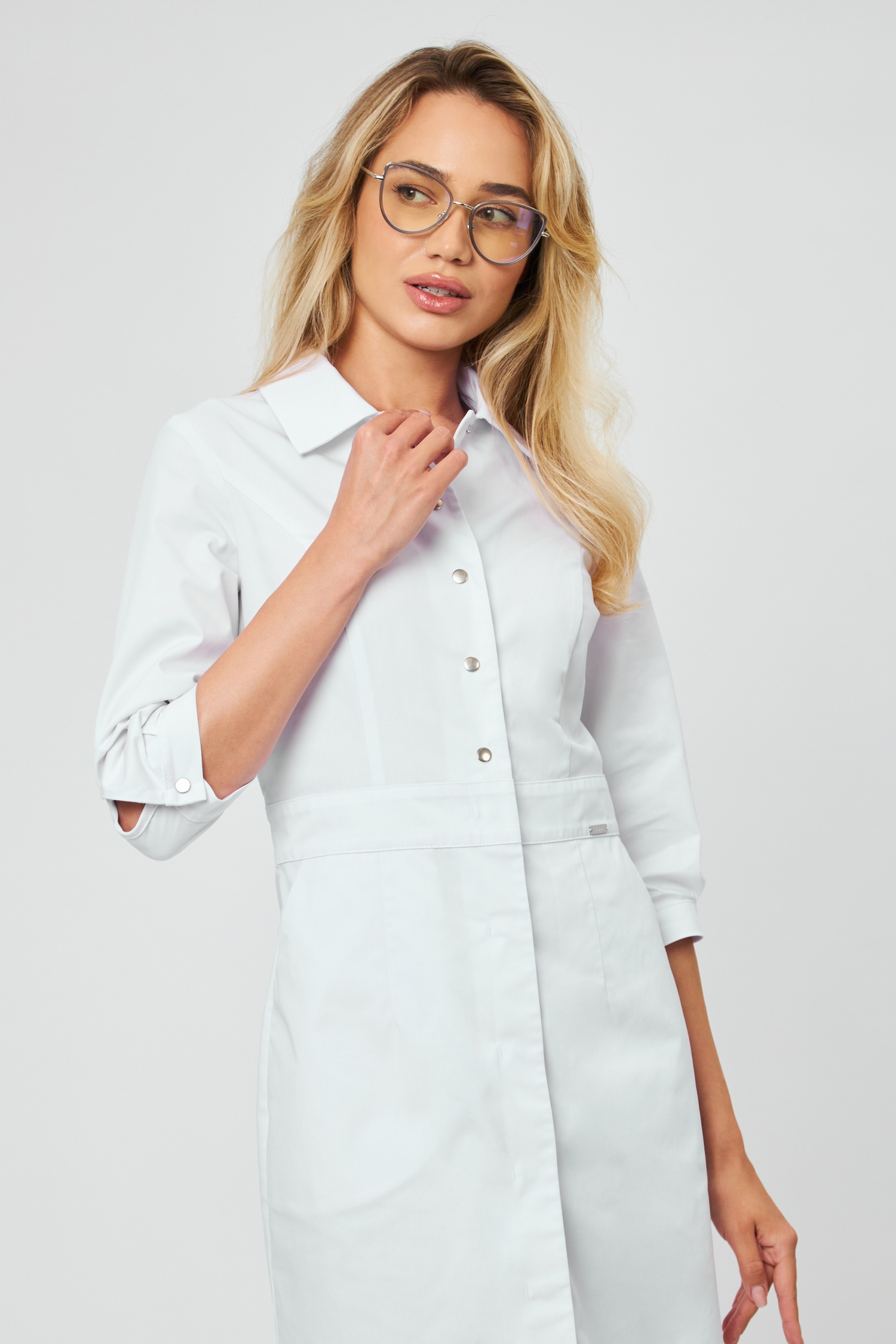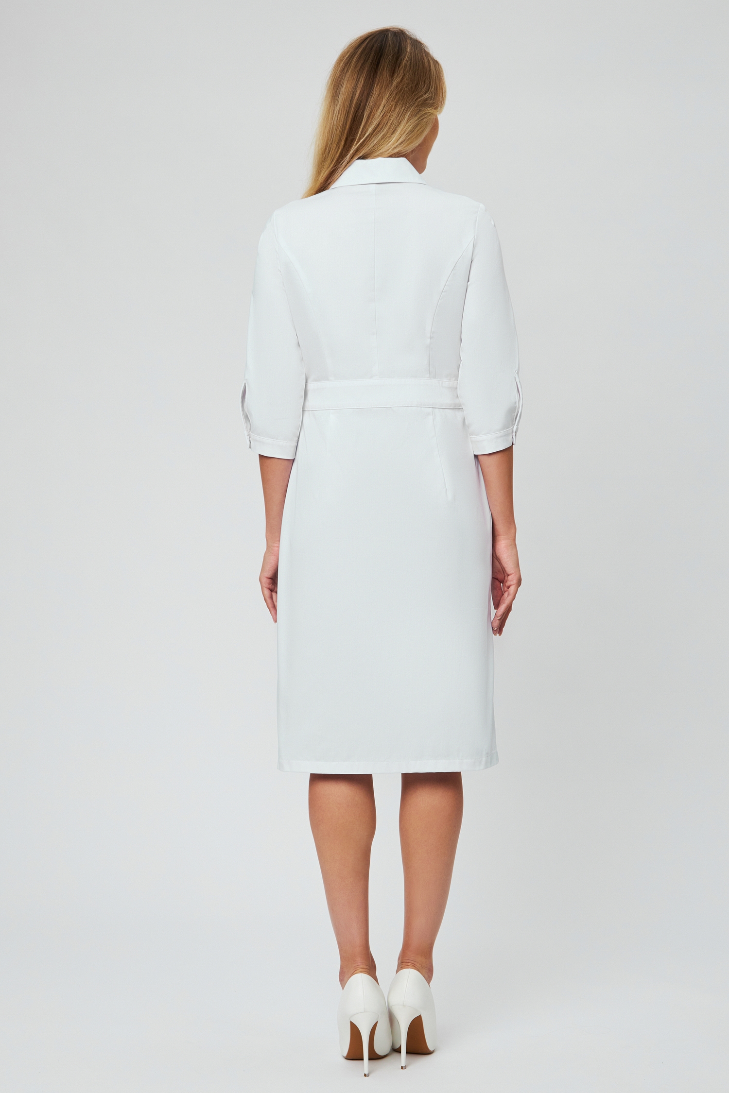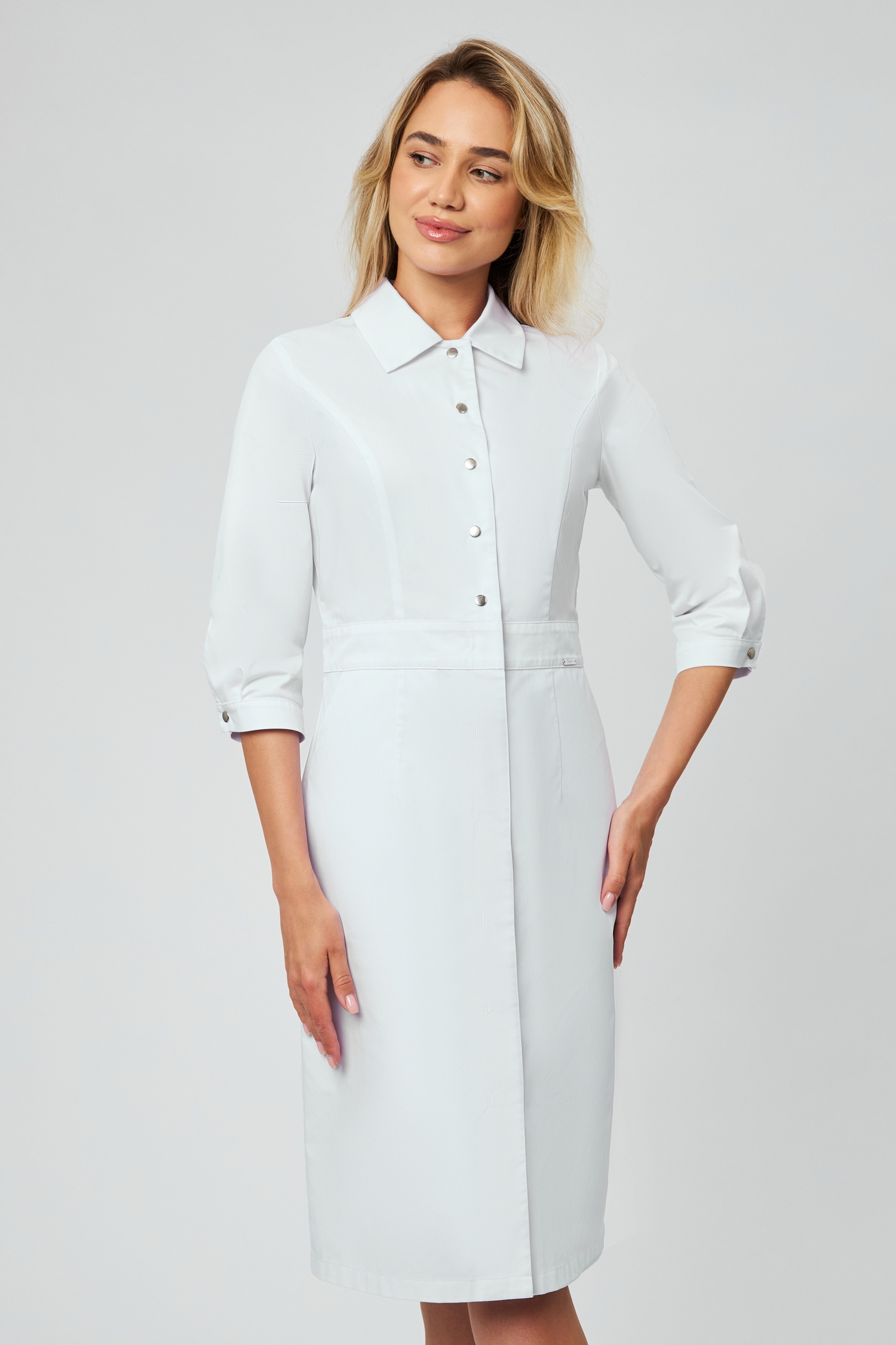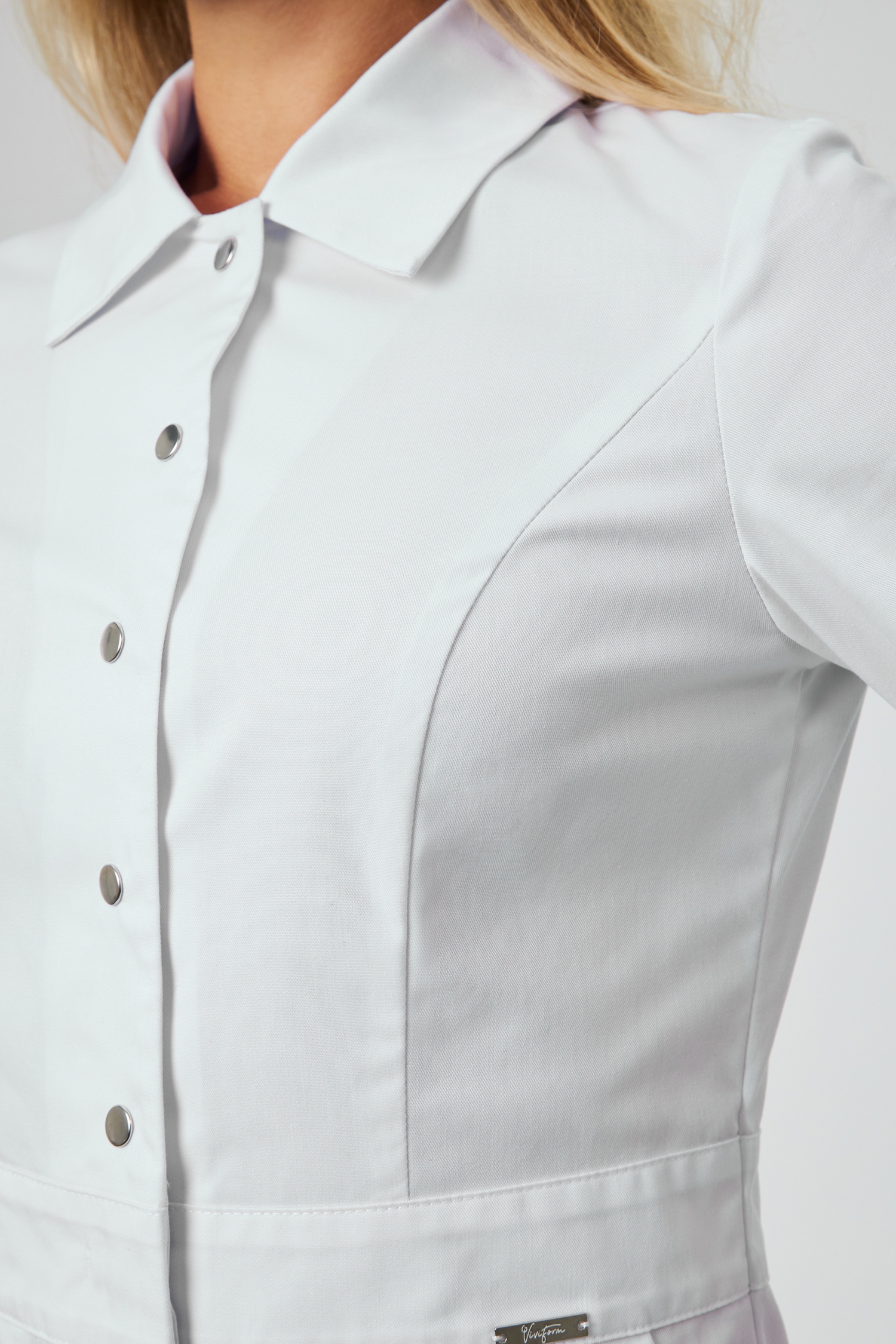 Элегантный медицинский халат от бренда Viviform - одна из тех моделей, которая надолго останется в сердце и станет любимым элементом гардероба. Женственный полуприлегающий силуэт с длиной до середины колена подчеркивает фигуру, при этом оставляя свободу движения. Отложной воротник с острыми краями добавляет строгости и элегантности, а центральная застежка на 5 кнопок на лифе и 6 скрытых кнопок на нижней части халата сохраняют целостность и функциональность образа.