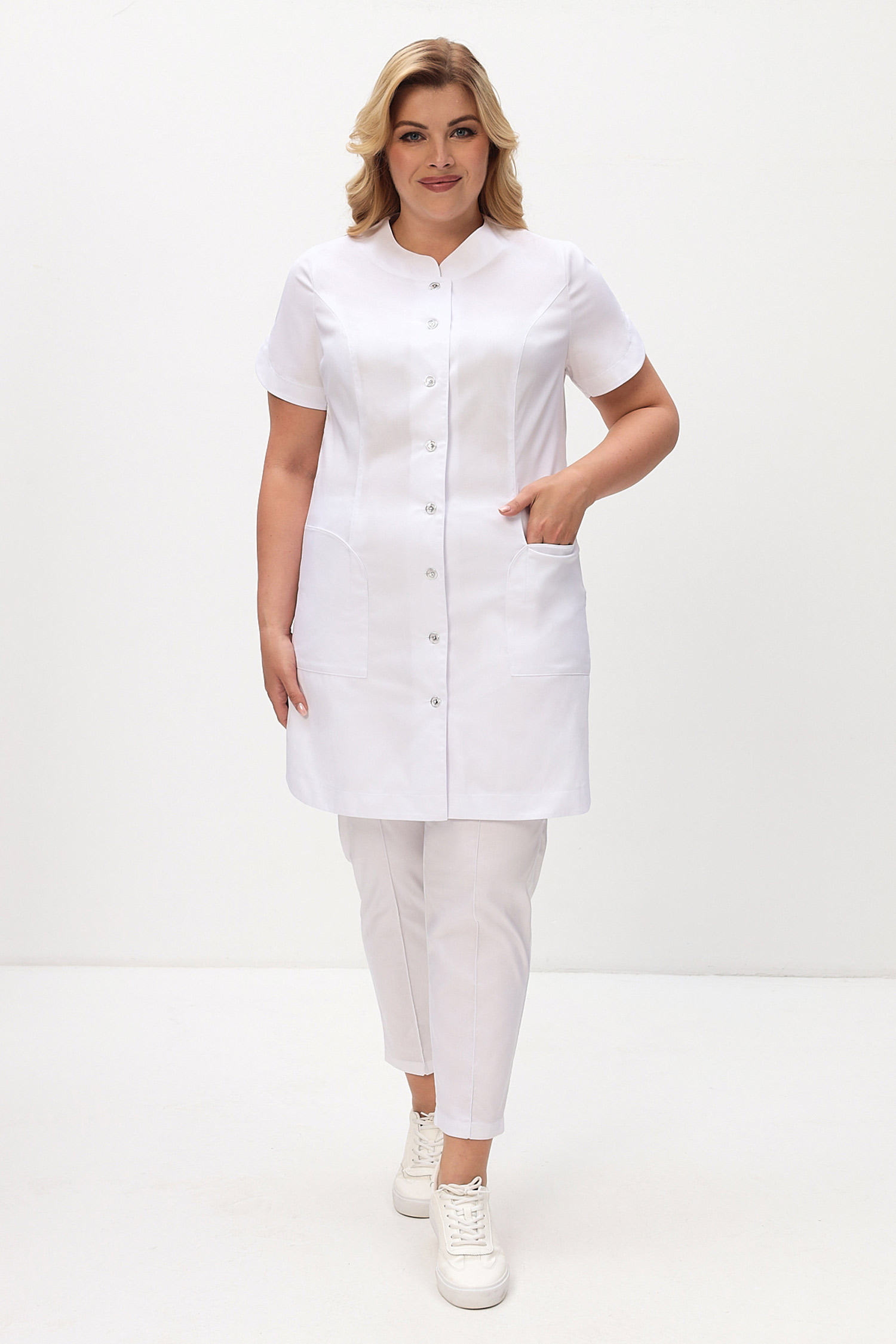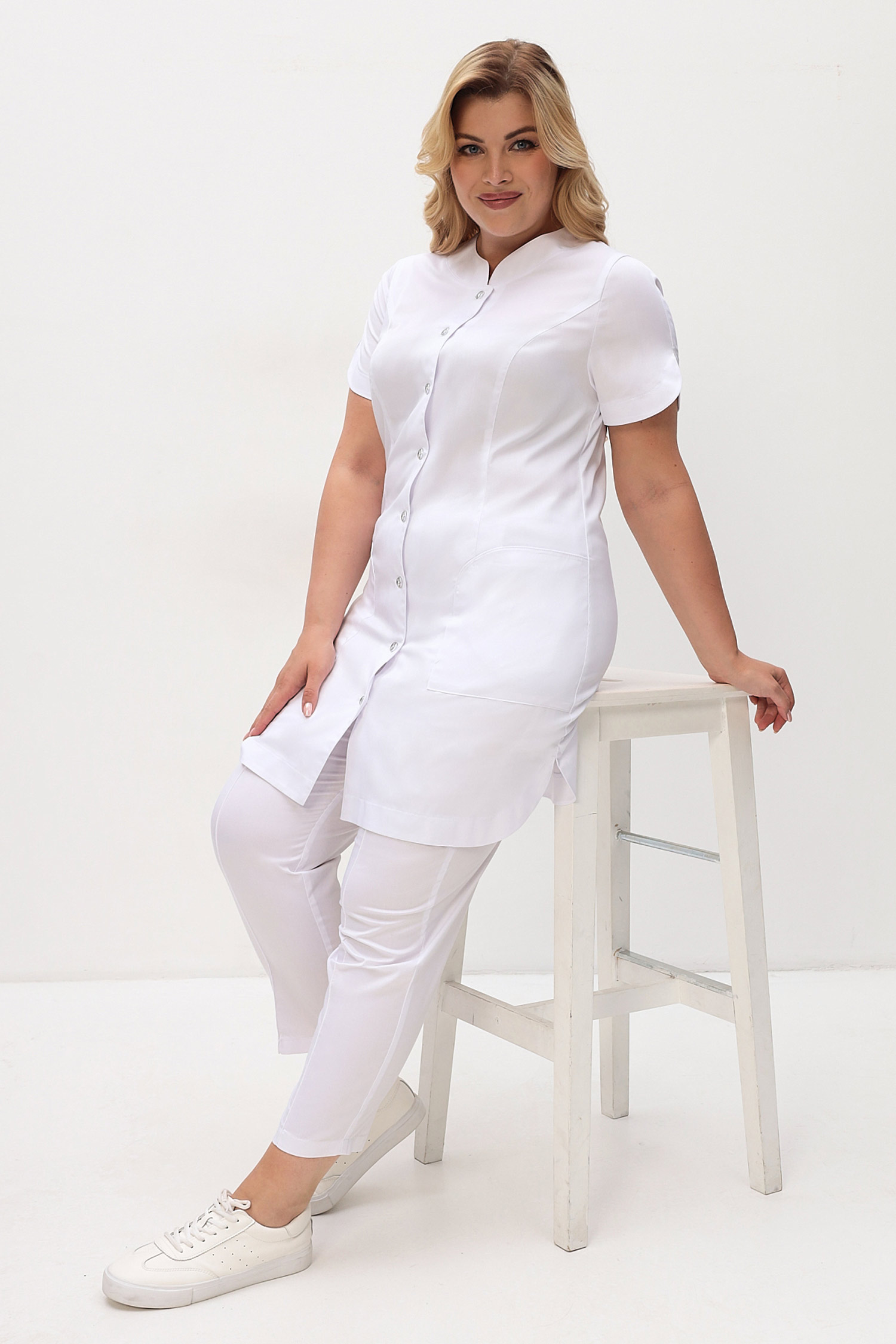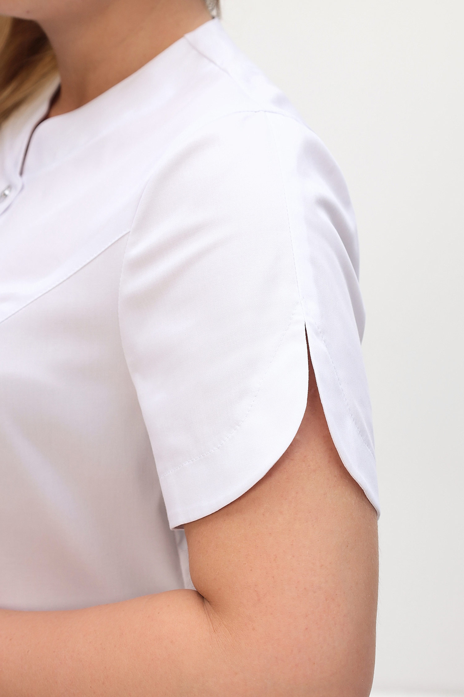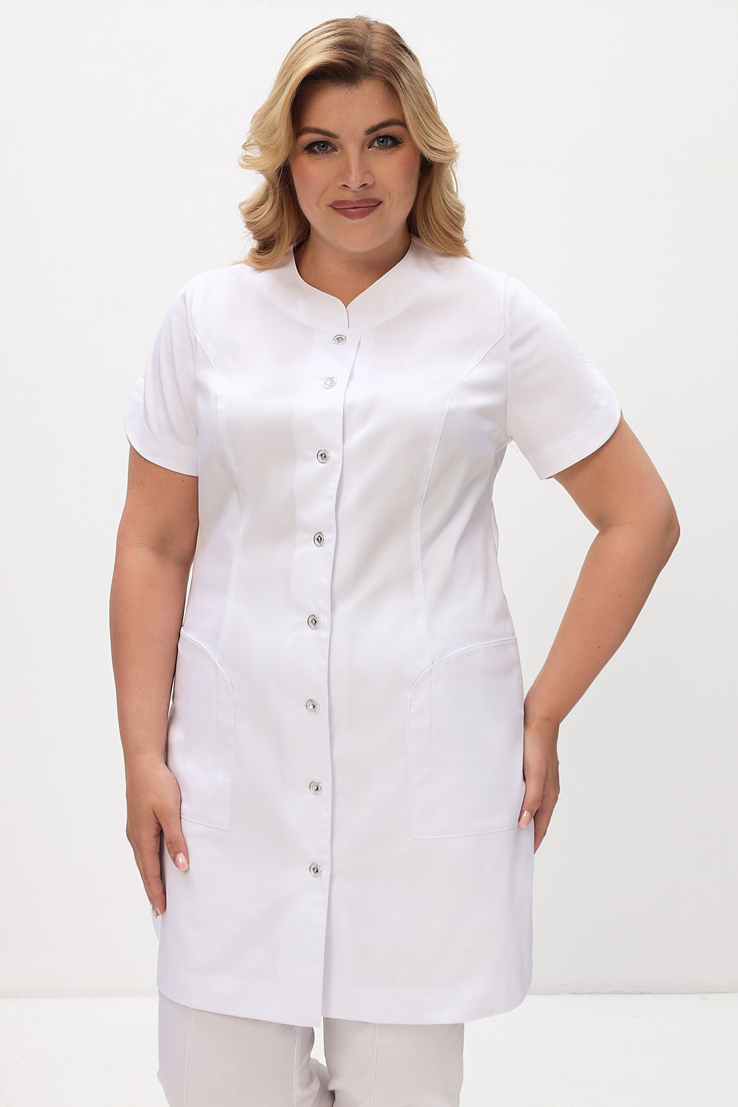 Этот медицинский халат станет отражением вашей женственности, ведь в нём так много плавных линий: начиная с области выреза, продолжая карманами и рукавами, и заканчивая фигурной линией низа! Всё, чтобы подчеркнуть мягкость образа!