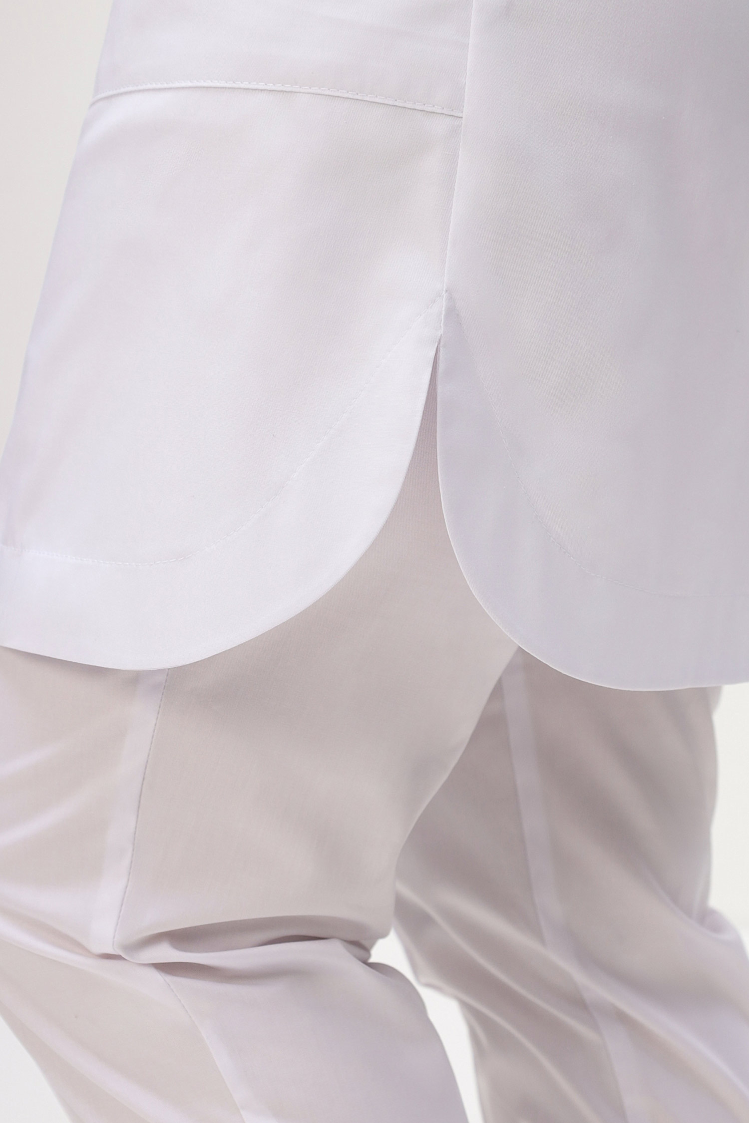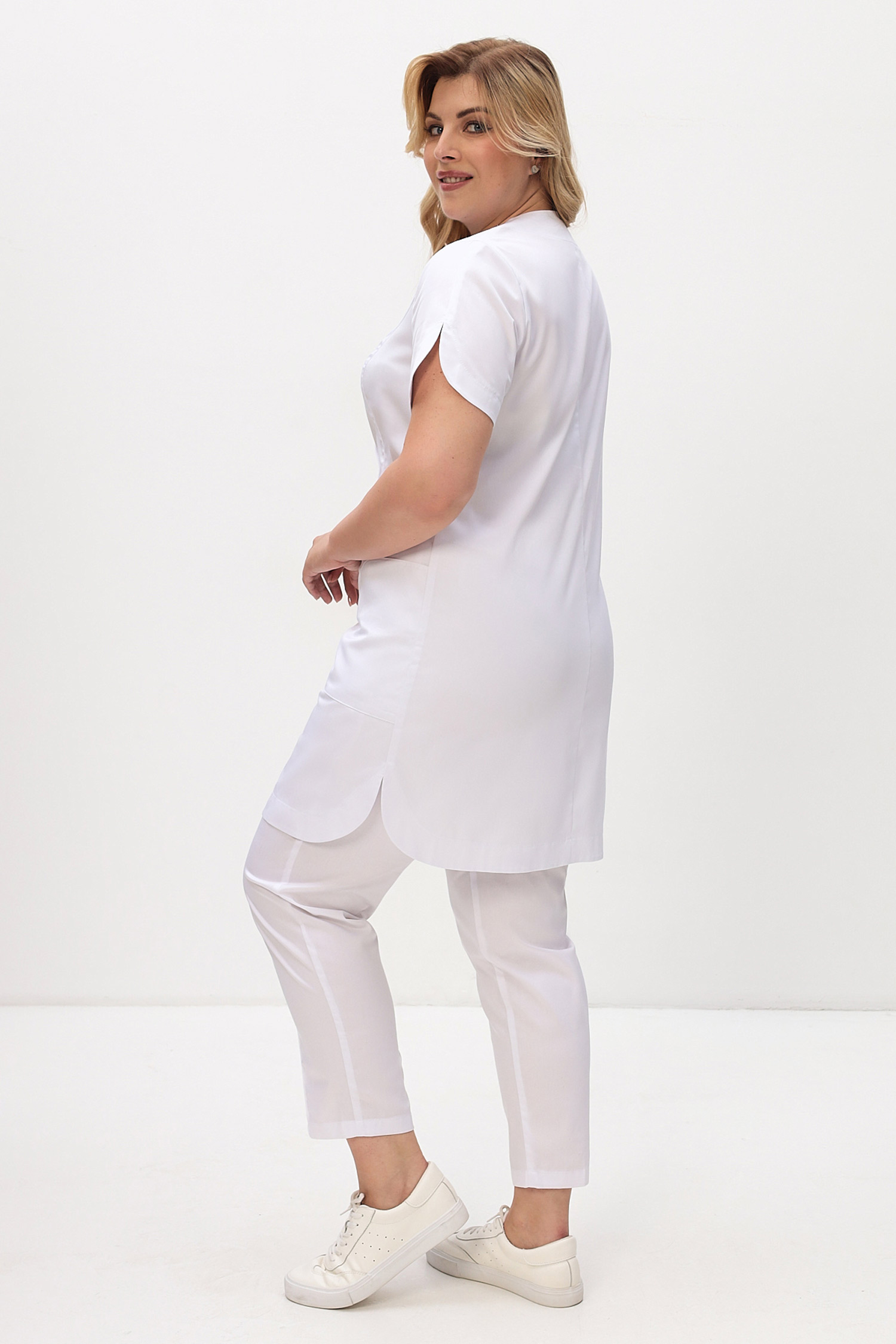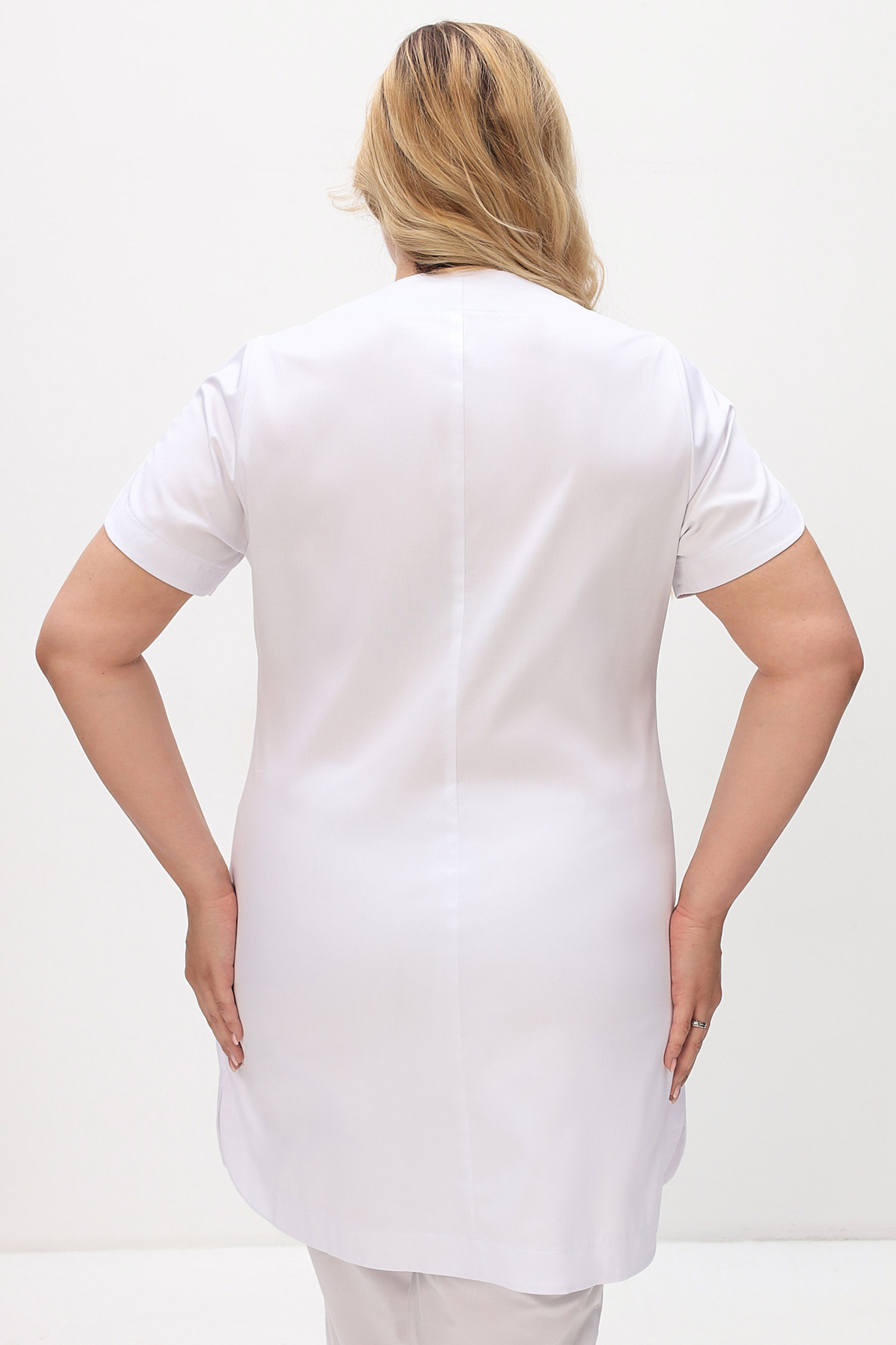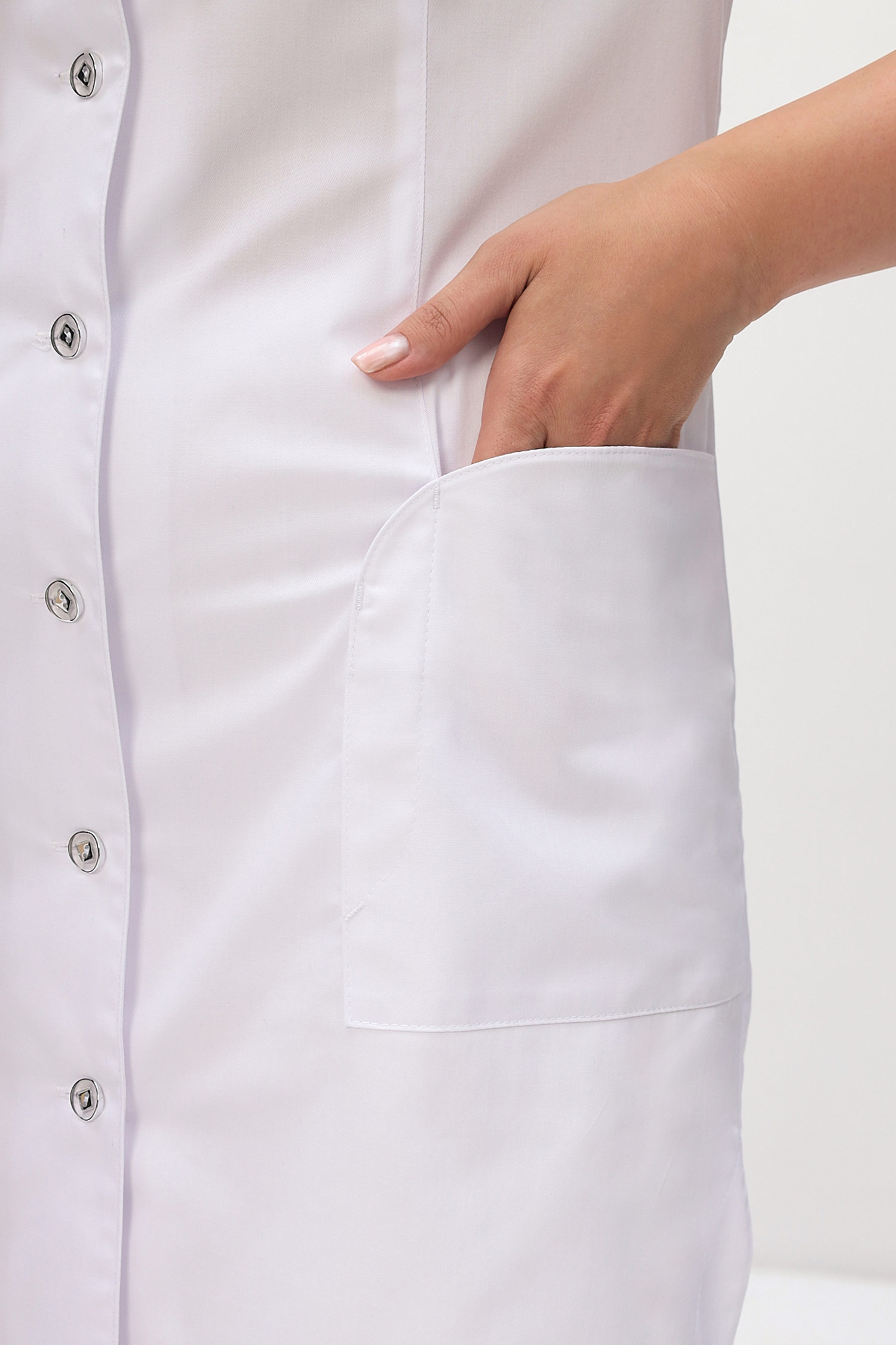 Этот медицинский халат станет отражением вашей женственности, ведь в нём так много плавных линий: начиная с области выреза, продолжая карманами и рукавами, и заканчивая фигурной линией низа! Всё, чтобы подчеркнуть мягкость образа!