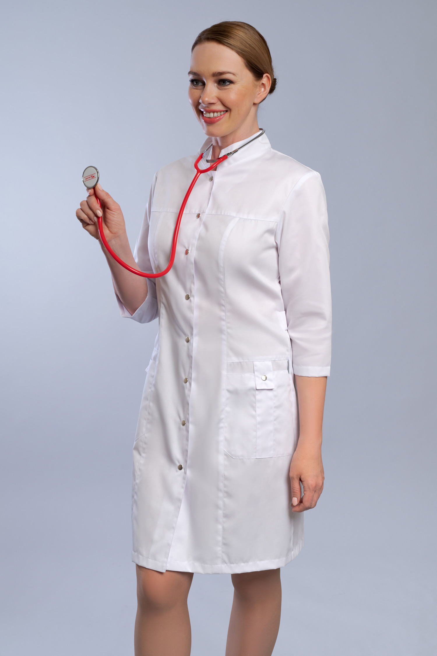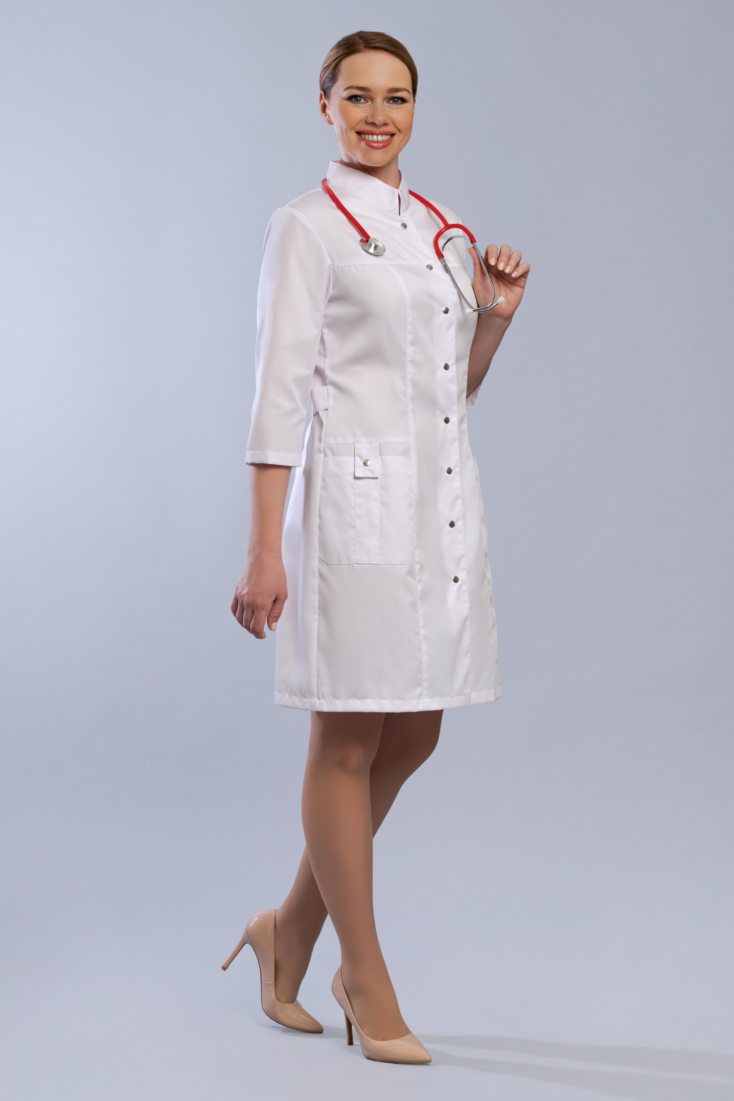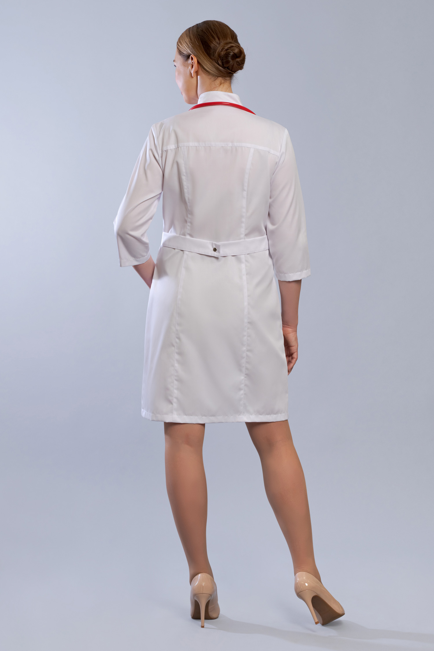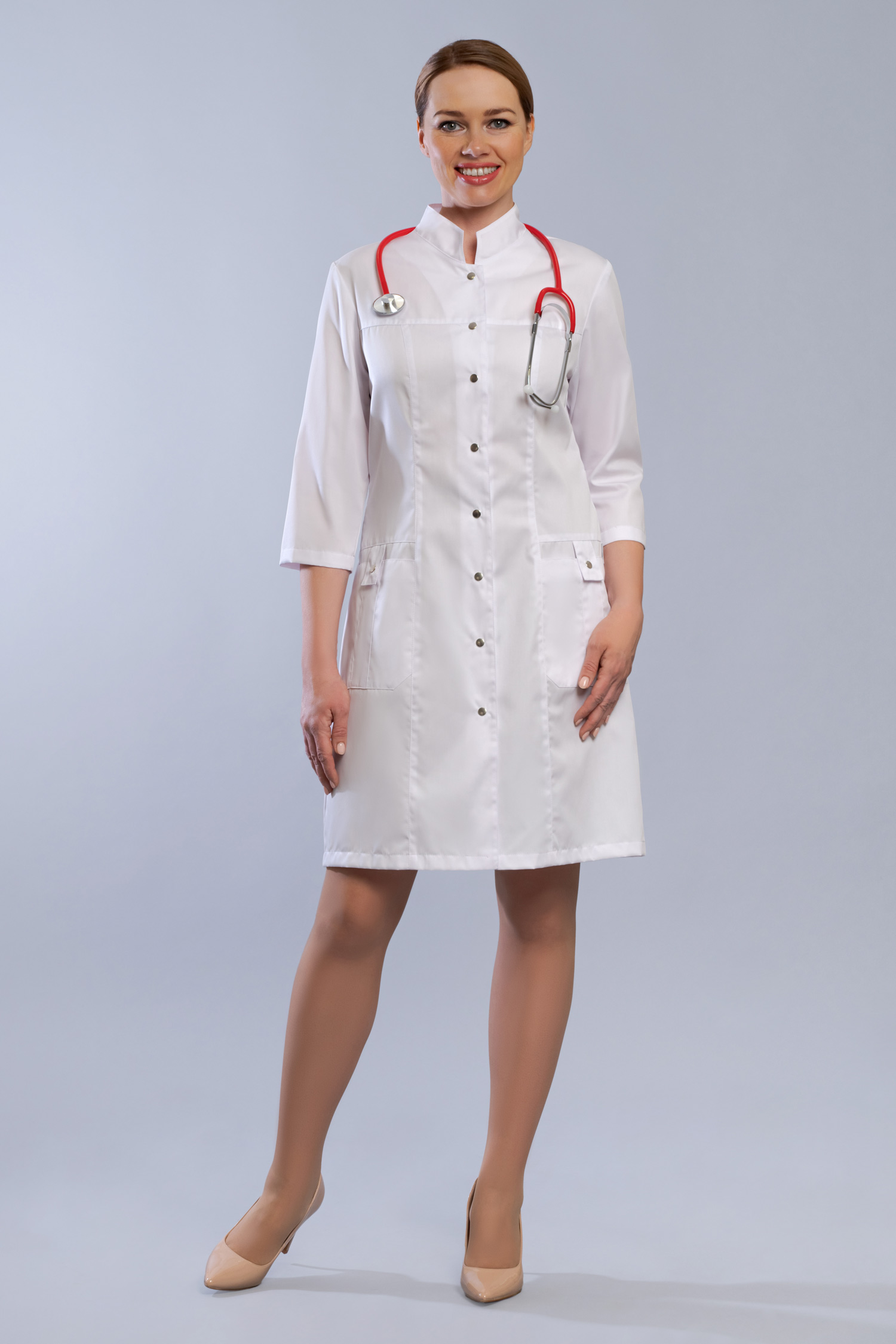 Интернет магазин Медодежда.ру предлагает вашему вниманию неординарную женскую униформу для медицинского персонала. Стильный оригинальный халат изящно приталенного силуэта с изысканными рукавами длинной ¾ и гармоничной застежкой на кнопках со шляпкой. Креативный цветной воротник стойка в цвет оригинально оформленных втачных карманов, которые между рельефами застегиваются нетривиальными патами на миниатюрных кнопках, а грациозные полупояса на спинке, которые застегиваются на кнопки и придают утонченность вашей фигуре. Модель выполняется до 60 размера в различной цветовой гамме, что позволит вам выбрать медицинский халат, который подойдет вам по вкусу.