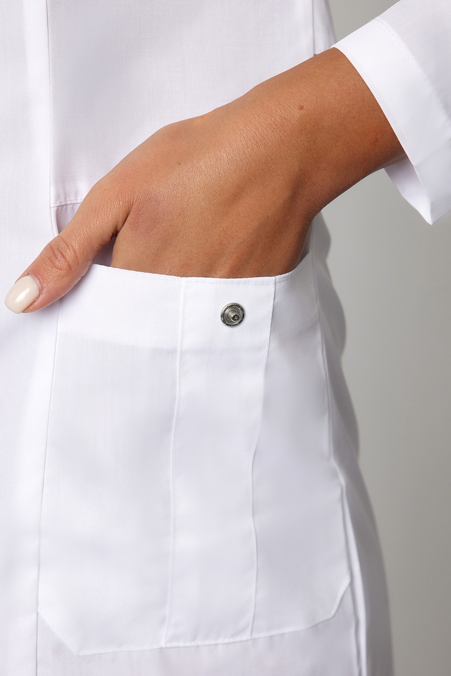 Изюминка этой модели - горловина с глубоким V-образным вырезом. Треугольные формы придают профессиональному образу строгости. Вырез визуально удлиняет шею, выгодно подчеркивая ключицы. Для удобства в горловине по линии груди есть потайная кнопка.