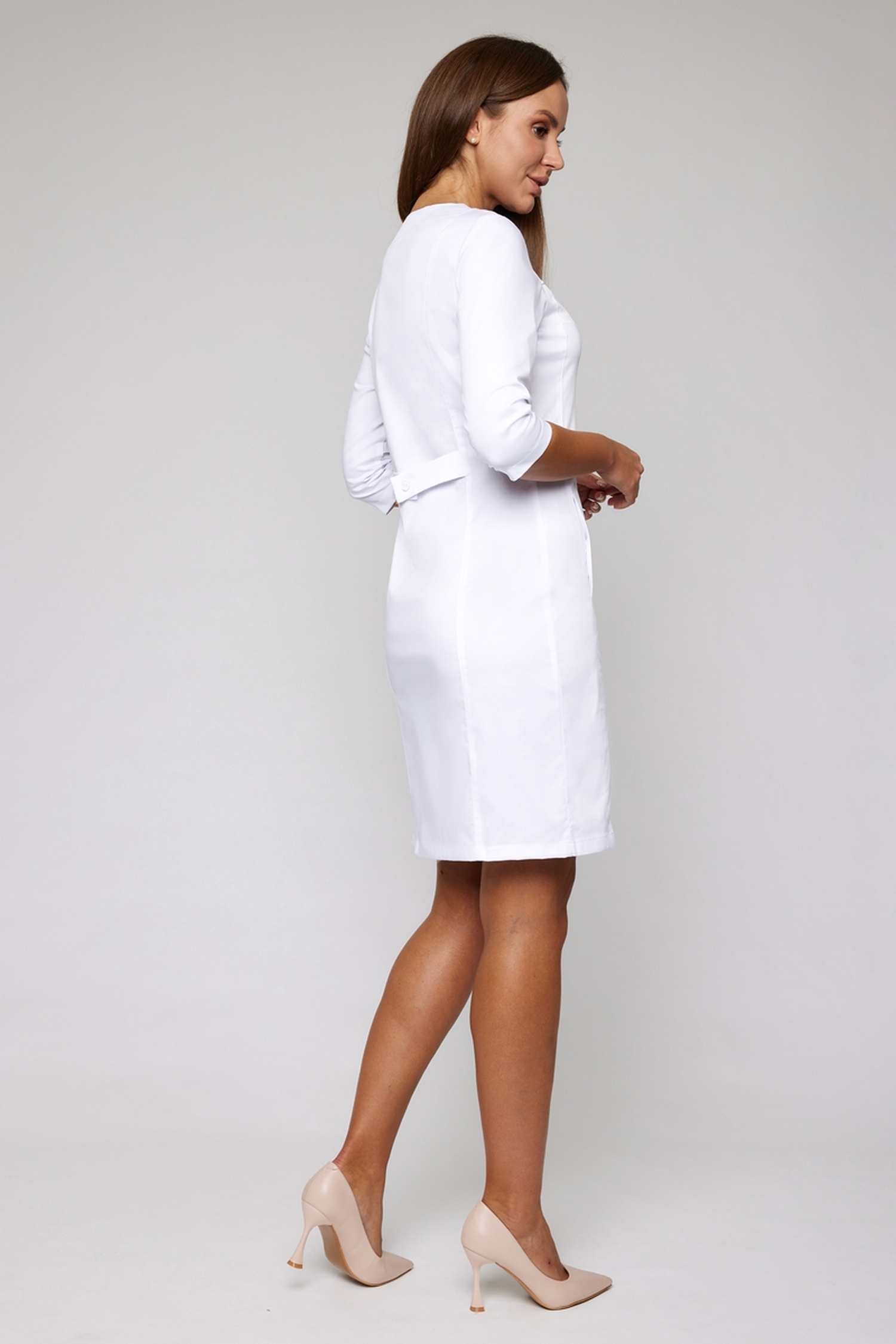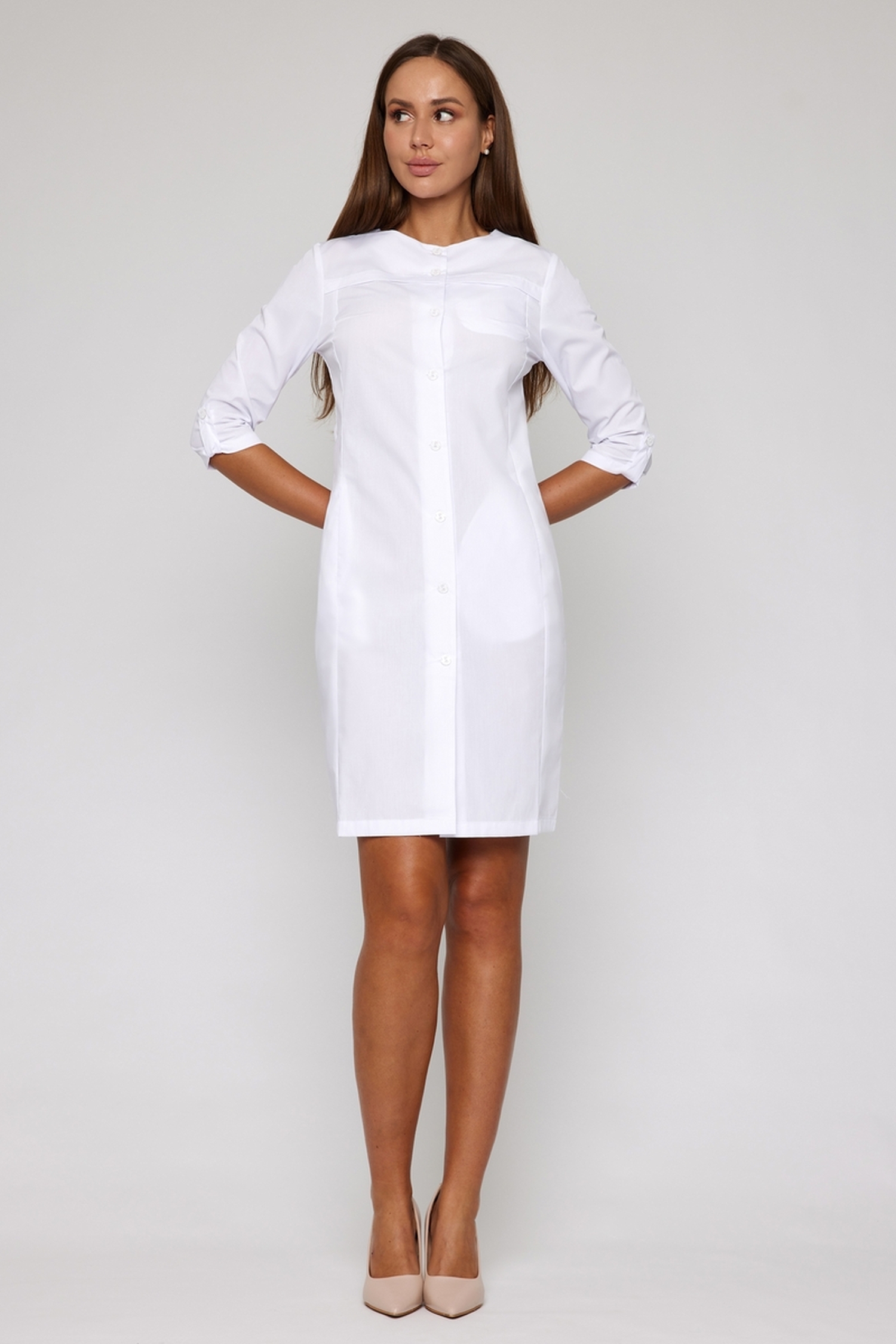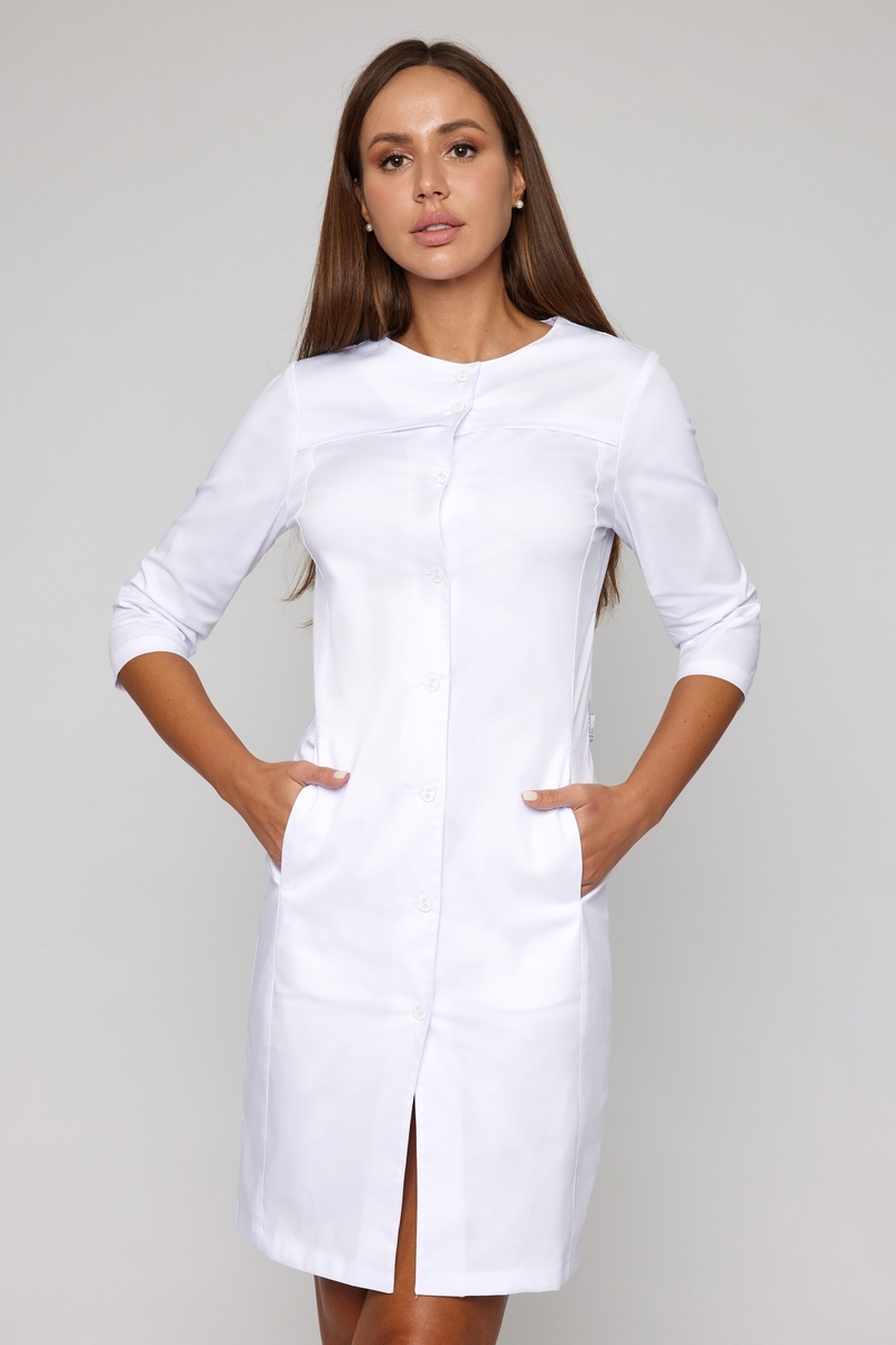 Медицинский халат полуприлегающего силуэта до линии колена. Рукав ¾, удобная застежка на пуговицах. Вертикальные швы оформляют плавные изгибы фигуры. Такой крой визуально делает обладательницу стройнее. Поясок сзади прибавляет утонченности и женственности. Отсутствие классического воротника придает строгость и серьезность образу медицинского работника. Свойства ткани позволяют себя комфортно чувствовать в халате длительное время. В такой одежде Вы будете выглядеть неотразимо! Модель выпускается до 62 размера.