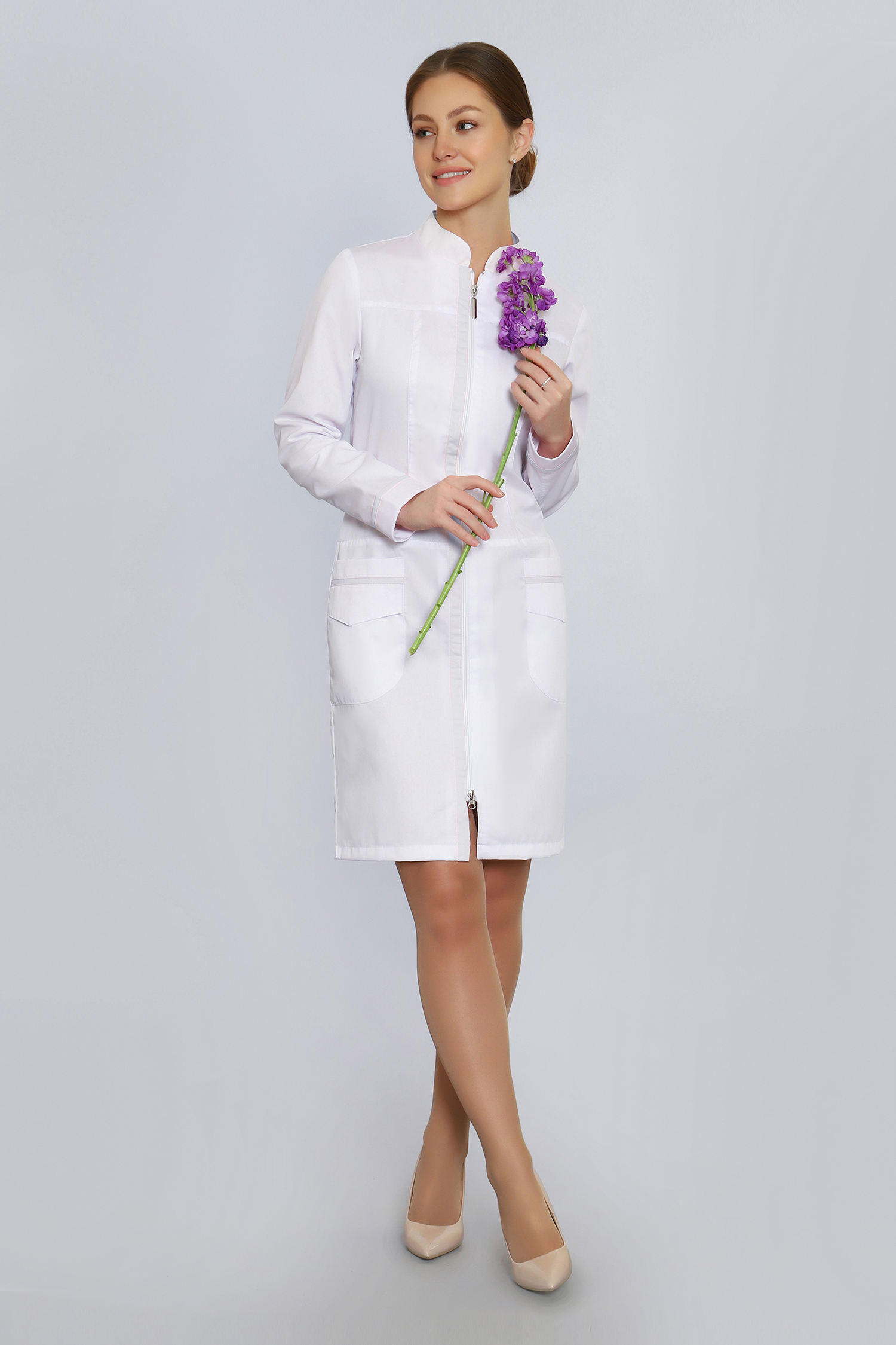 В нашем магазине Медодежда.ру вы можете заказать медицинскую одежду на любой вкус. Один из примеров – халат с застежкой-молнией. Строгий стиль, разбавленный вставками пастельных или ярких оттенков, полуприлегающий силуэт и длина чуть выше колена - залог комфортной работы и всегда отличного настроения. Аккуратная стойка придает образу элегантности и утонченности. Поясок, который застегивается сзади на кнопку, плавно проходит по линии талии, выгодно ее подчеркивая. Халат украшен цветными вставками и декоративной строчкой. Он хорошо смотрится на любой фигуре, начиная с 40 и заканчивая 60 размером. Любая женщина-медработник будет чувствовать себя в нем привлекательной и уверенной в себе.