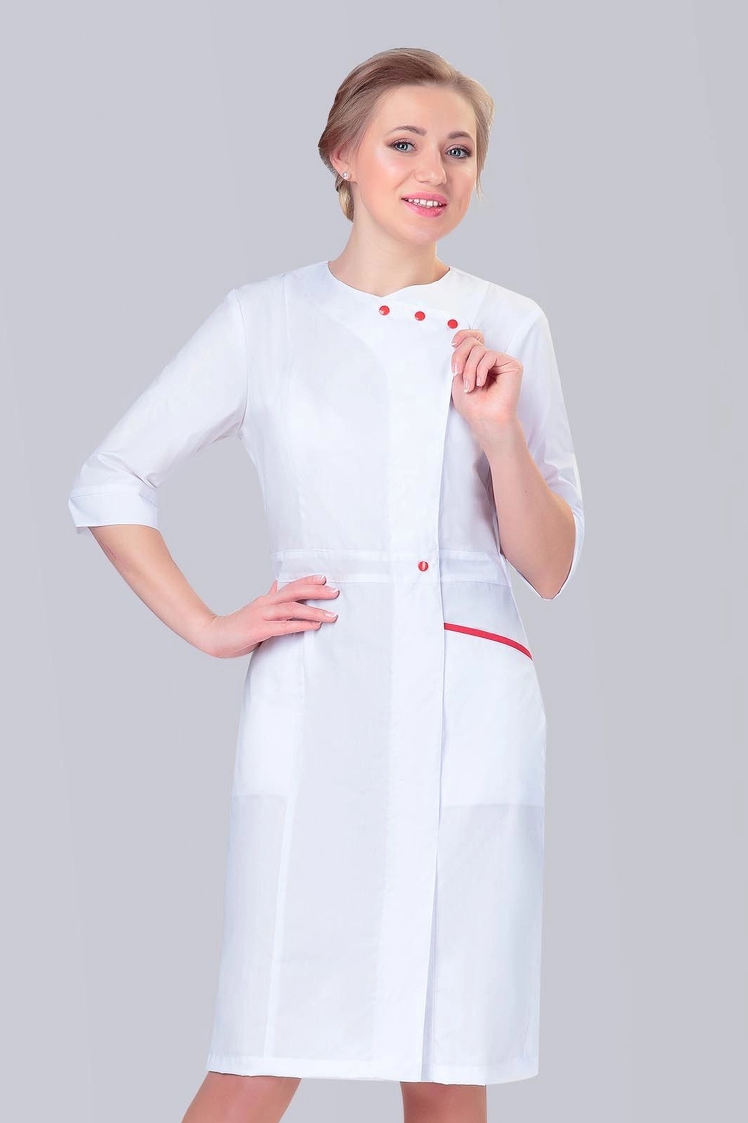 Невозможно остаться незамеченной в ярком и стильном халате арт. 2-78-01-2! Полуприлегающий силуэт, изящные линии, акцентные красные кнопки привлекут внимание к обладательнице этой модели в любом коллективе. В асимметричной застежке спряталось несколько кнопок, карманы оформлены красным кантом, сзади - шлица. Линия талии подчеркнута отрезным поясом.