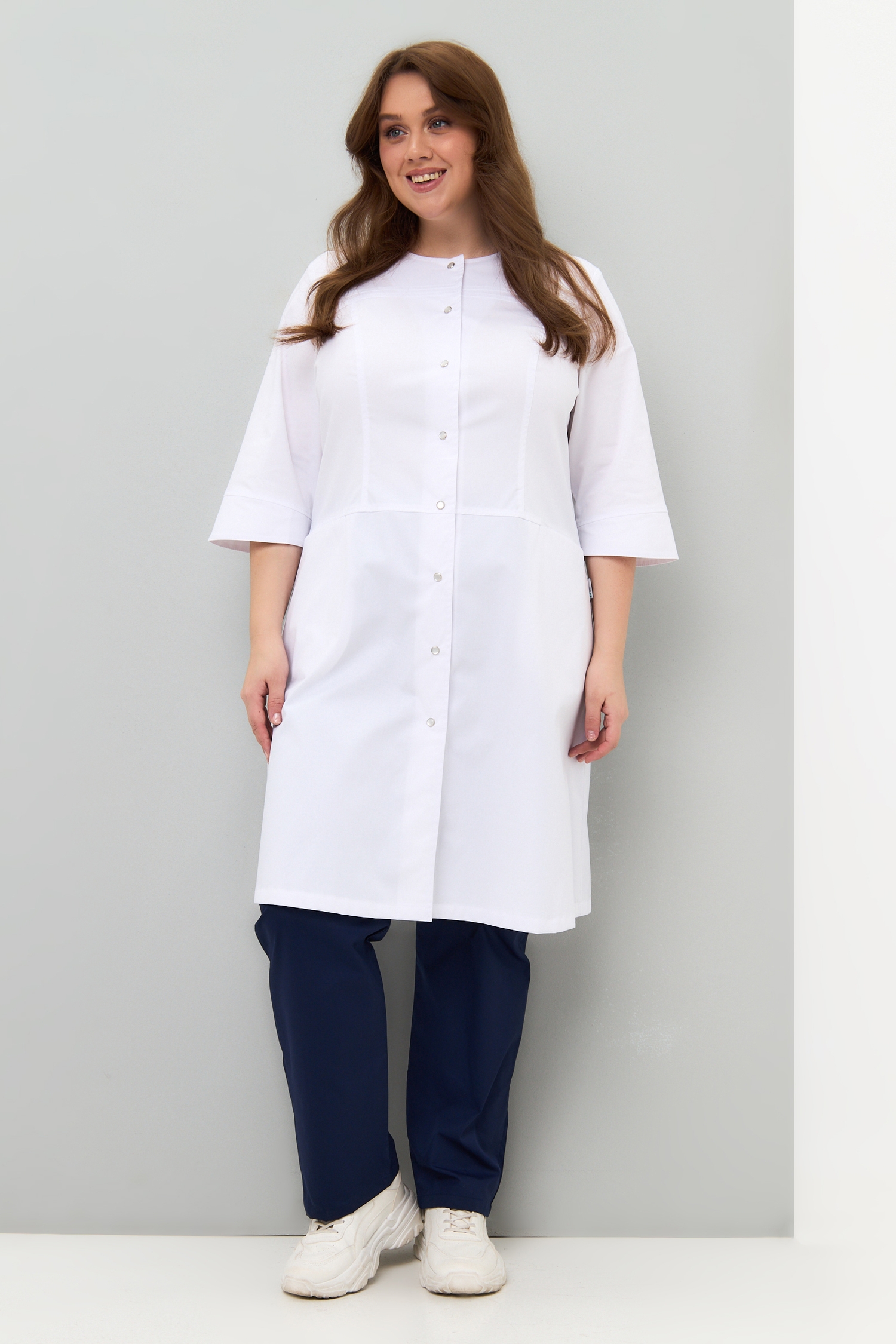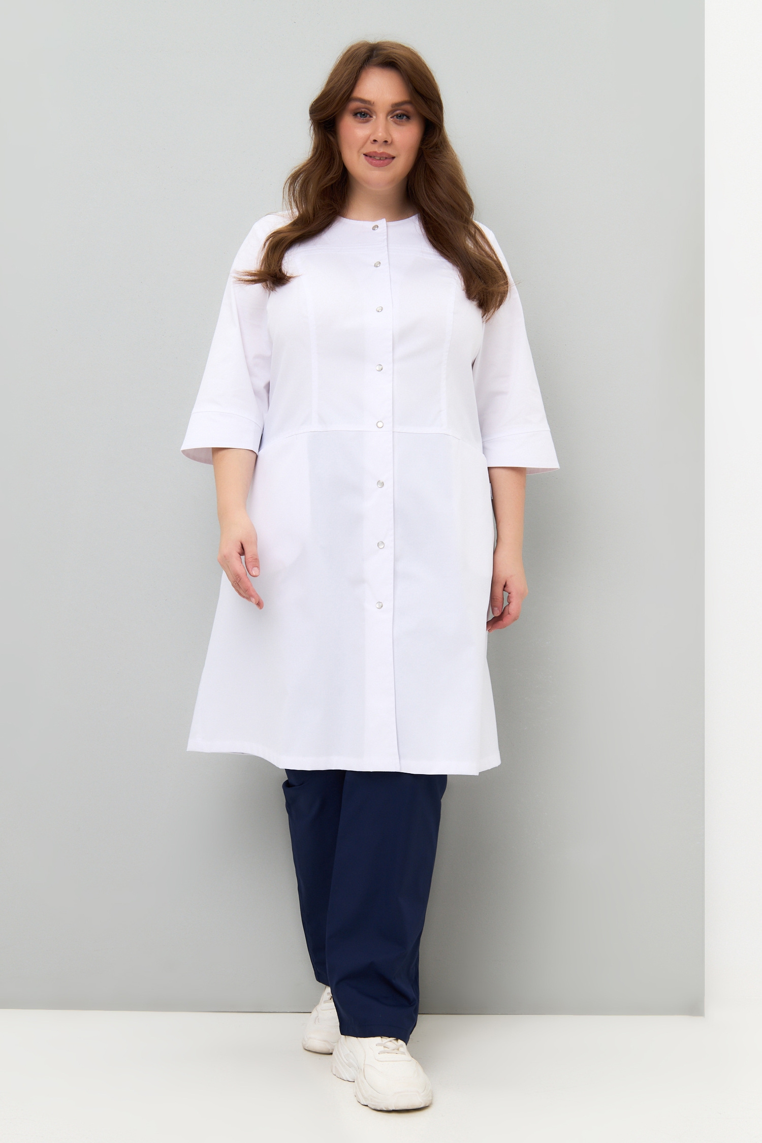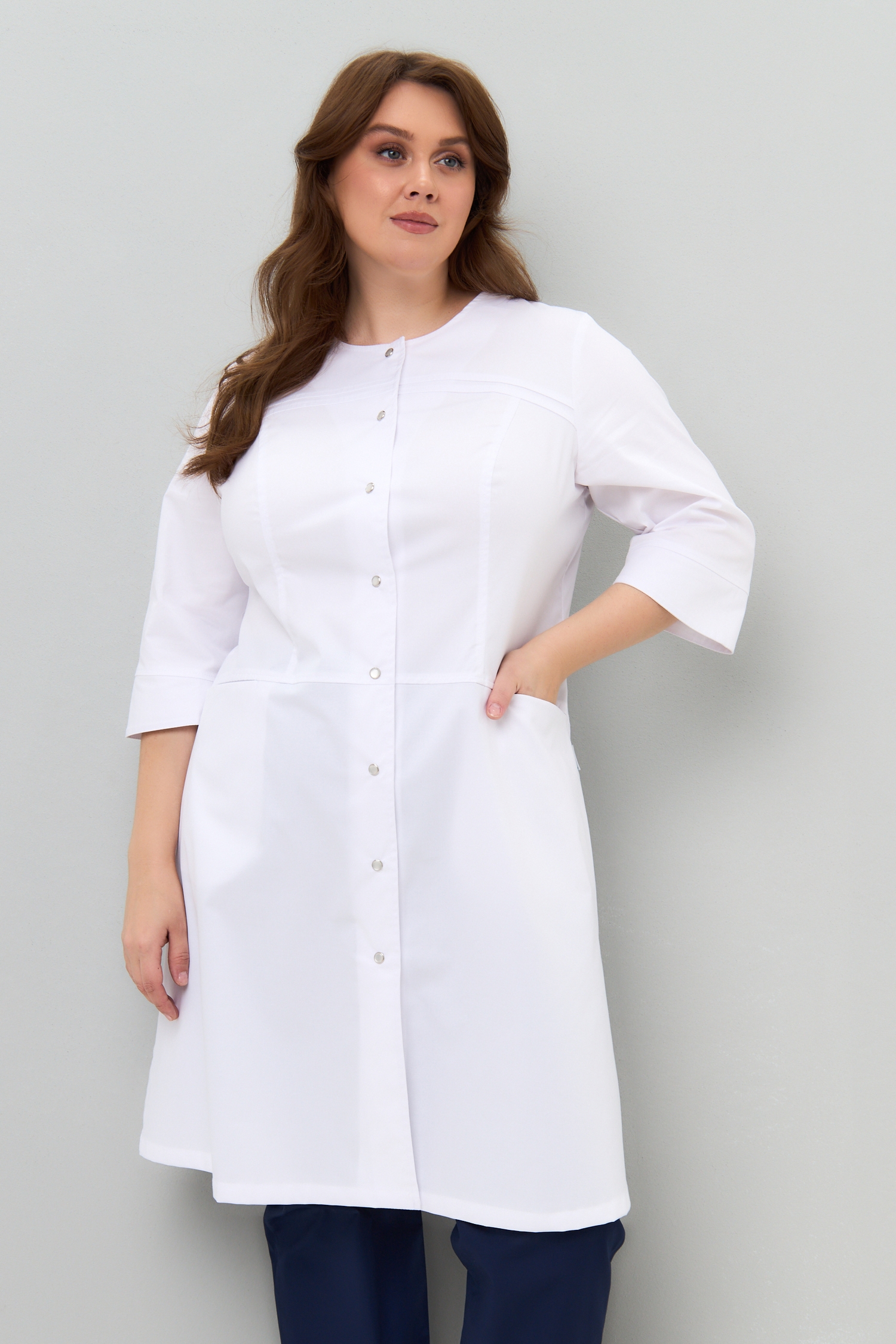 Модель сочетает в себе классический, медицинский стиль с легким, женственным шармом. Полуприлегающий силуэт, чуть расклешенный к низу, создаст профессиональный образ, а округлая линия горловины и перламутровые кнопки на халате придадут мягкость и воздушность.