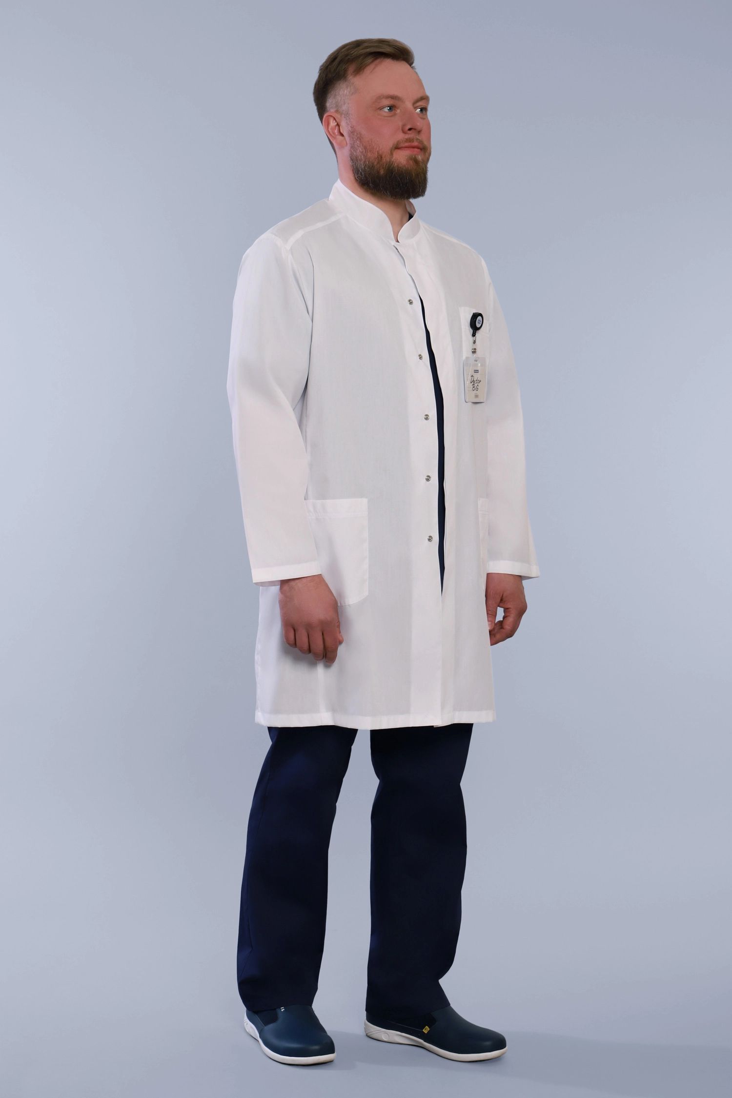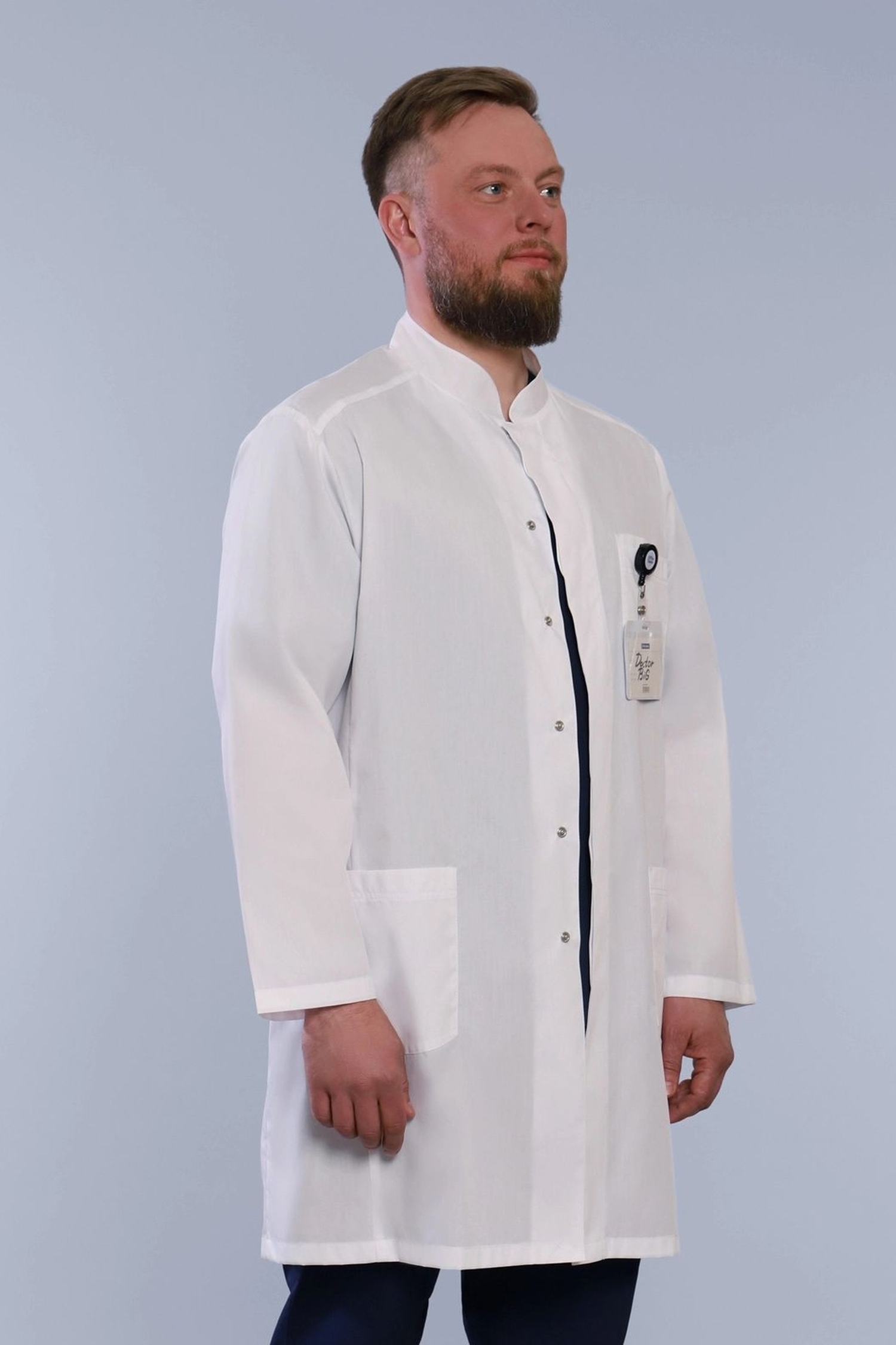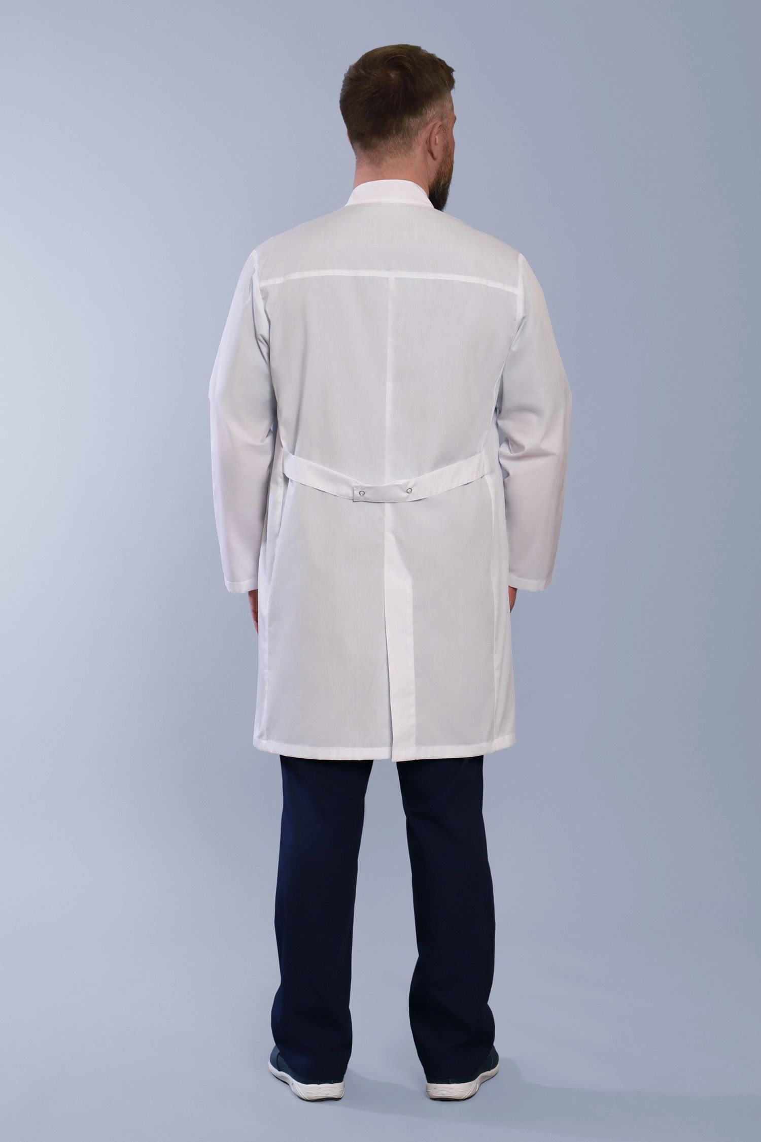 Наш магазин предлагает вашему вниманию интересный вариант медицинской спецодежды для мужского медицинского персонала. Строгий, удлиненный мужской медицинский халат классического прямого силуэта, с роскошными длинными рукавами, практичной застежкой на кнопках, а также изящной шлицей и незаметными полупоясами по спинке халата, которые придадут вашей фигуре мужественность и стройность. Модель дополнена не только утонченным воротником стойкой, но и практичными функциональными накладными карманами, а также удобными незаметными боковыми прорезями для входа в карманы брюк. Подойдет на любую фигуру. Модель выполняется до 60 размера.