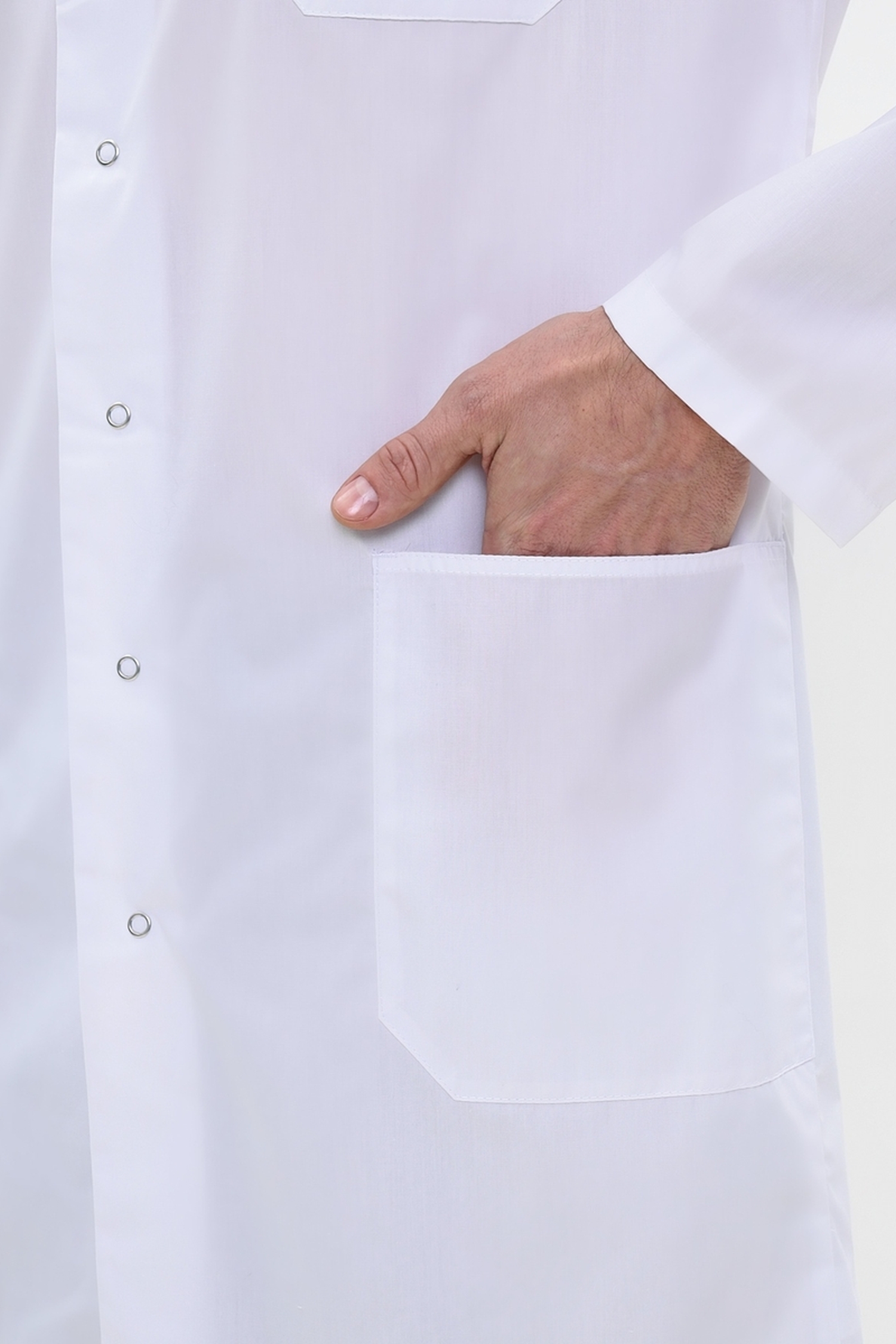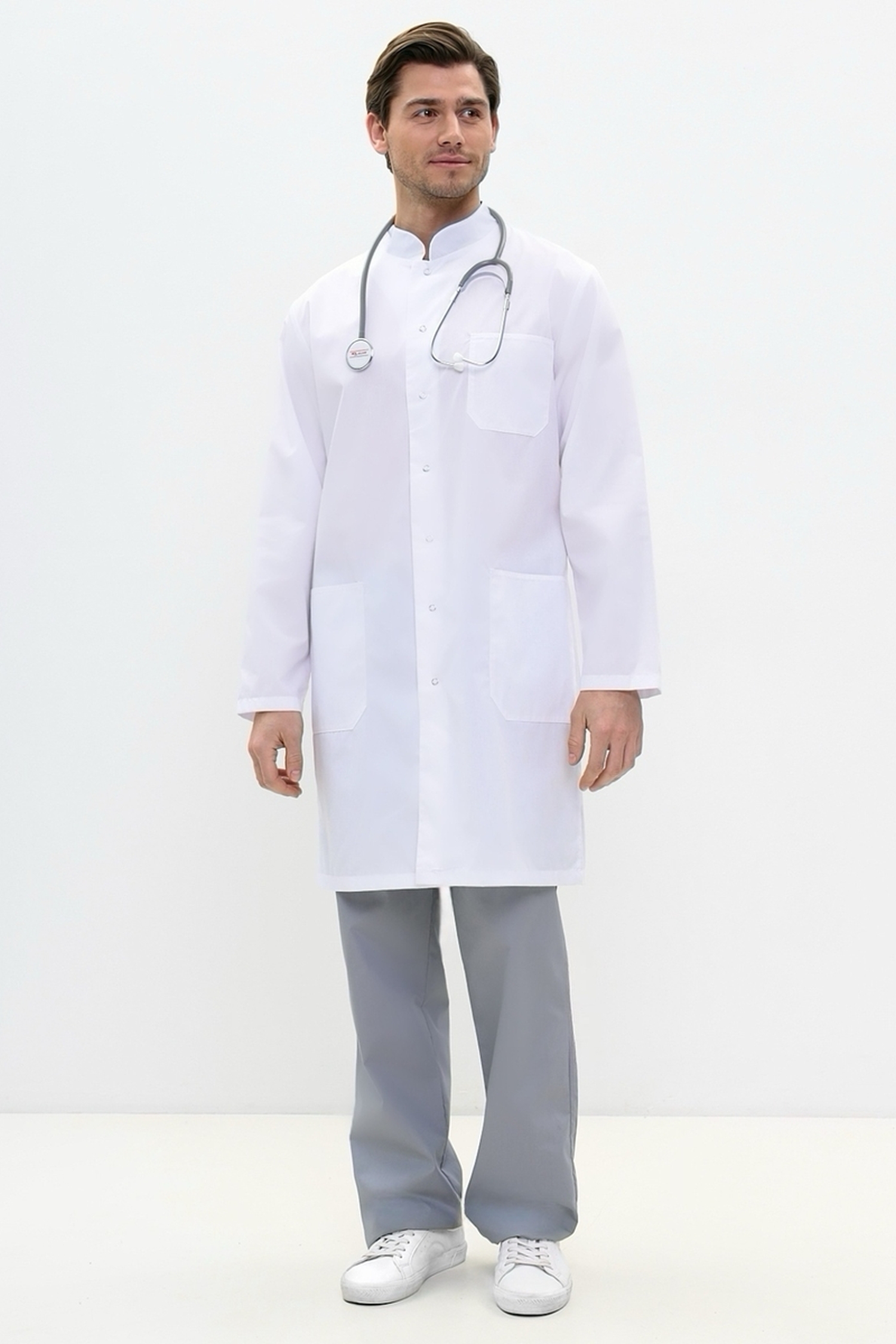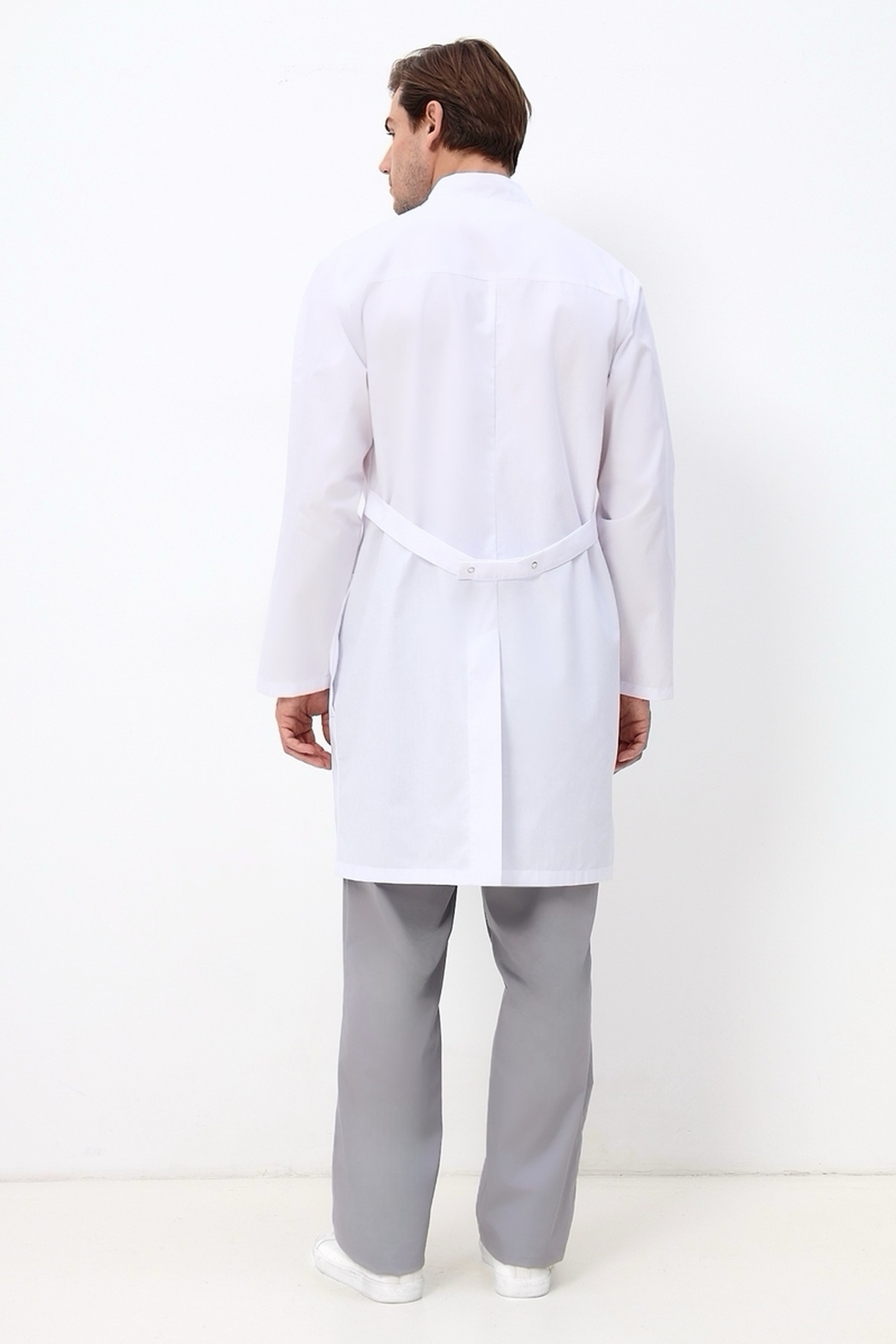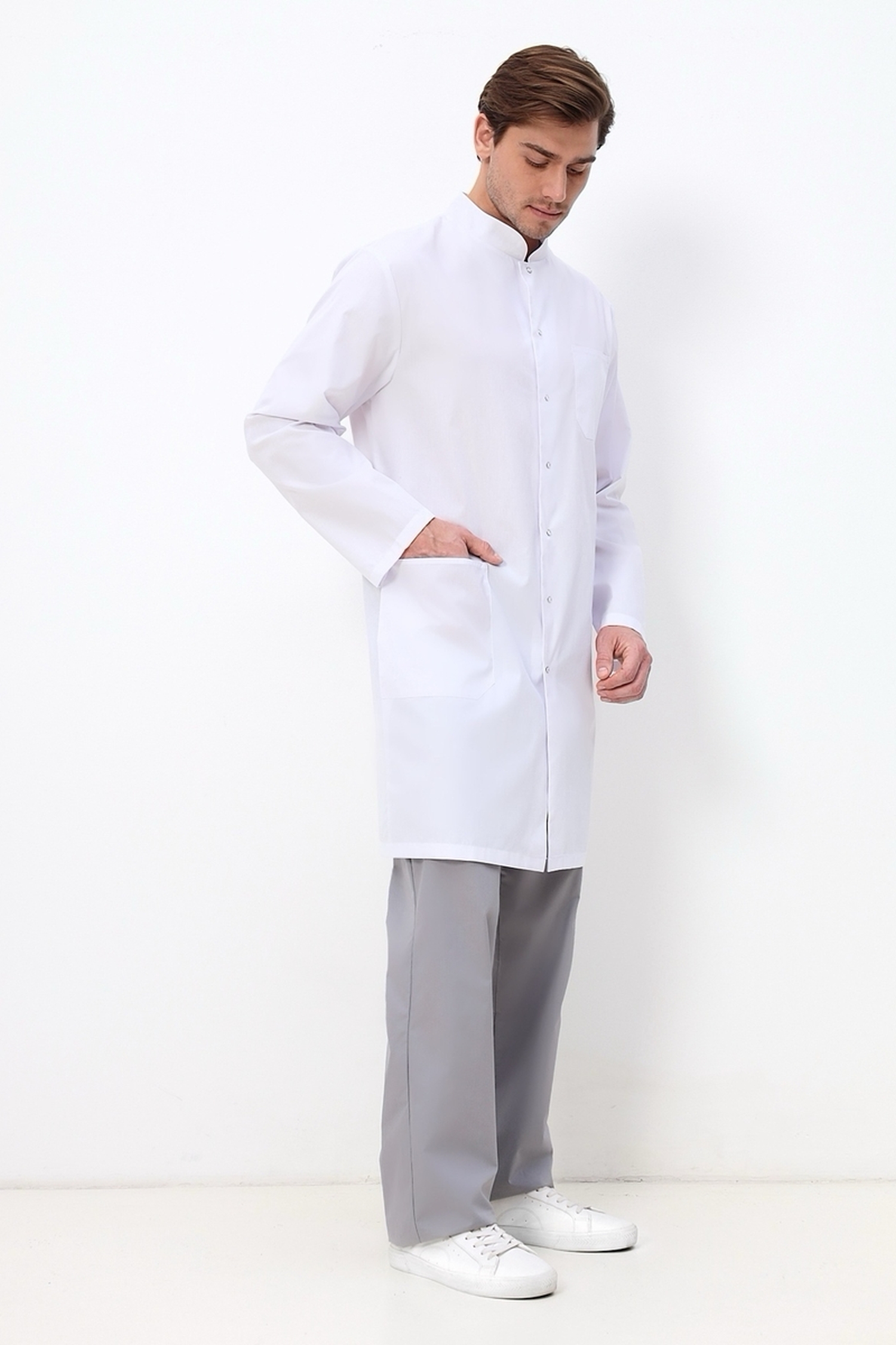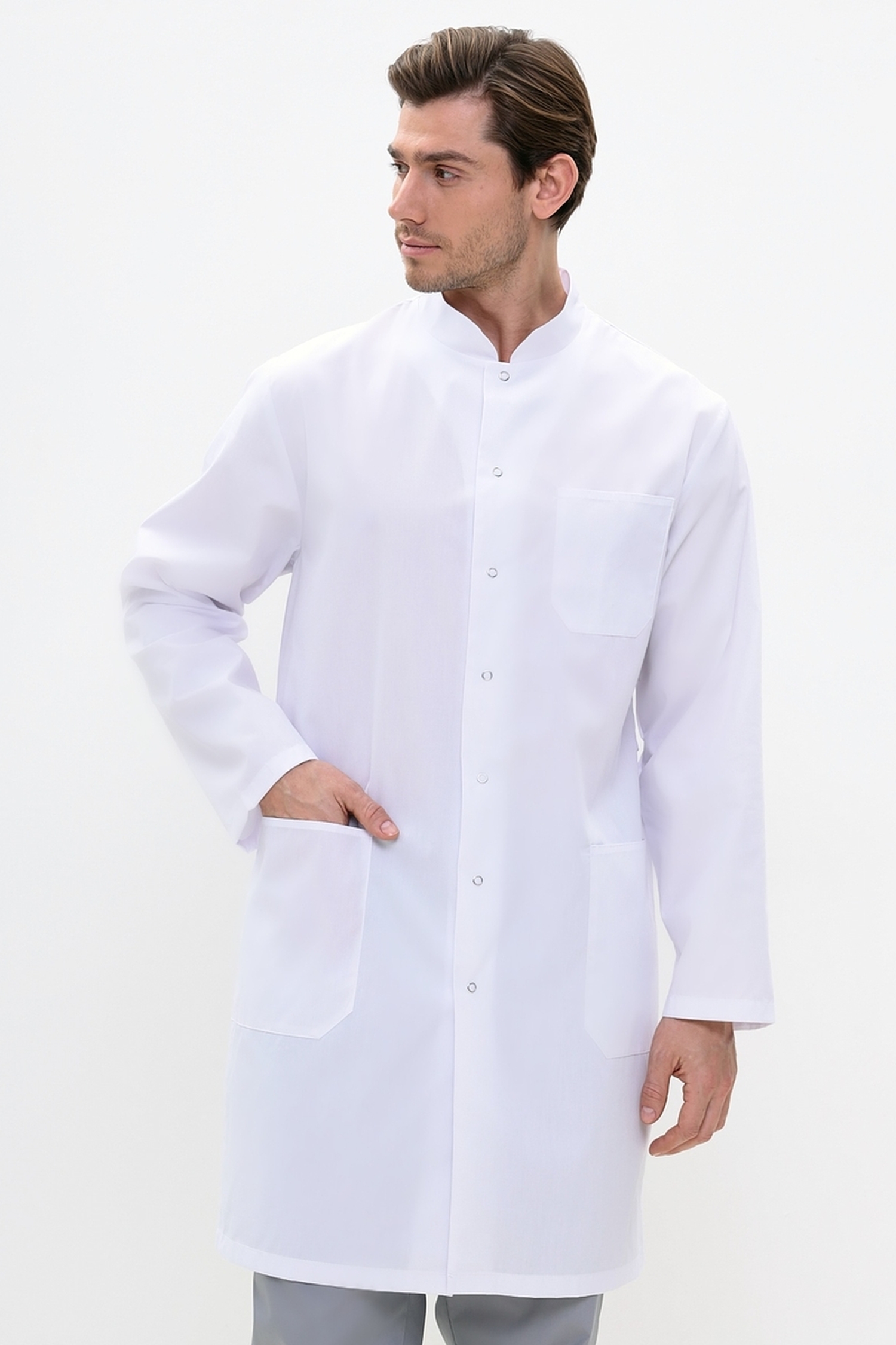 Наш магазин предлагает вашему вниманию интересный вариант медицинской спецодежды для мужского медицинского персонала. Строгий, удлиненный мужской медицинский халат классического прямого силуэта, с роскошными длинными рукавами, практичной застежкой на кнопках, а также изящной шлицей и незаметными полупоясами по спинке халата, которые придадут вашей фигуре мужественность и стройность. Модель дополнена не только утонченным воротником стойкой, но и практичными функциональными накладными карманами, а также удобными незаметными боковыми прорезями для входа в карманы брюк. Подойдет на любую фигуру. Модель выполняется до 60 размера.