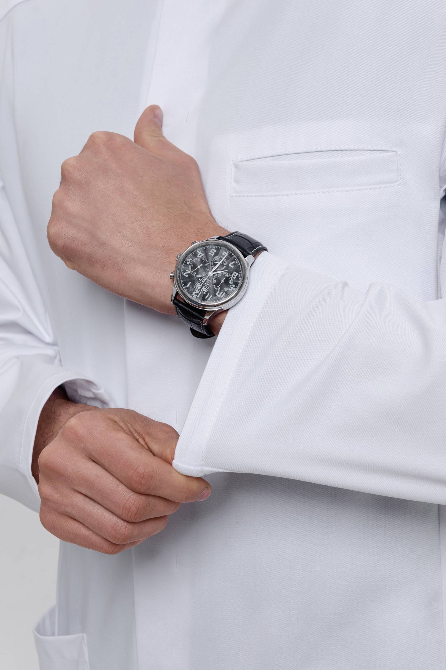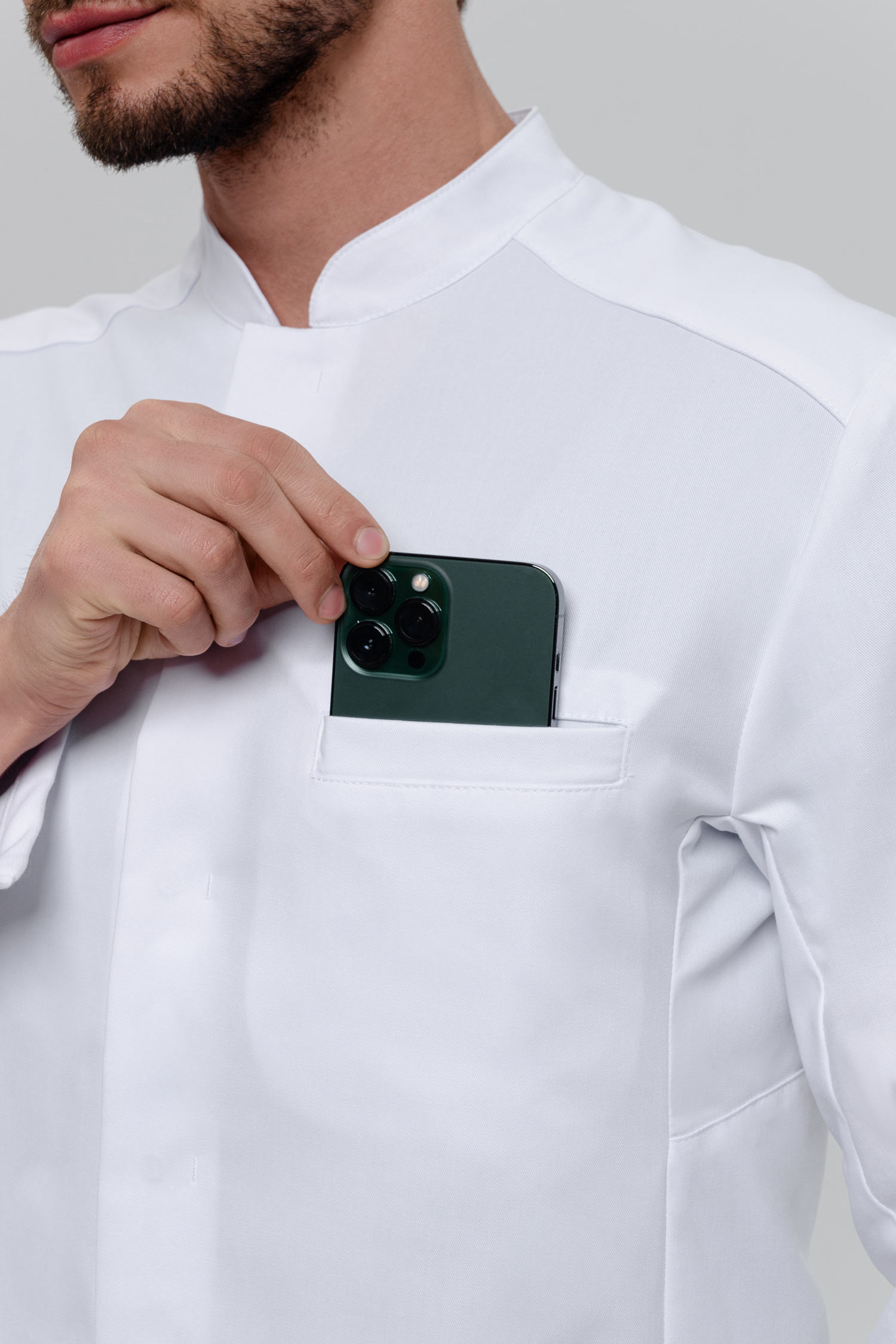 Халат оснащен множеством функциональных карманов. Глубокие накладные карманы не оттягиваются и не топорщатся, а прорезной нагрудный карман с «листочкой» делает образ более стильным.