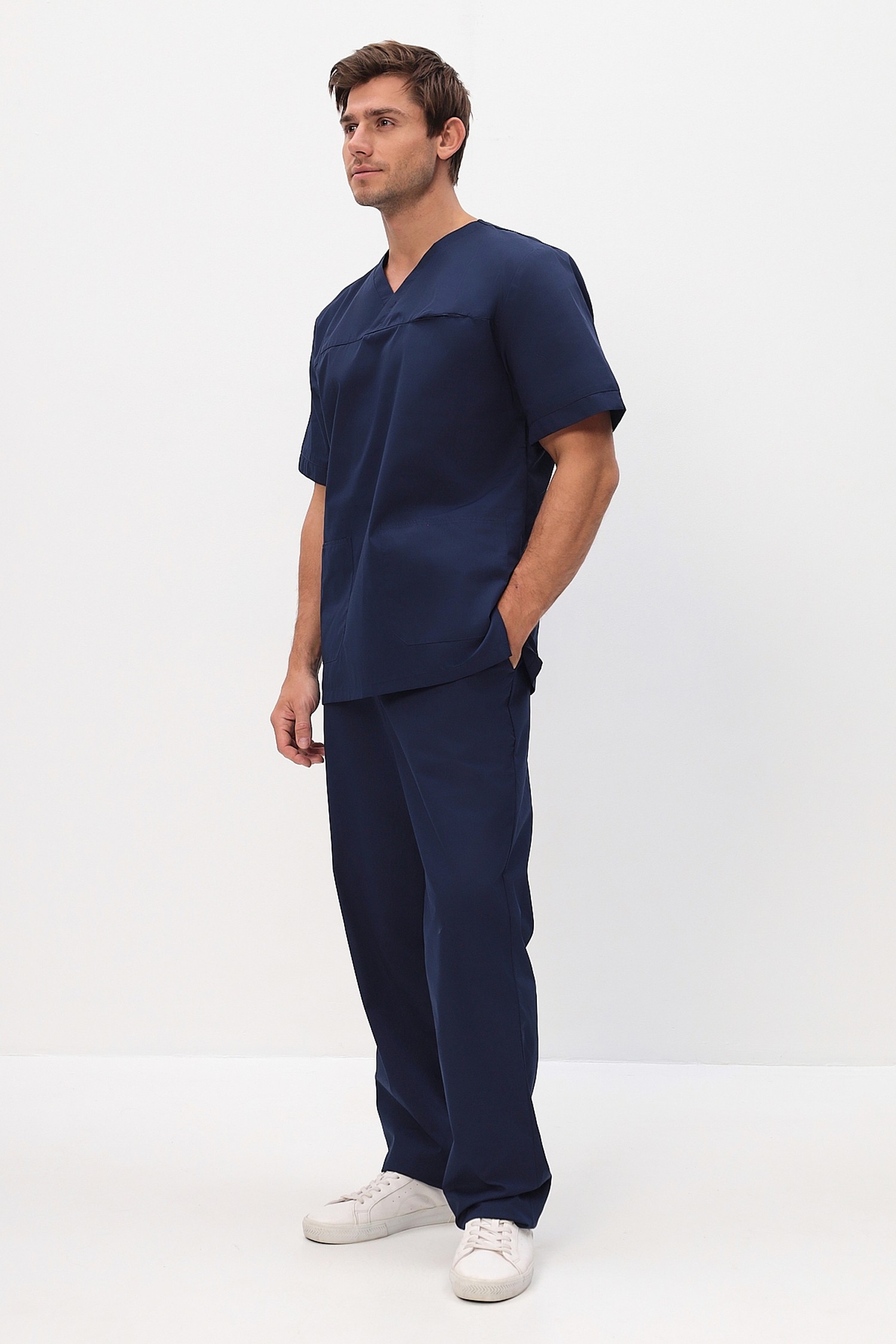 Мужской топ, комфортного покроя, с V- образным вырезом горловины. На полочке расположена кокетка с внутренним карманом. Два удобных накладных кармана внизу. Рукав короткий. Брюки прямого силуэта с боковыми внутренними карманами, Удобный широкий пояс-резинка. Сидят точно по фигуре. Модель выполняется до 66 размера.