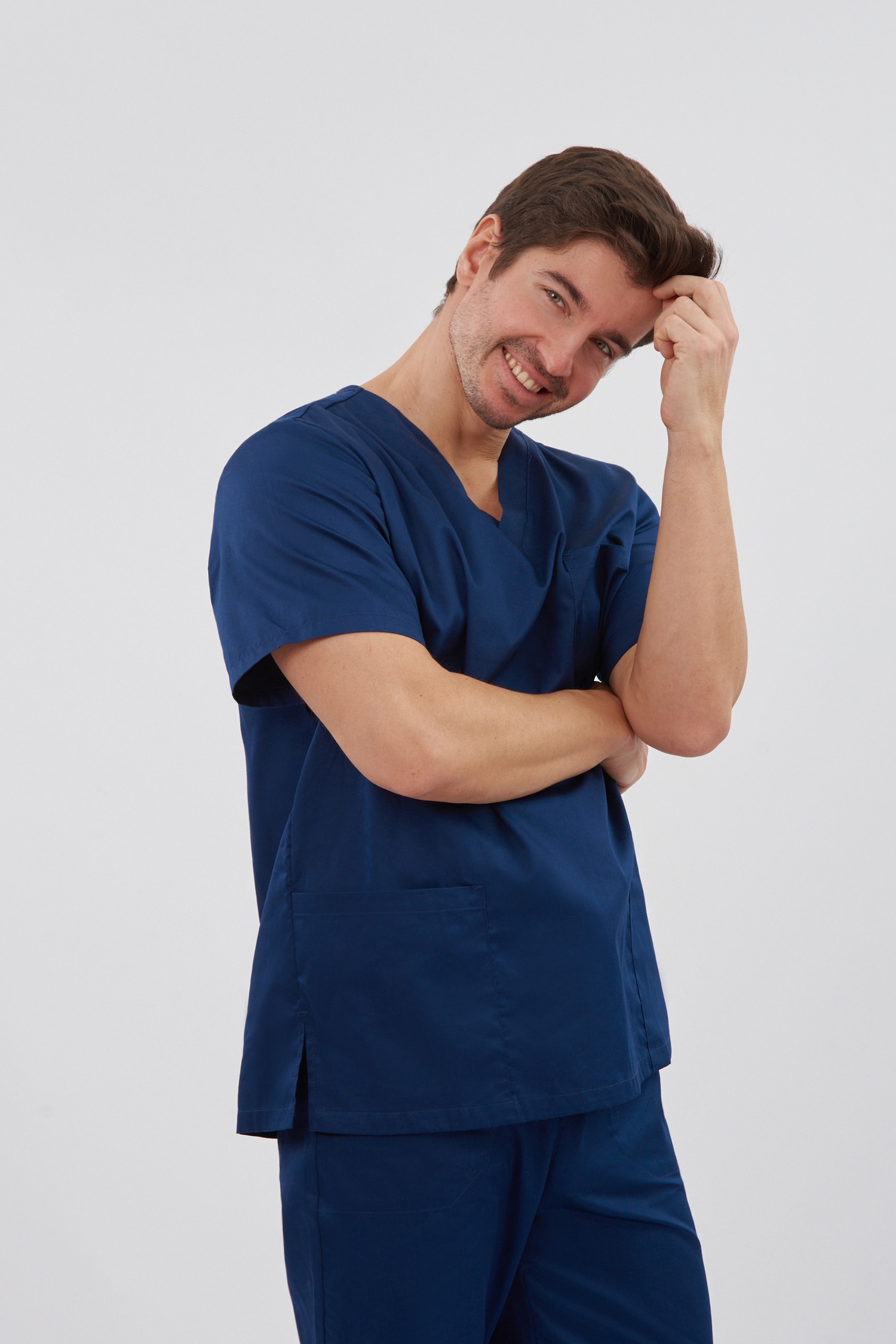 Мужской медицинский костюм прямого силуэта из ткани Cotton Premium сумел вместить все самое необходимое, что нужно каждому медицинскому работнику: от санитара до хирурга.