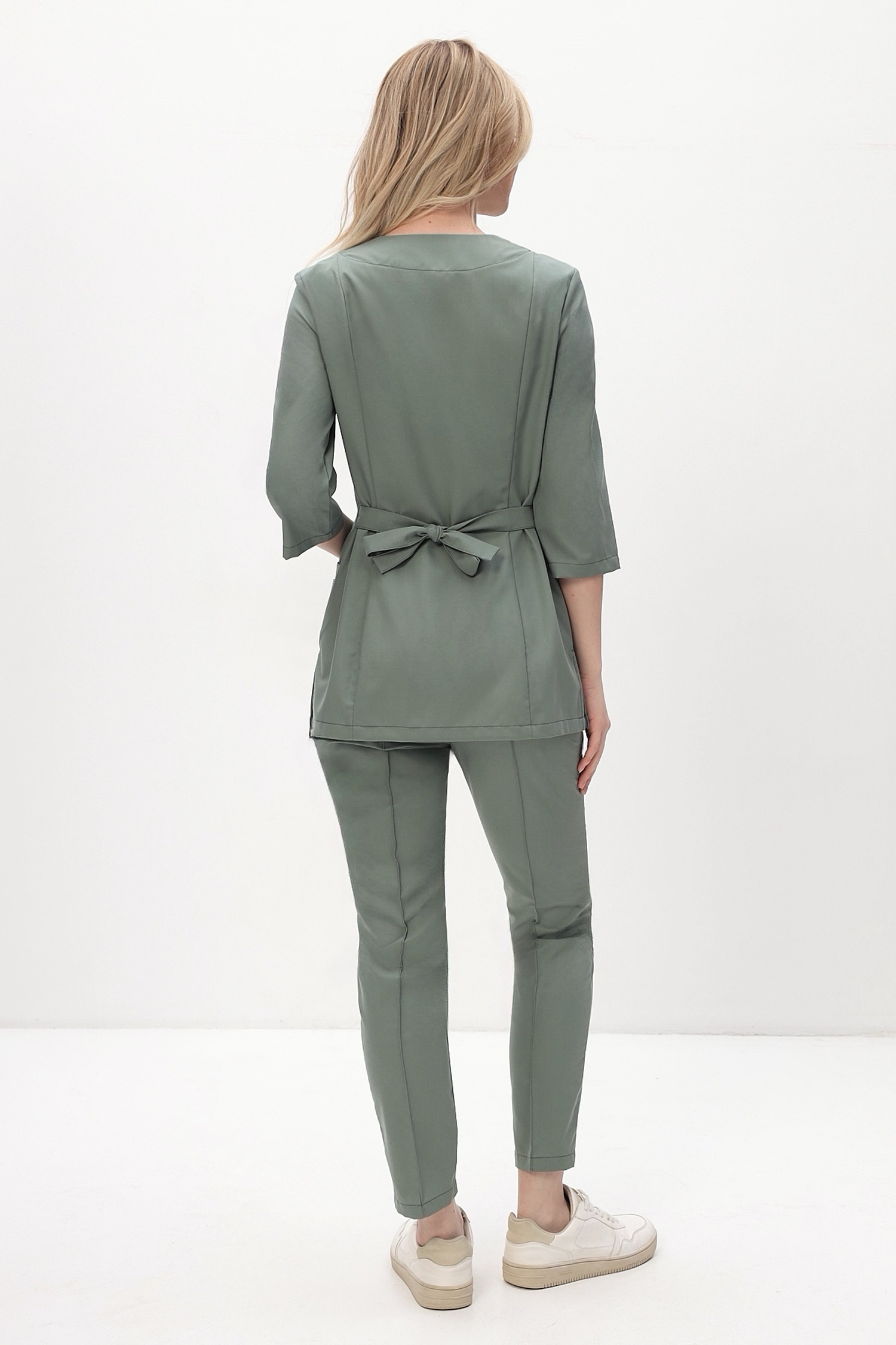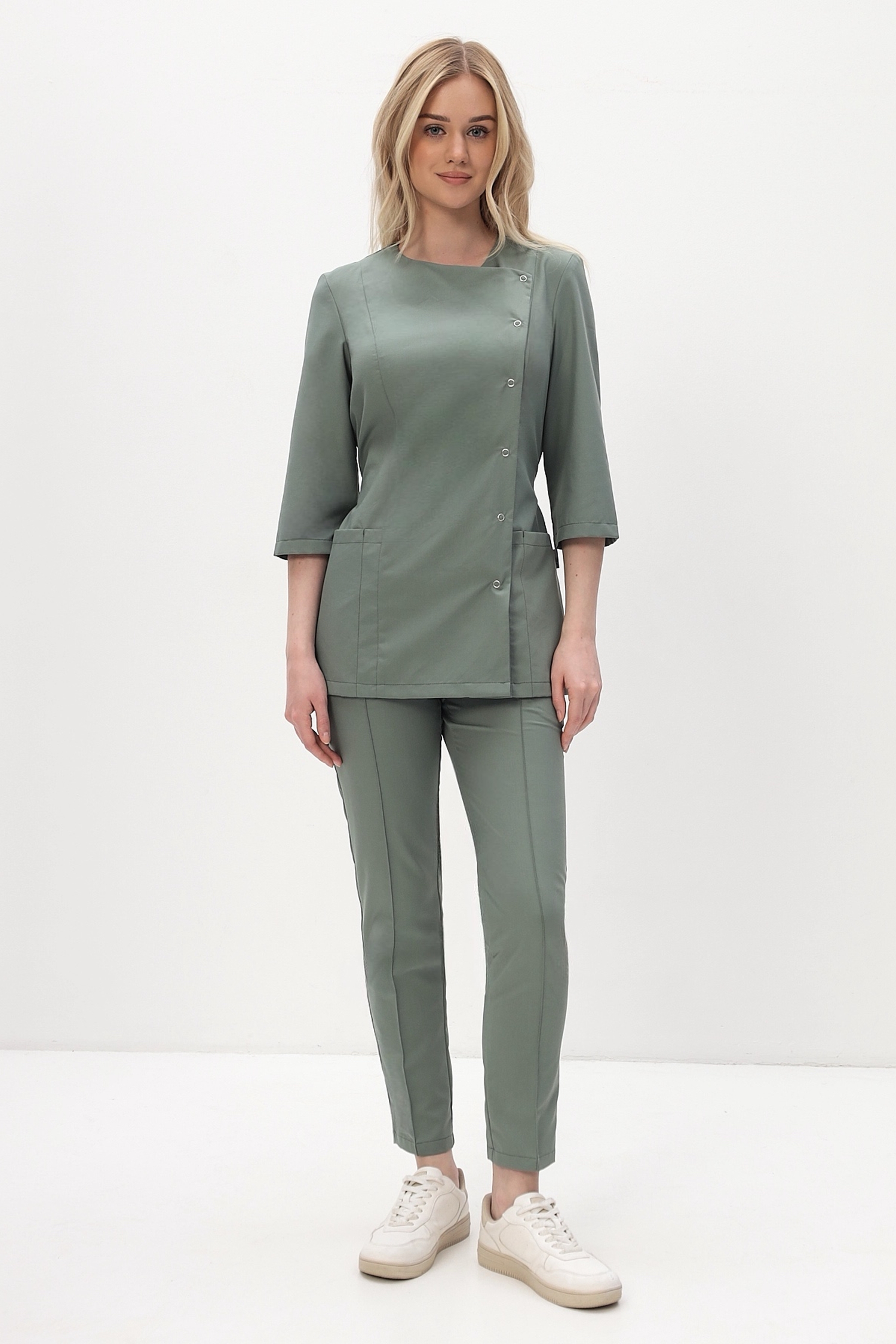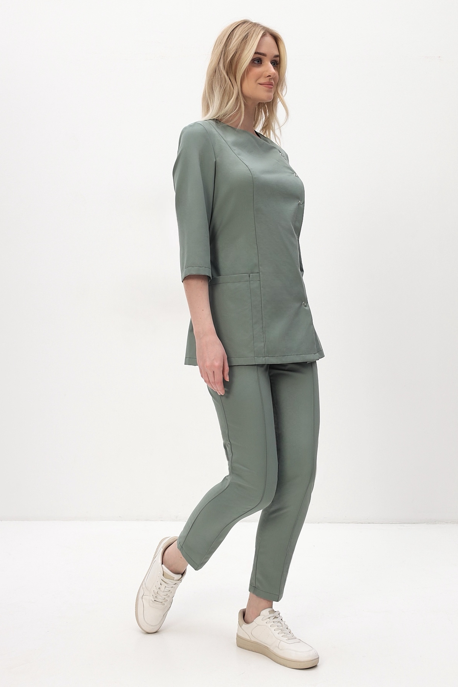 Костюм от популярного бренда Doctor Big состоит из блузы полуприлегающего силуэта и зауженных к низу брюк.