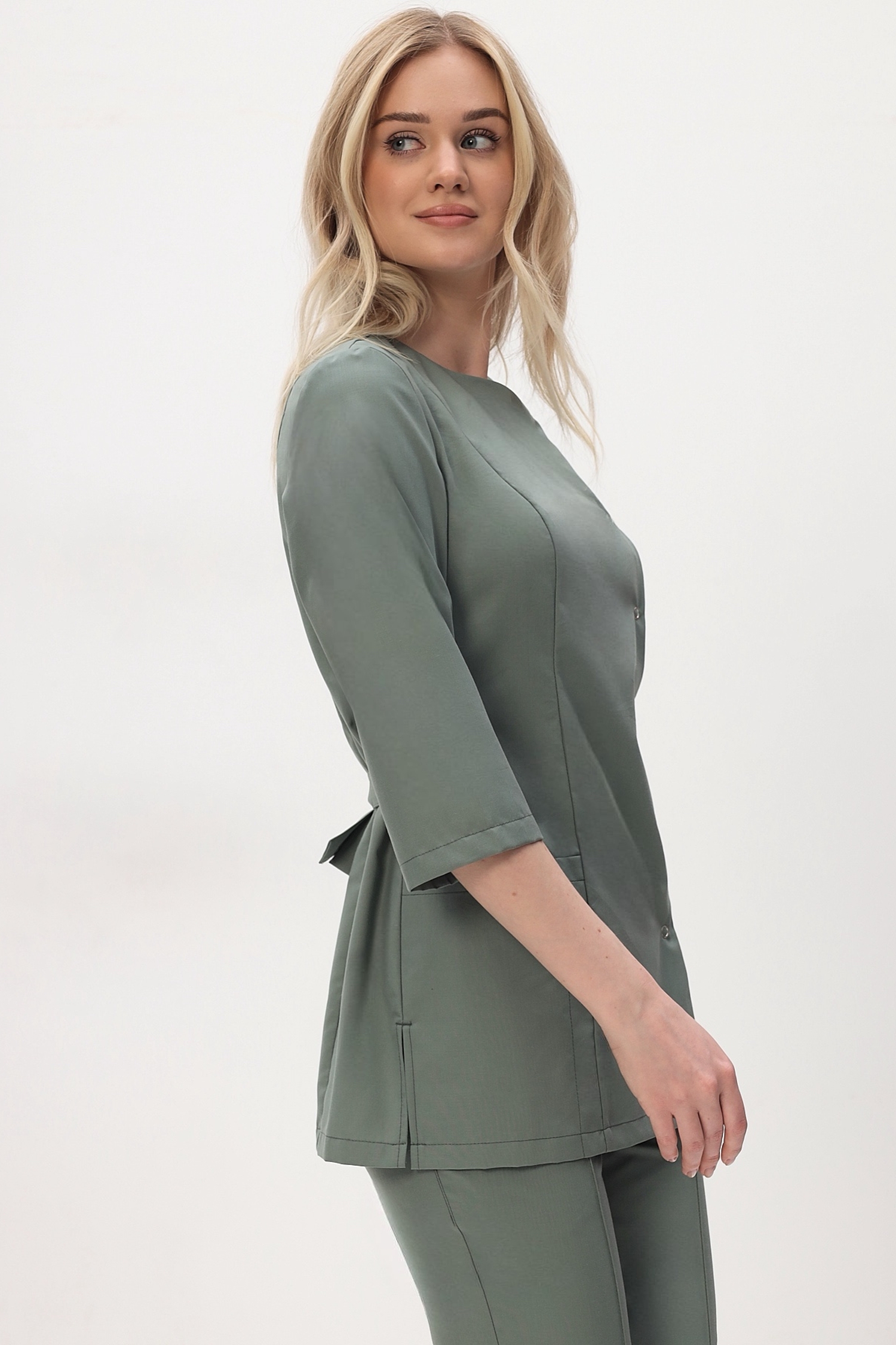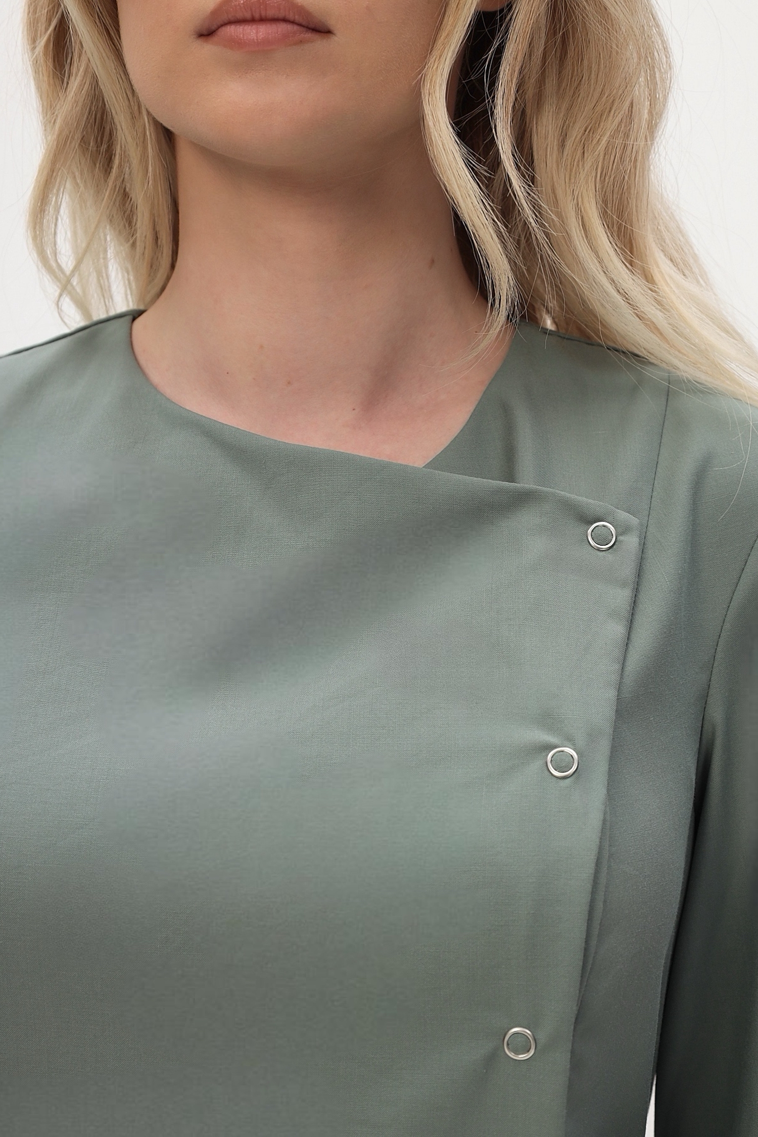 Блуза выполнена с учетом модных тенденций последних сезонов и включает элемент ассимметрии - "смещенную" в бок застежку на аккуратных кнопках. Рукав удобной длины 3/4. Благодаря двум полупоясам, Вы можете регулировать объем блузы на талии.