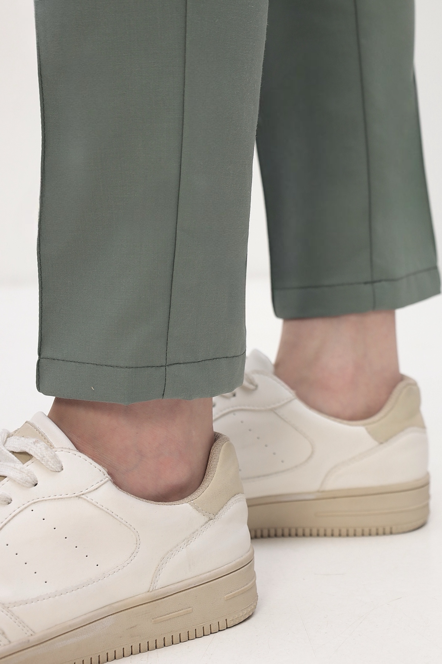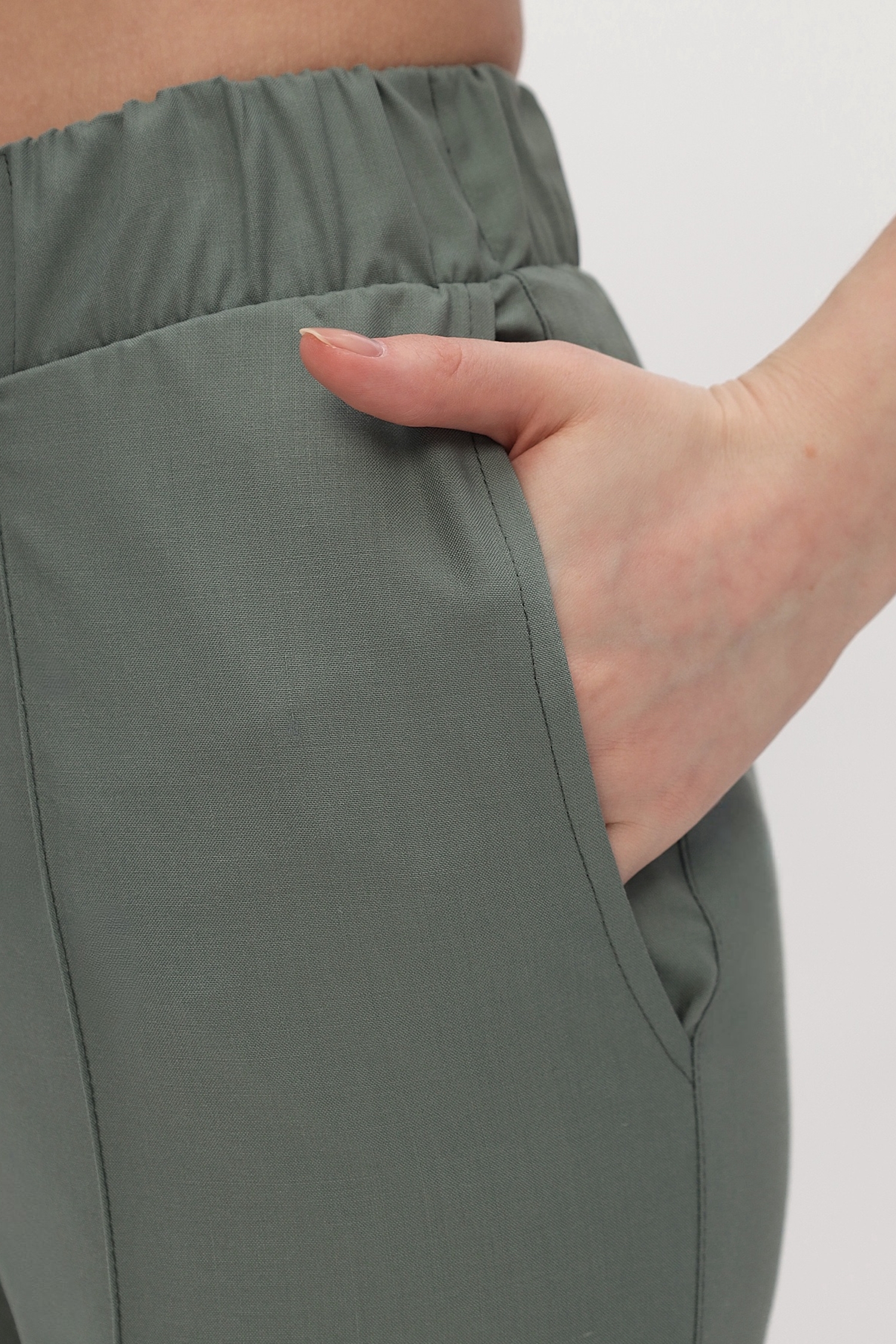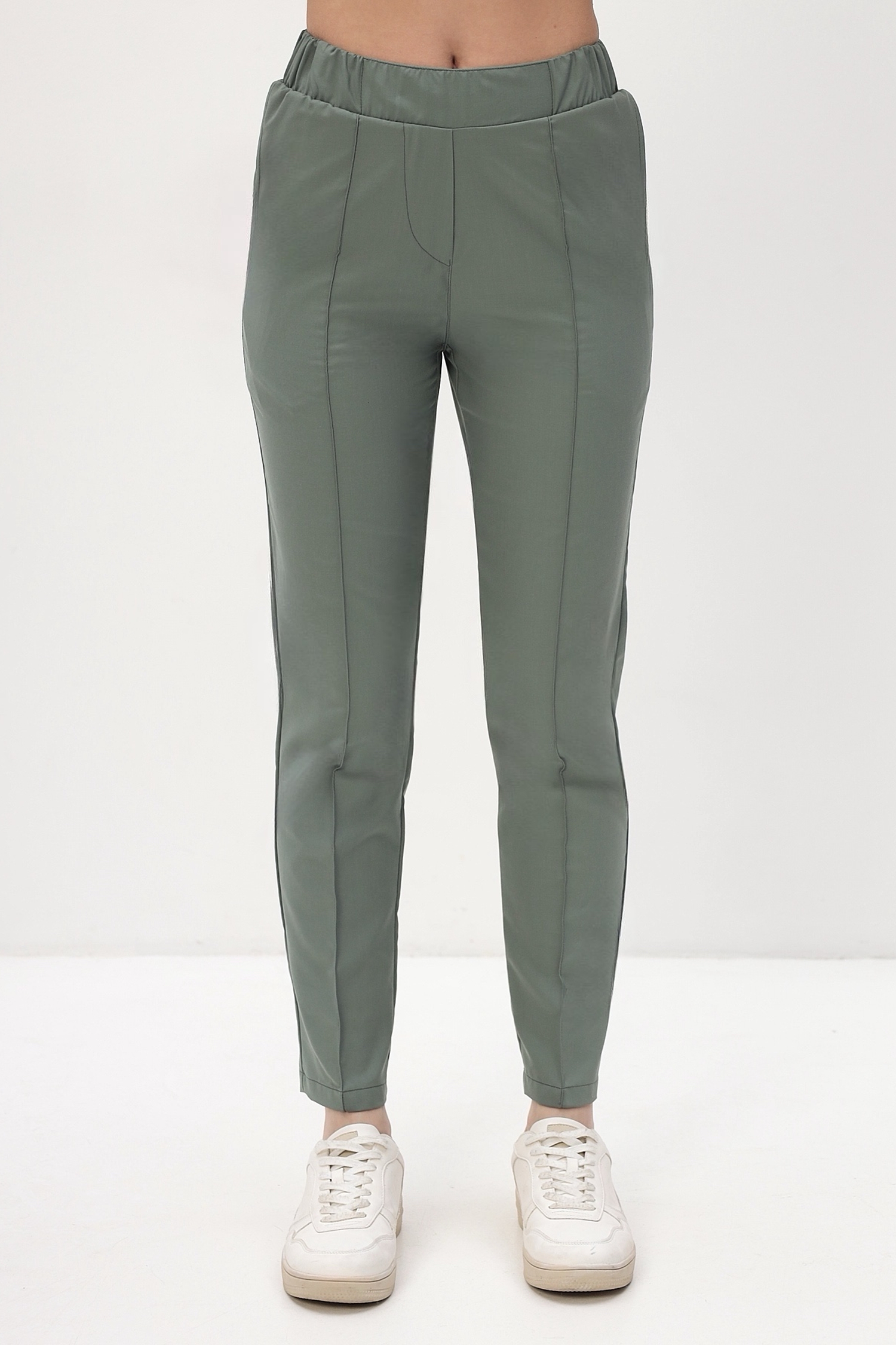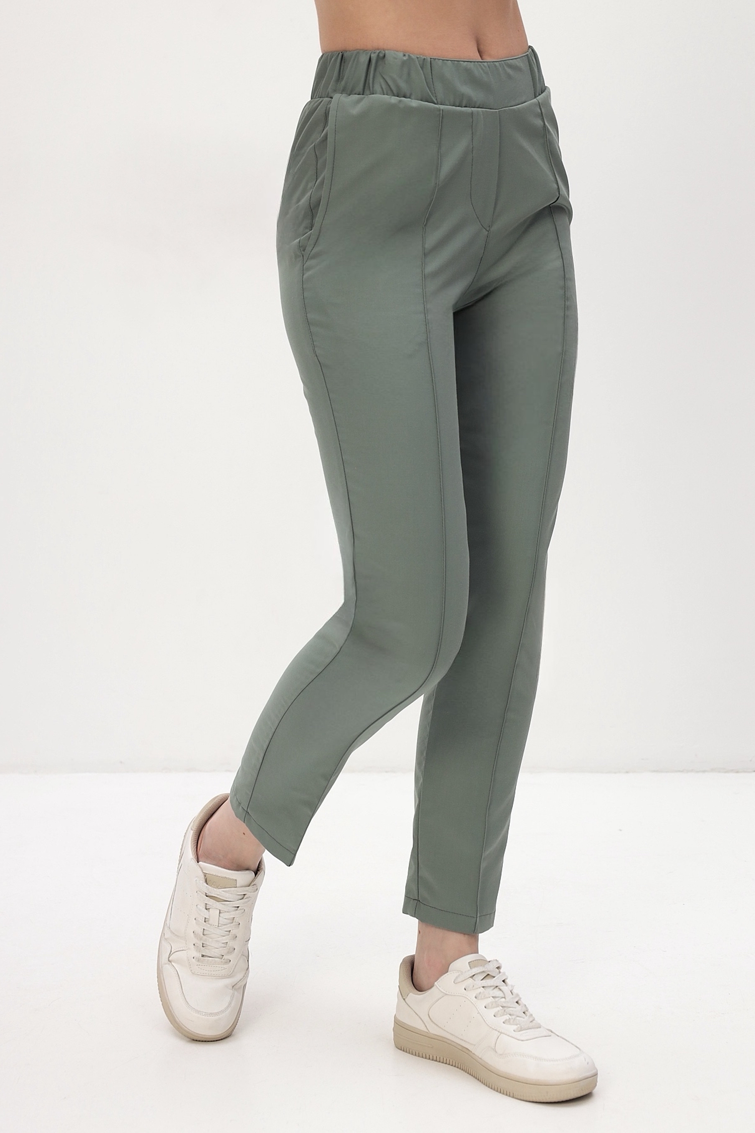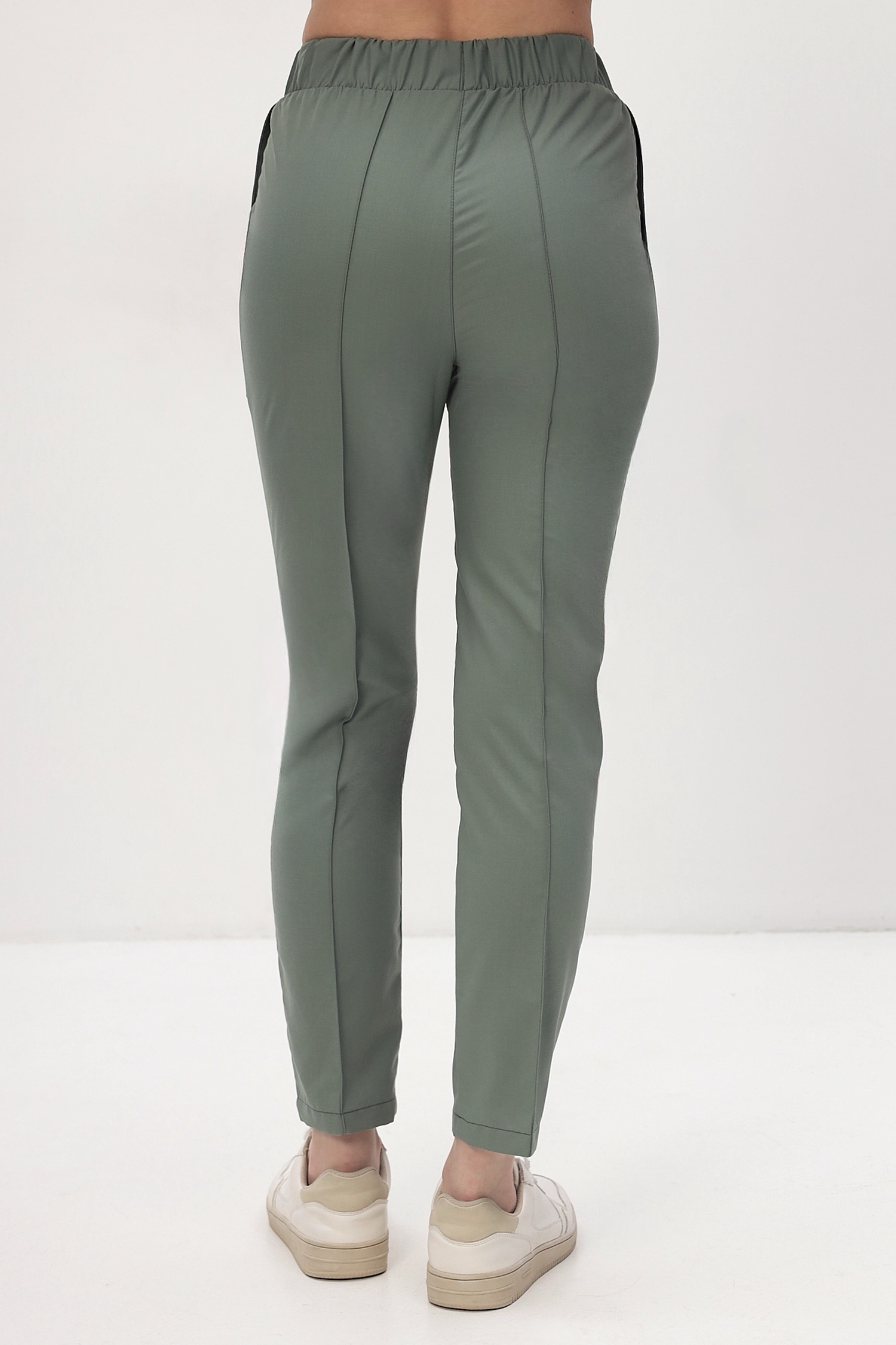 Брюки с "застроченными стрелками" спереди и сзади визуально стройнят, а имитация застежки спереди обеспечивает более презентабельный вид.