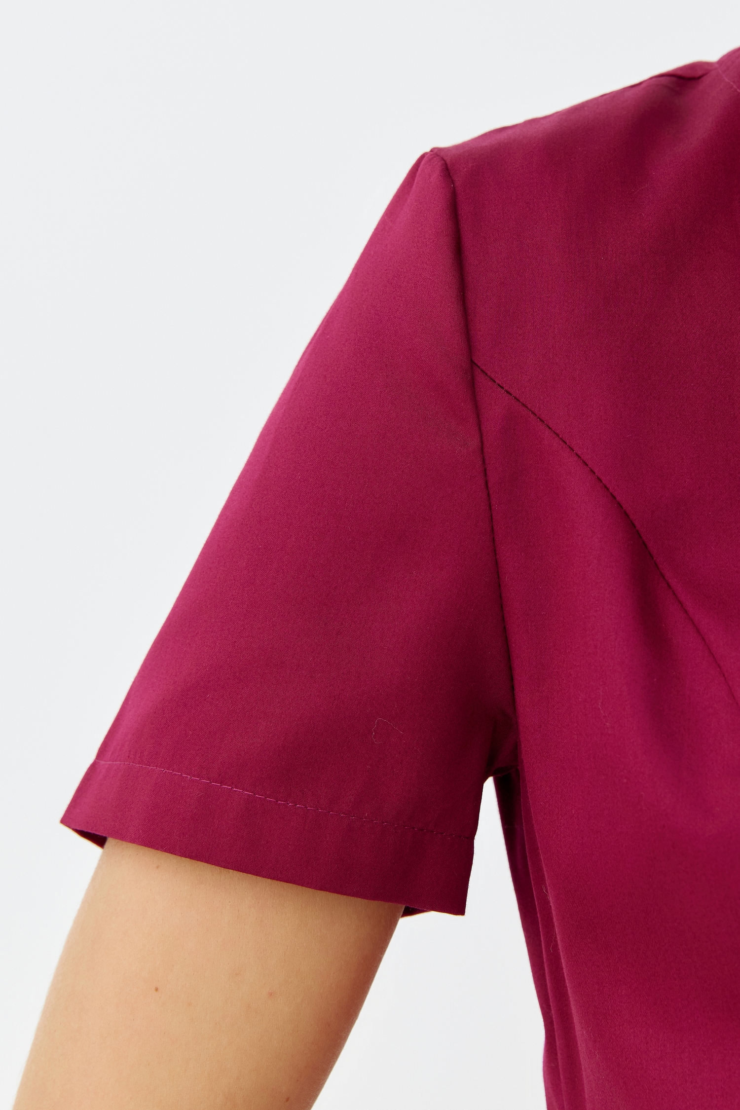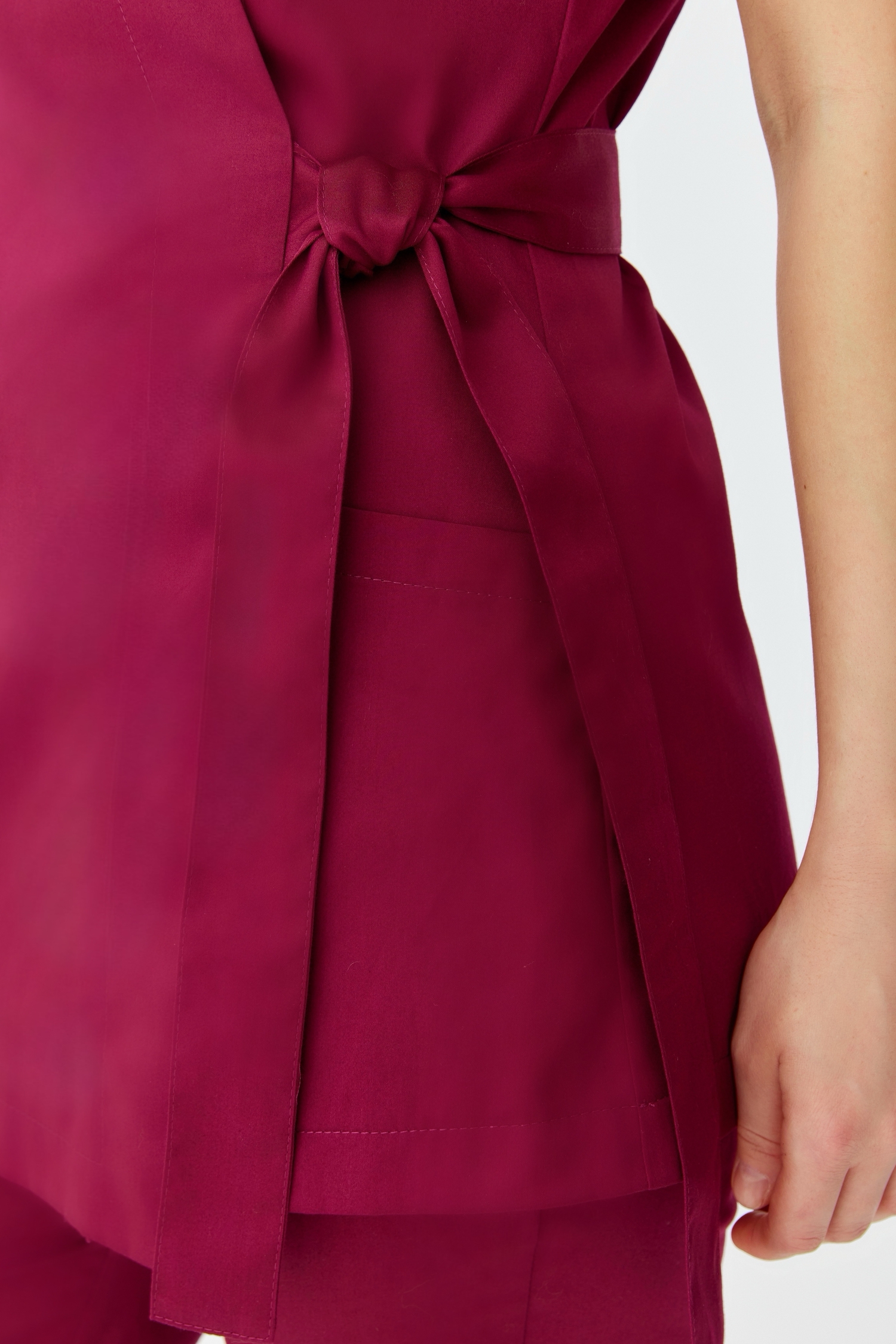 Блуза с коротким рукавом, с застежкой на запах и ассиметричной линией низа создает стильный и женственный образ. Талия блузы корректируется с помощью двух полупоясов: для фиксации левый (длинный) пояс продевается в отверстие в правой части блузы, далее оборачивается вокруг спинки и завязывается узлом или бантом с правым (коротким) поясом на талии в области левой части блузы.