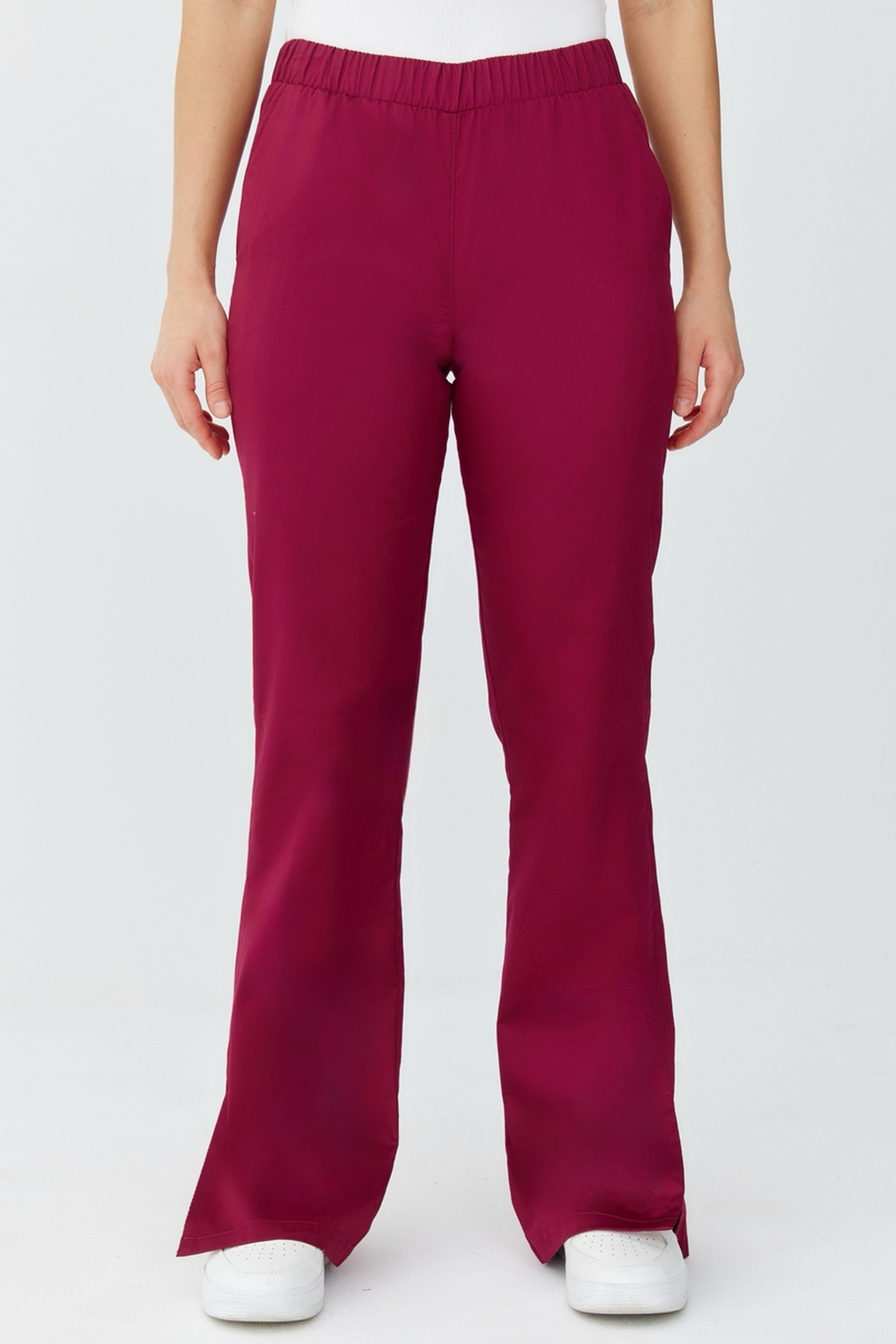 Брюки прямого кроя, с разрезами снизу – в соответствии с модными трендами этого года. Боковые карманы позволяют хранить необходимые принадлежности под рукой. Пояс брюк стянут эластичной лентой для комфортной носки на протяжении всего дня.