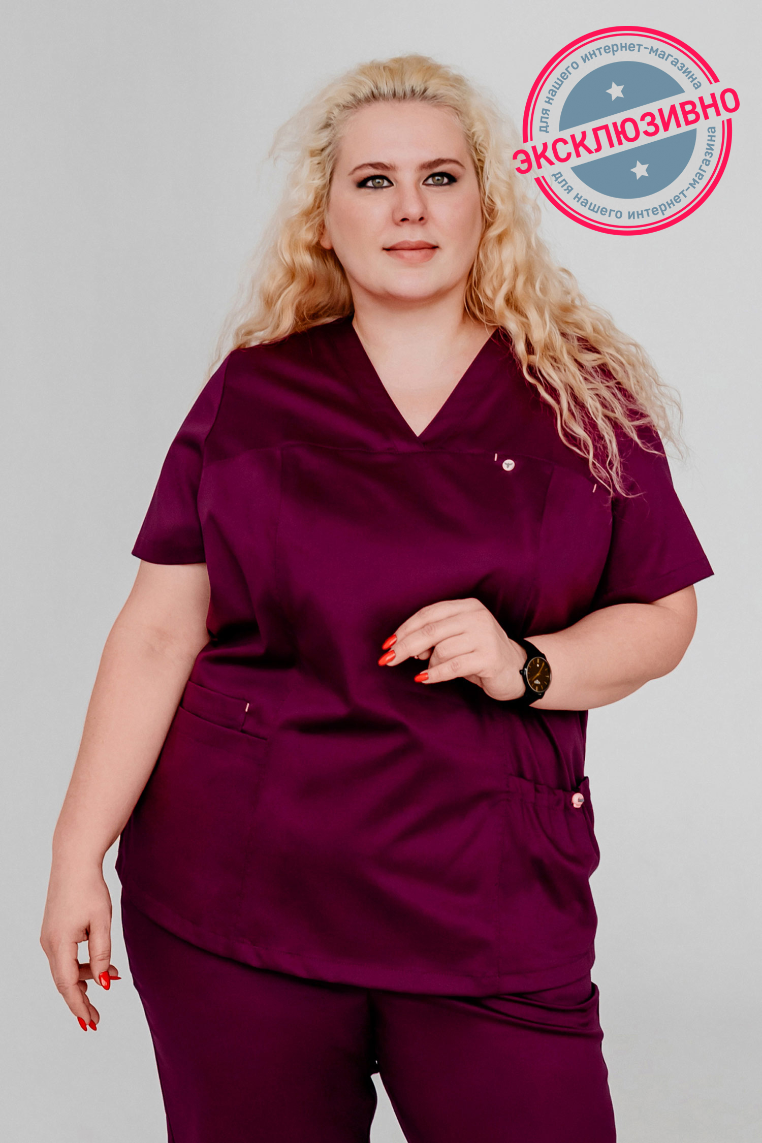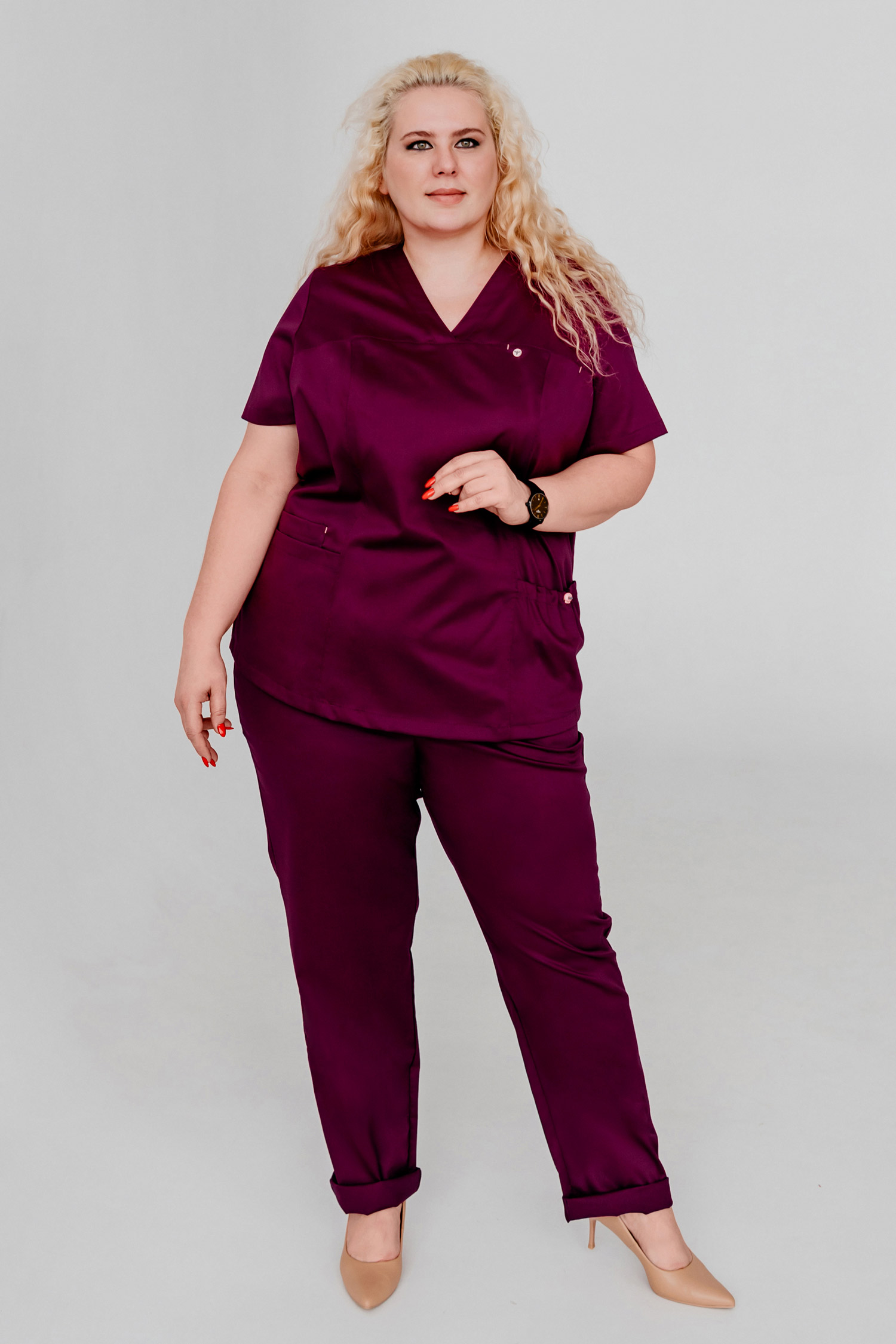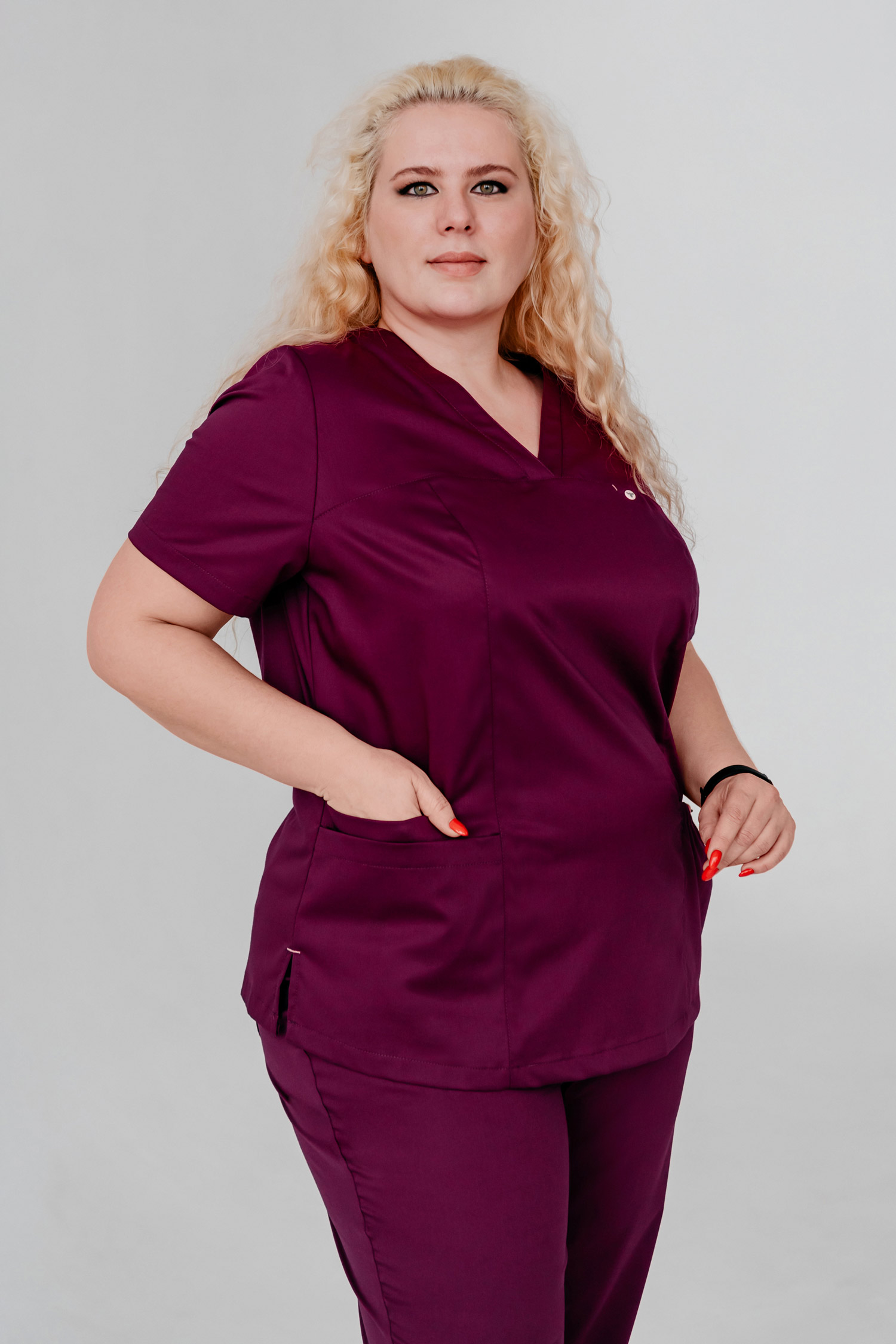Женственный и комфортный медицинский блузон, представленный в нескольких оттенках, покорит Вас своими модным дизайном и практичностью в носке. В этой модели прекрасно всё! V-образный вырез делает акцент на шее, визуально удлиняя ее и подчеркивая изящество линий. Идеальная посадка по фигуре благодаря рельефам подчеркнут линии тела, сохраняя женственность. Вертикальные боковые разрезы по линии бедер дарят Вашим движениям свободу. Один нагрудный карман, который застегивается на кнопку, три нижних кармана, один из которых объемный, регулируется шнурком - всё для вашего удобства!