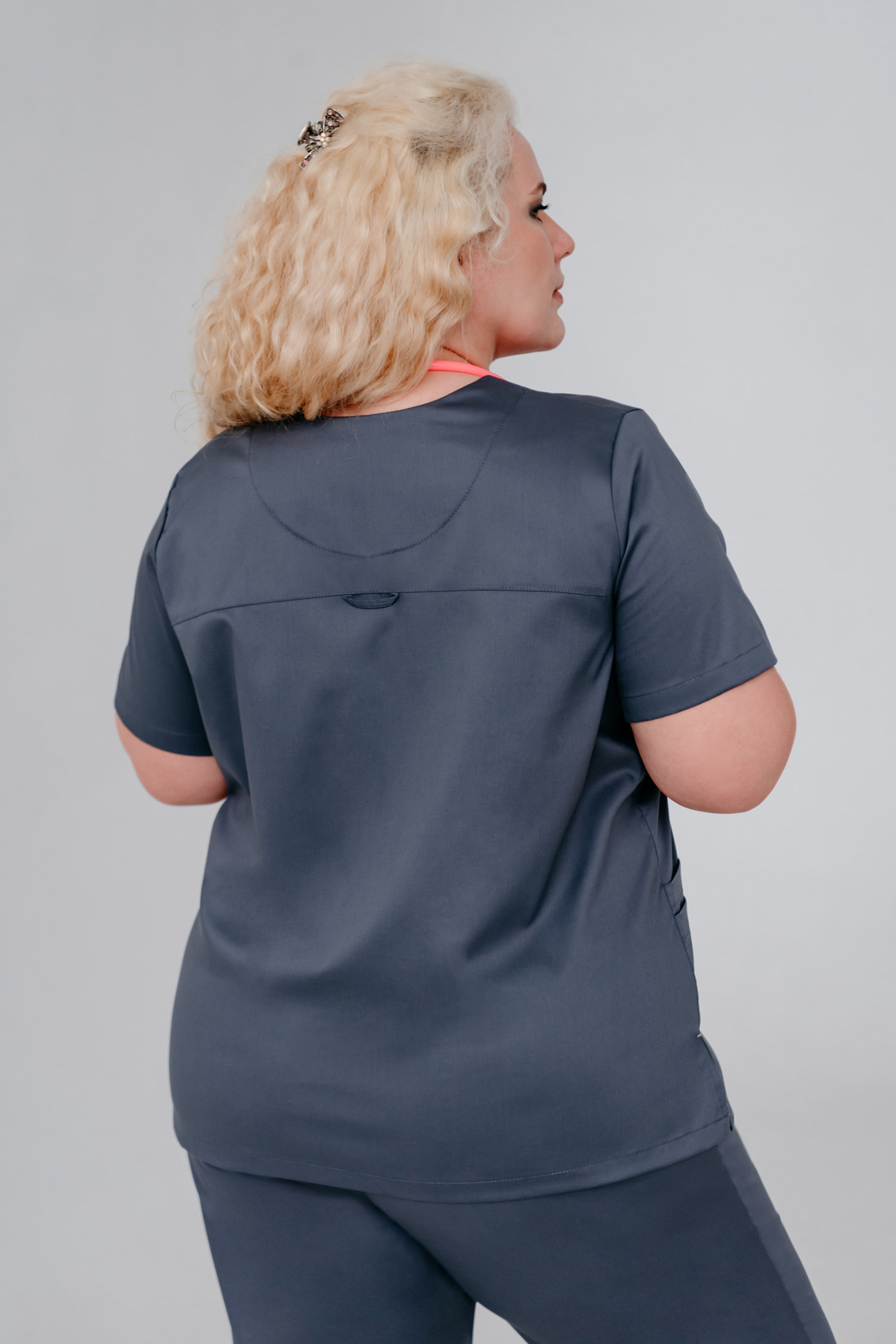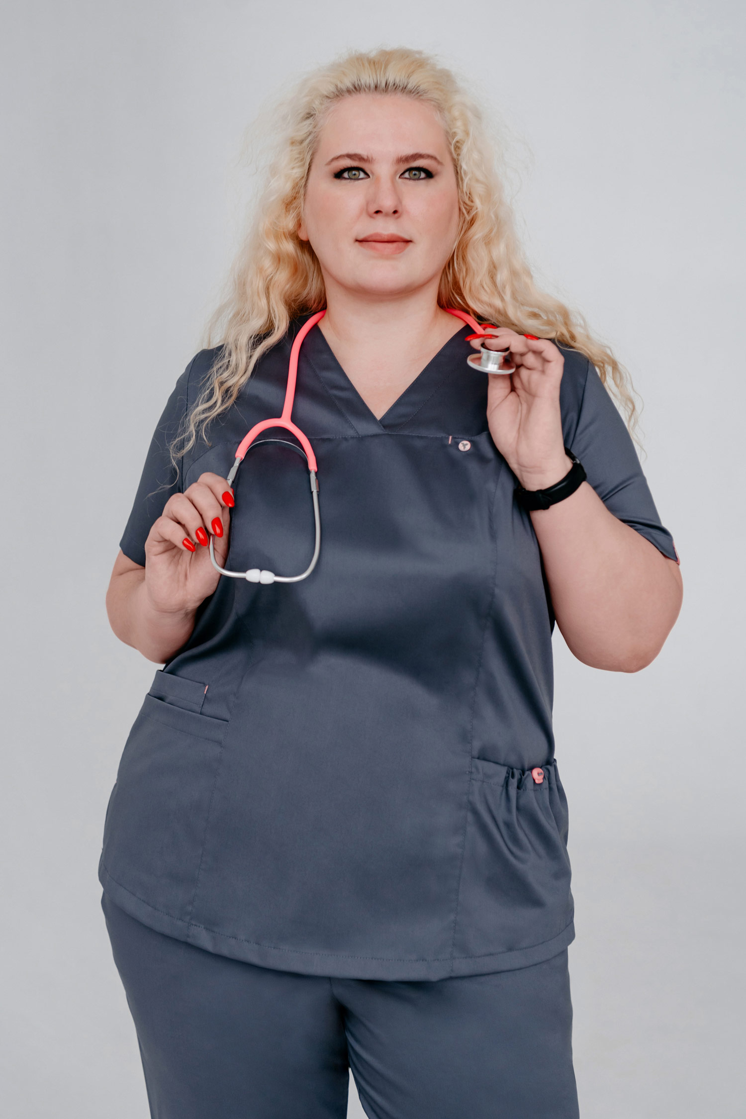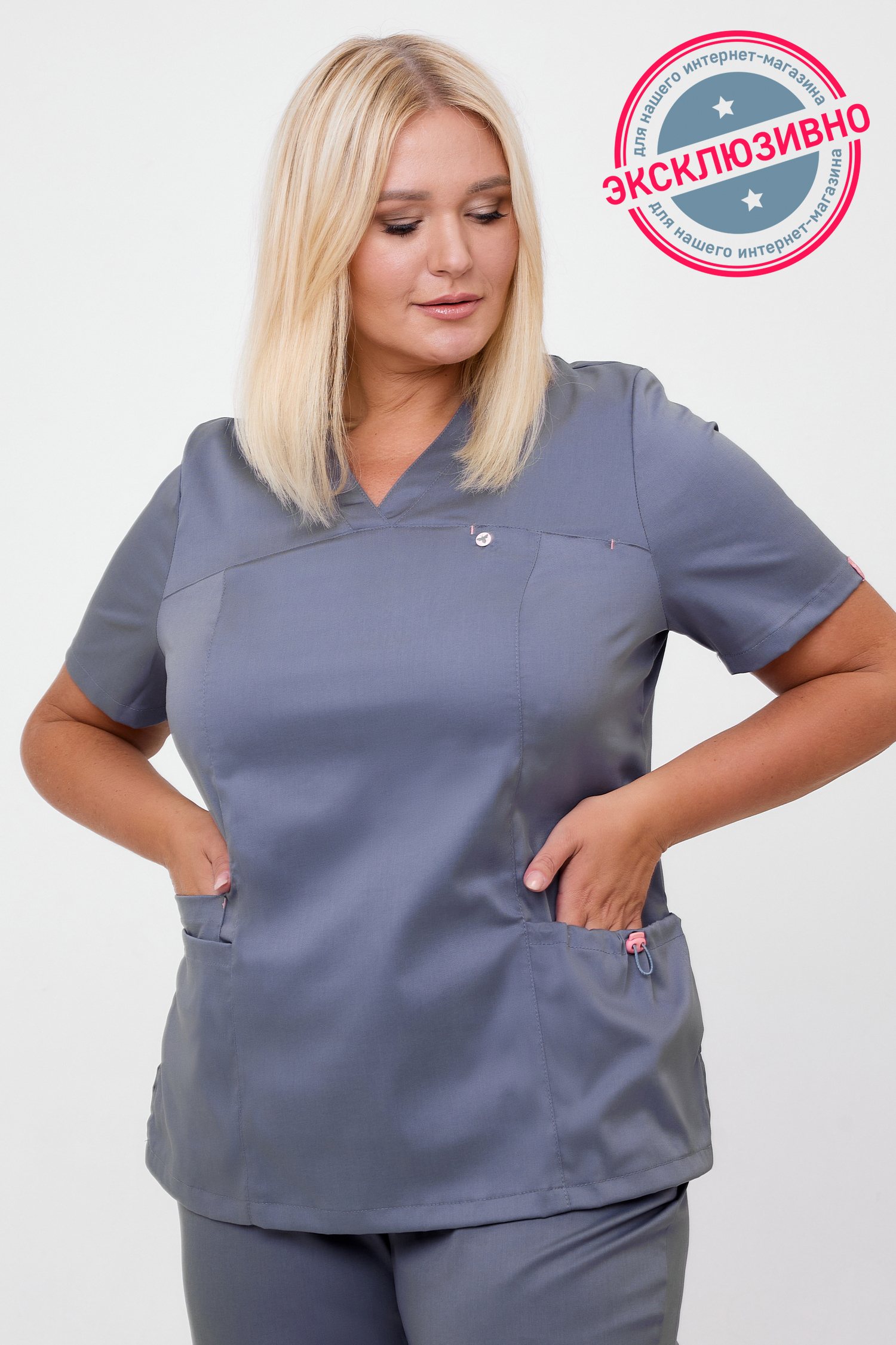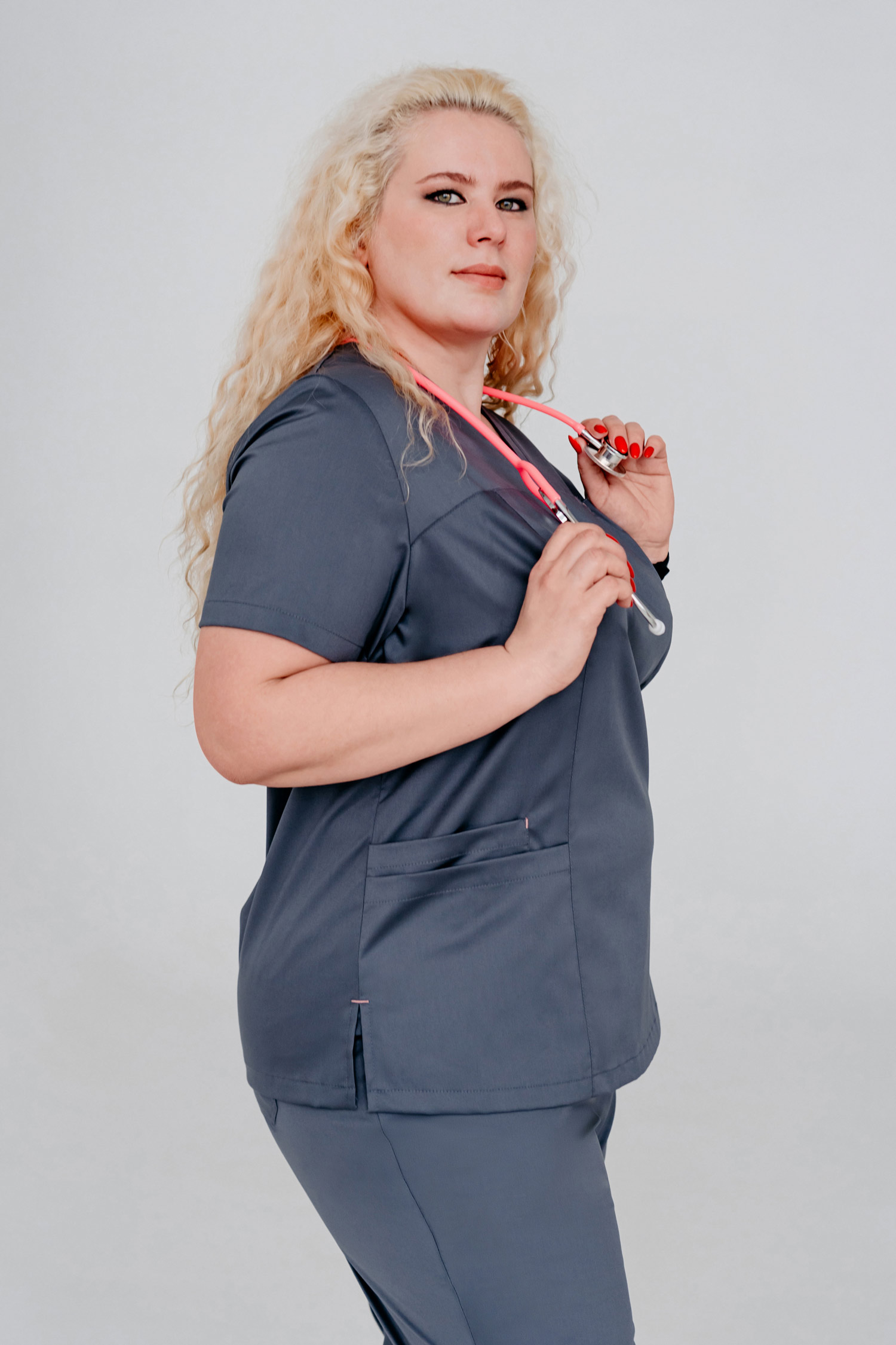 Женственный и комфортный медицинский блузон, представленный в нескольких оттенках, покорит Вас своими модным дизайном и практичностью в носке. В этой модели прекрасно всё! V-образный вырез делает акцент на шее, визуально удлиняя ее и подчеркивая изящество линий. Идеальная посадка по фигуре благодаря рельефам подчеркнут линии тела, сохраняя женственность. Вертикальные боковые разрезы по линии бедер дарят Вашим движениям свободу. Один нагрудный карман, который застегивается на кнопку, три нижних кармана, один из которых объемный, регулируется шнурком - всё для вашего удобства!