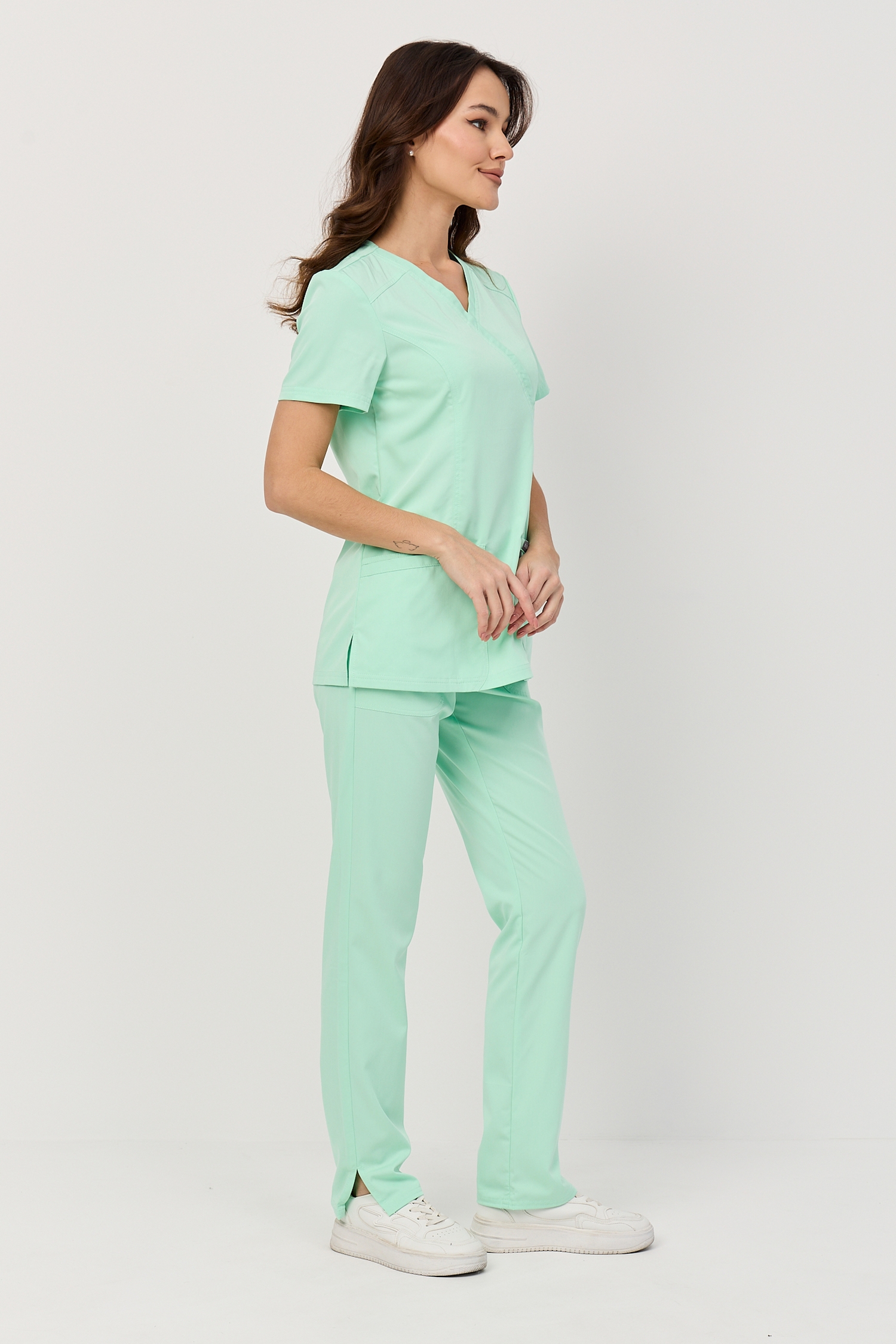 SILVA (52% полиэстер, 45% вискоза, 3% спандекс 170 г/м2) - идеальное сочетание легкости, эластичности и комфорта в одной ткани. Специально разработанная для нашей компании, она идеально подходит для медицинской одежды благодаря своей эргономичности и способности следовать каждому движению. Не просвечивает, не мнется, сохраняет яркость цвета, быстро сохнет и не требует глажки. Рекомендуем стирать изделие наизнанку при температуре не выше 30°C, с вещами аналогичного цвета. Не отбеливать. Гладить с изнаночной стороны при температуре не выше 110°C. Разрешена низкотемпературная машинная сушка. Не подвергать химической чистке.