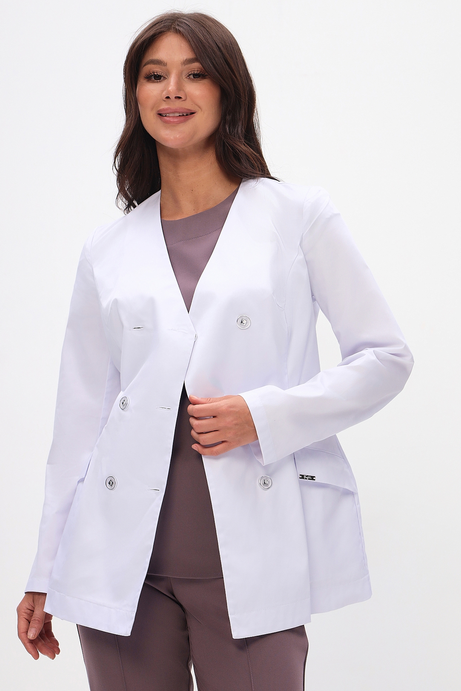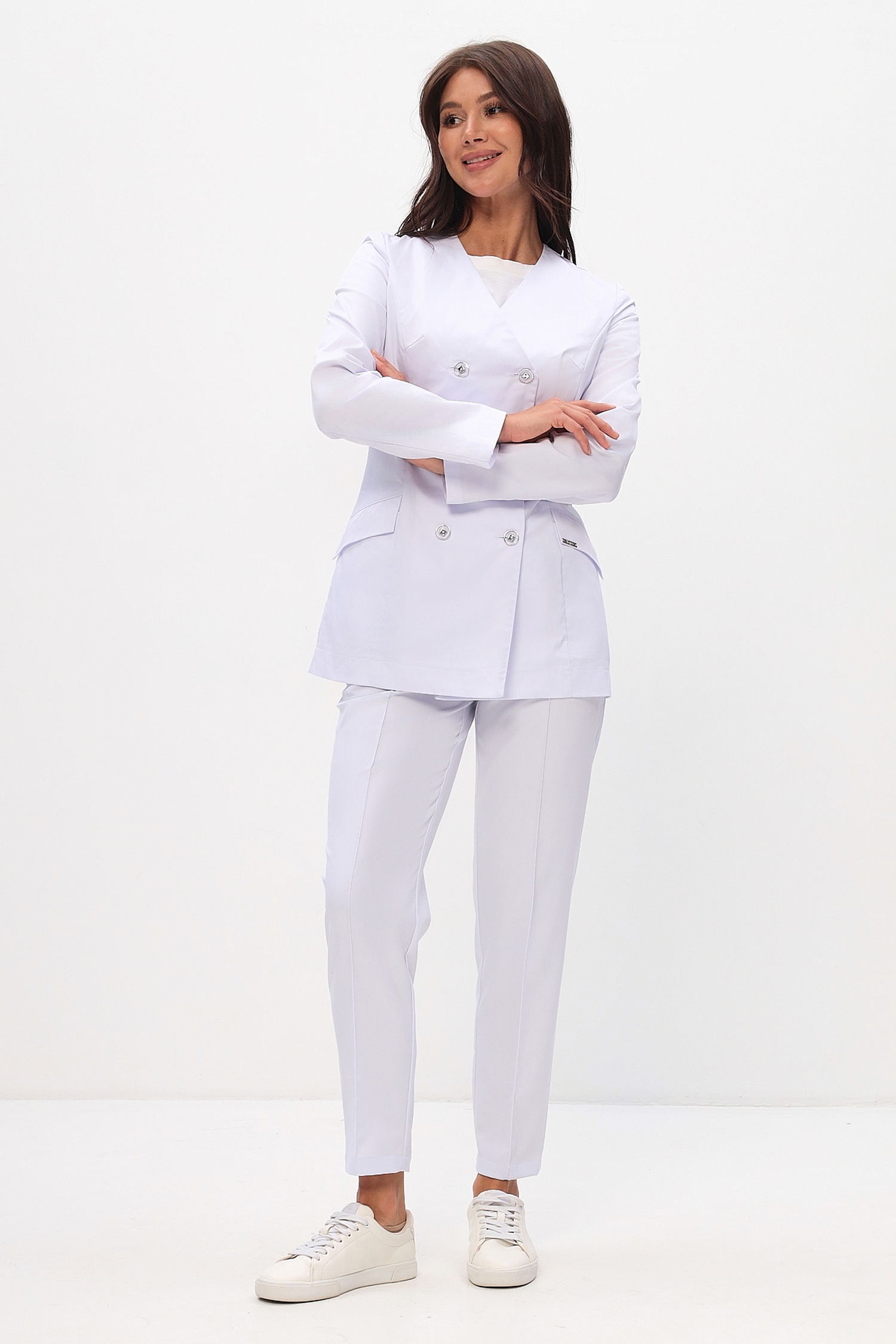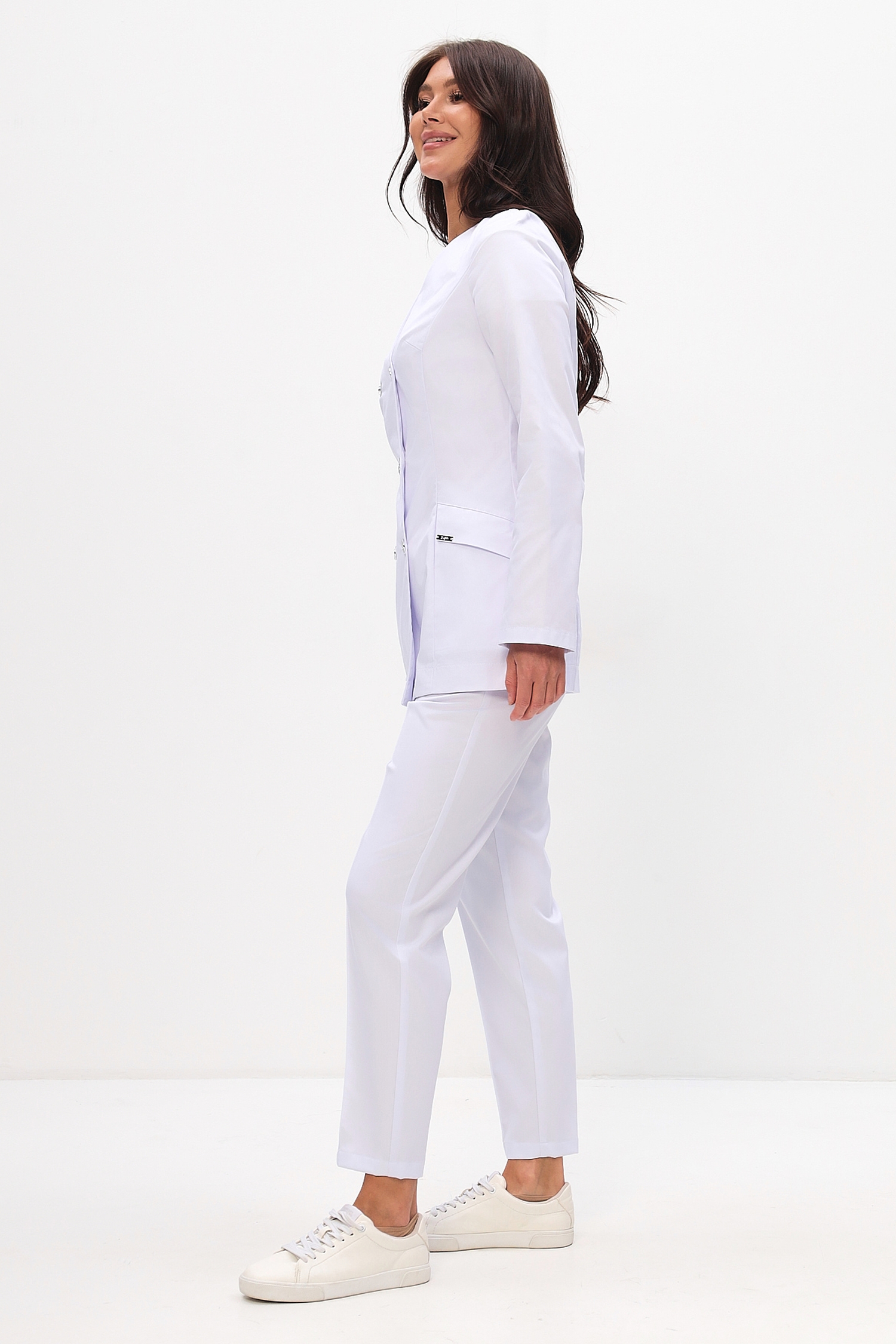 Жакет полуприлегающего силуэта длиной ниже уровня бедер. Застежка на 4 пуговицы (2 пуговицы - декоративные).