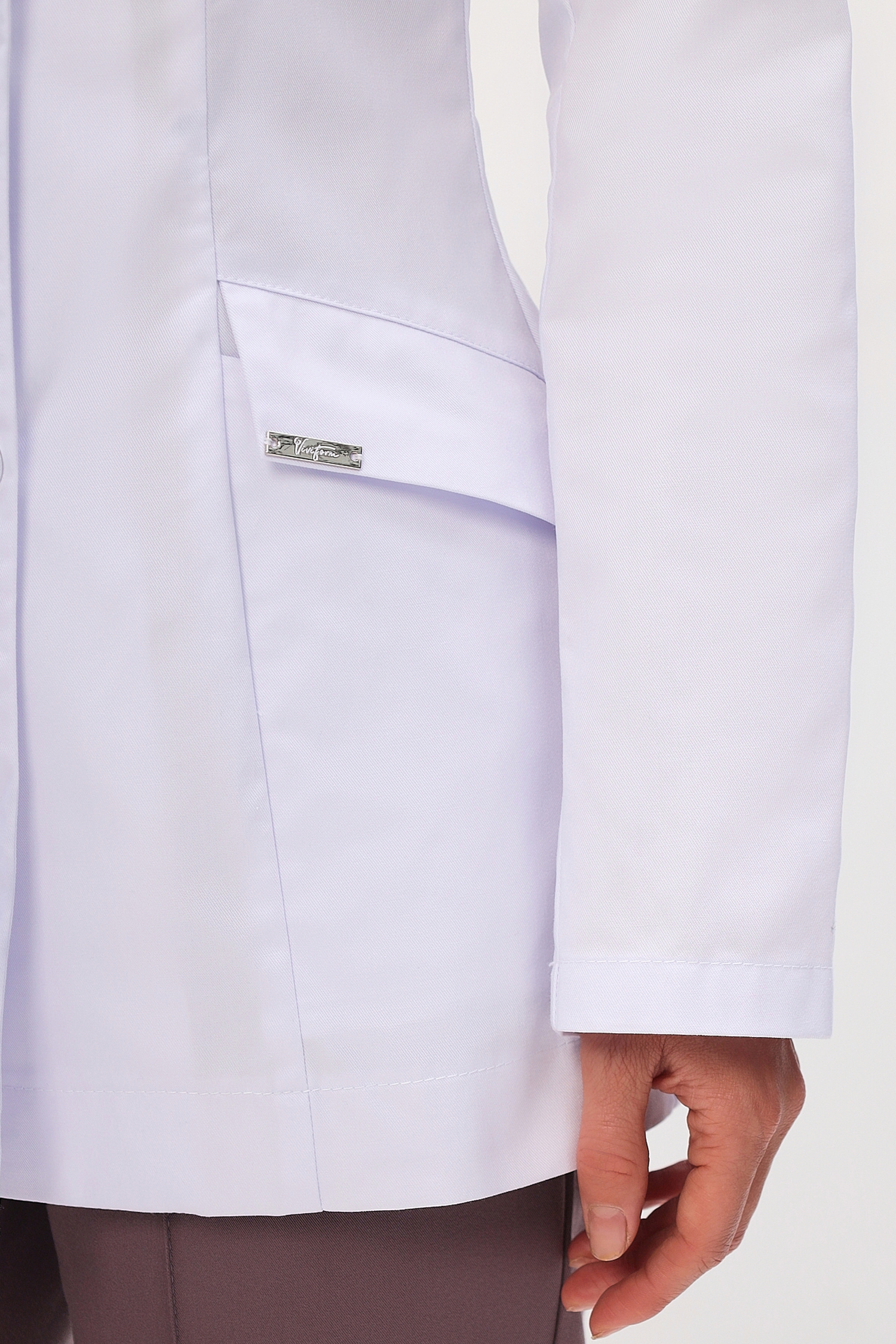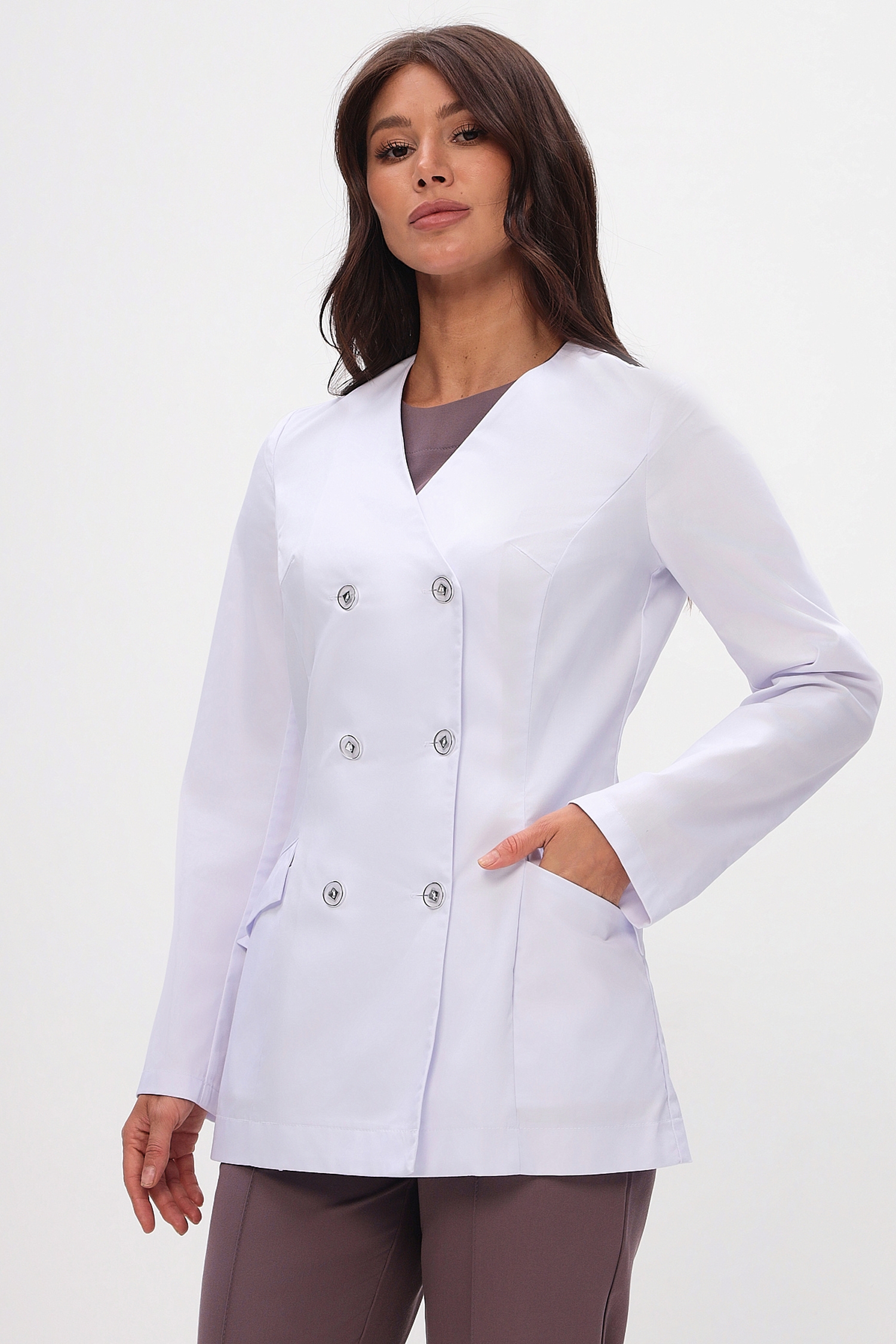 Горловина жакета классической V-образной формы.