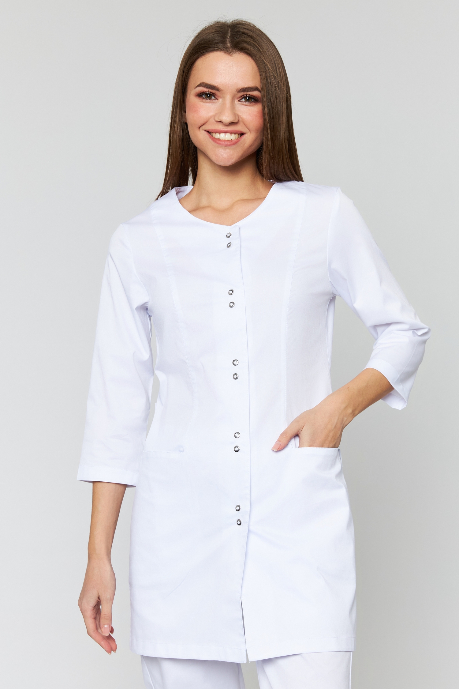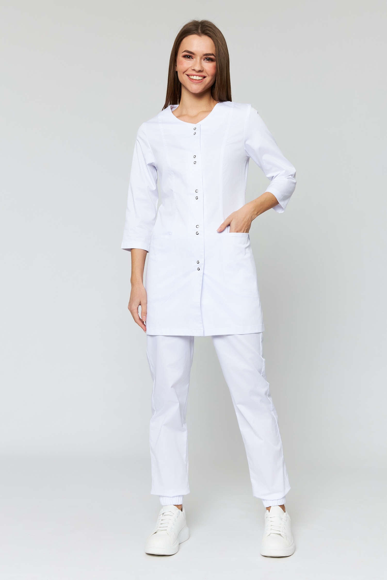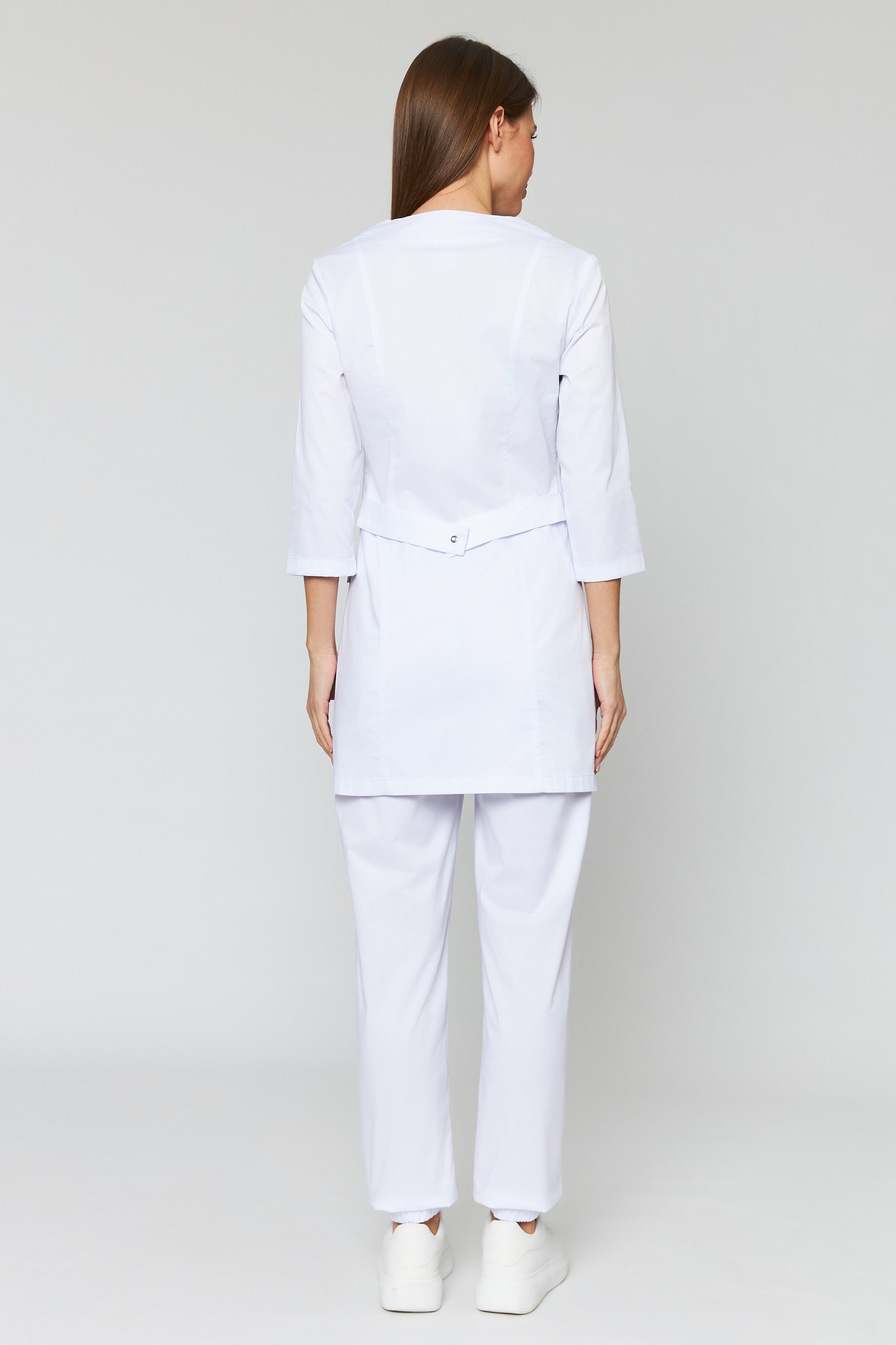Эта блуза, несомненно,понравится всем представительницам прекрасного пола независимо от возраста! Белоснежный оттенок и привлекательный дизайн сделают образ светлым и нежным. Изделие имеет полуприлегающий силуэт, благодаря которому выгодно подчеркивает талию и скрывает недостатки фигуры. Длина до середины бедра дает возможность надеть его как с брюками, так и с юбкой. Несмотря на традиционный для медицинской одежды белый цвет, блузон не кажется скучным. Он украшен кнопками-застежками, рельефными швами и неширокими полупоясами, эстетично застегивающимися сзади. Плюс ко всему, модель очень функциональна: рукава длиной ¾ не мешают выполнению никаких действий, а два кармана позволяют всегда иметь при себе необходимые для работы мелочи. Широкий размерный ряд изделия дает возможность любой девушке или женщине-медработнику выглядеть ослепительно! Убедитесь в этом лично!
