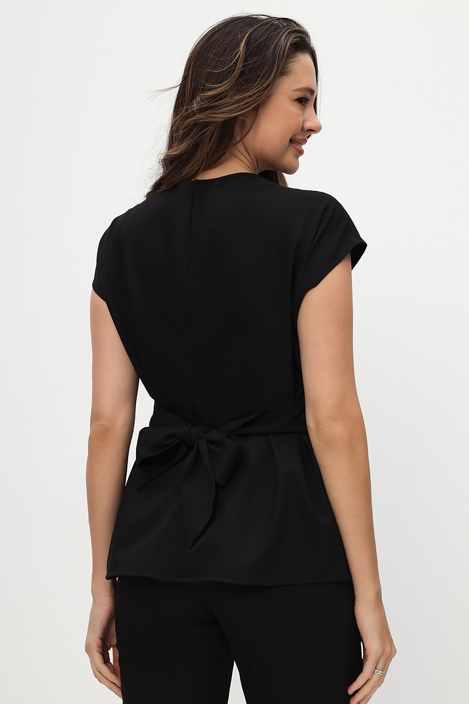Блуза отлично комбинируется с любыми видами брюк: от скинни до палаццо. Дизайнеры предлагают завязывать бант из пояса как спереди так и сзади.