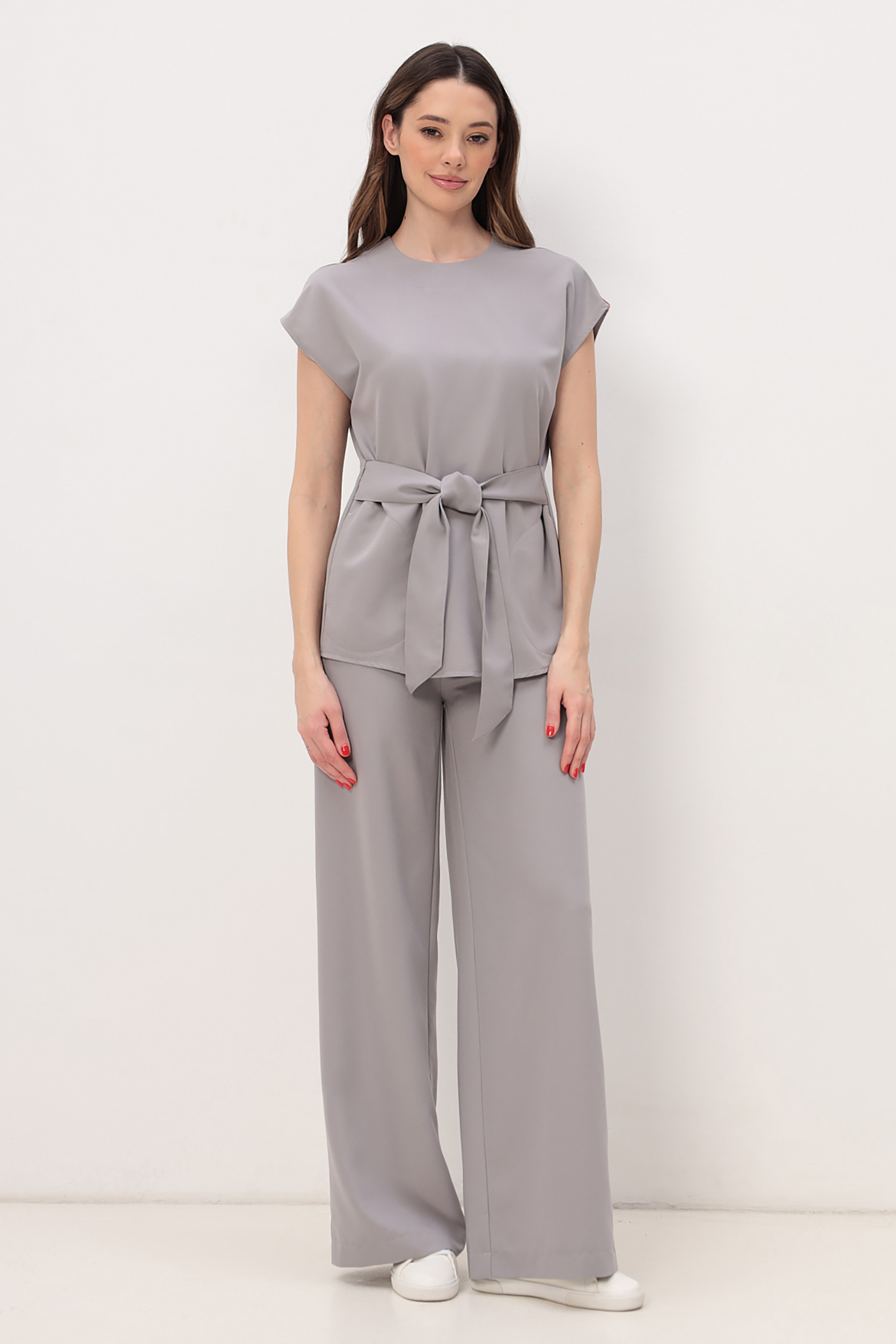 Блуза отлично комбинируется с любыми видами брюк: от скинни до палаццо. Дизайнеры предлагают завязывать бант из пояса как спереди так и сзади.