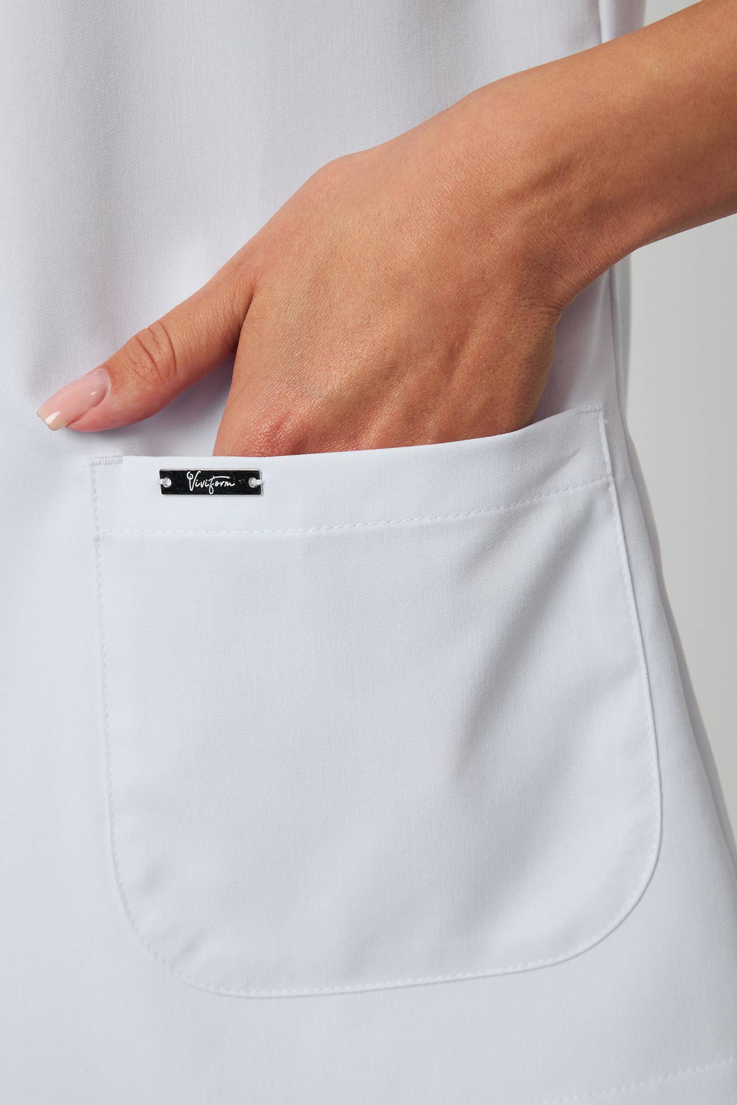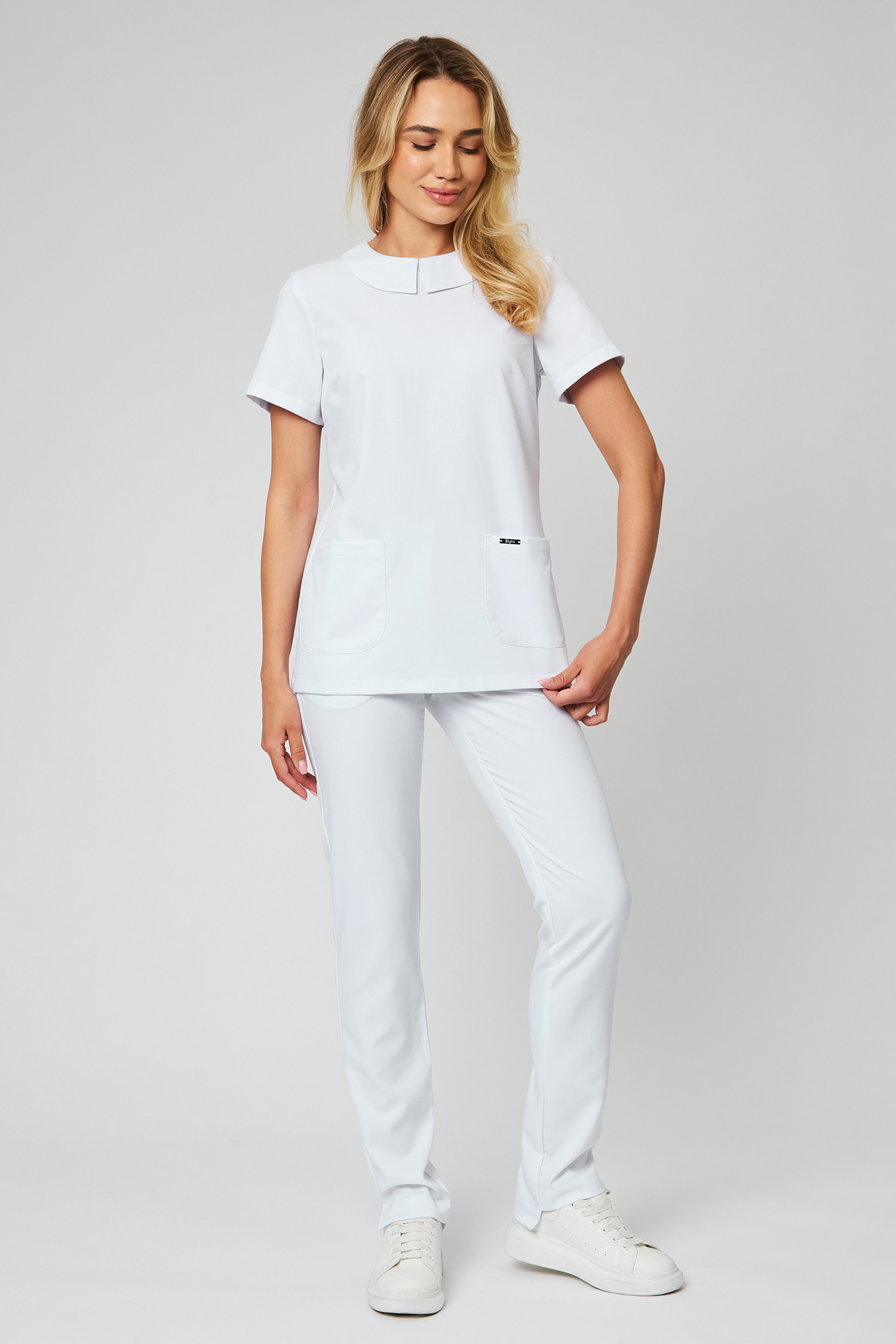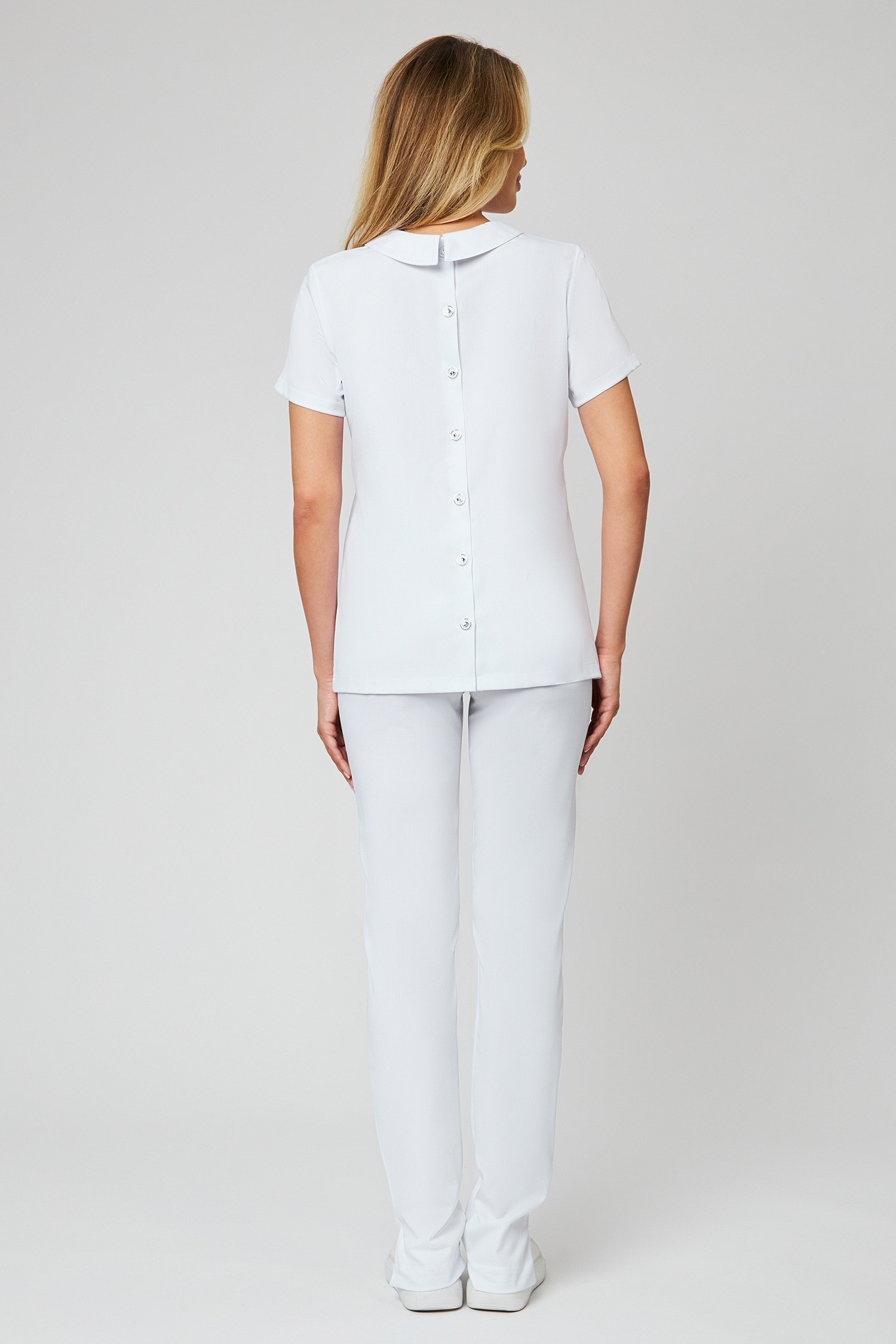 Медицинская блуза свободного силуэта, одновременно строгая и романтичная, с коротким рукавом и 2-мя функциональными карманами спереди. Изюминкой блузы является центральная застежка на пуговицы сзади, на спинке.