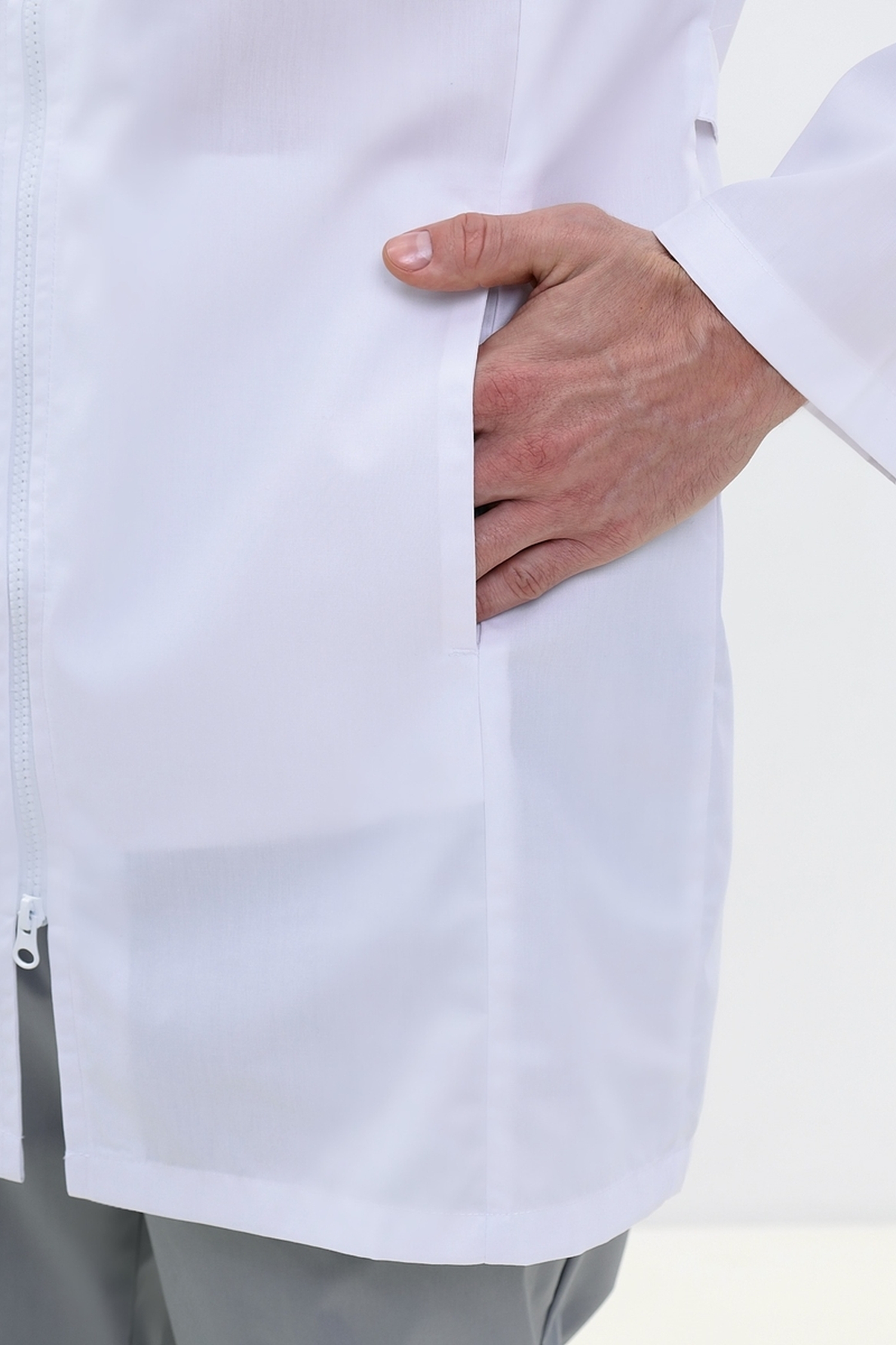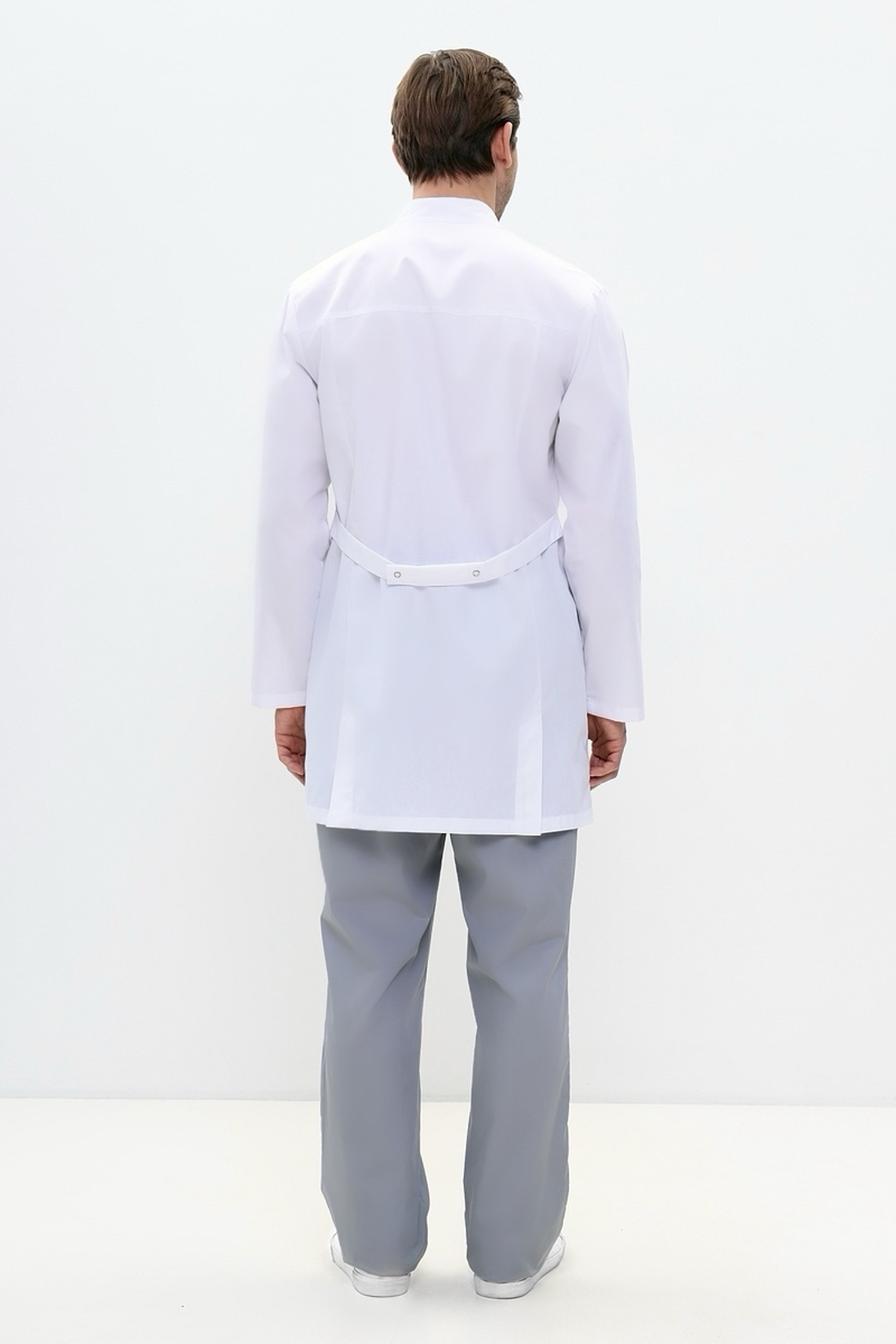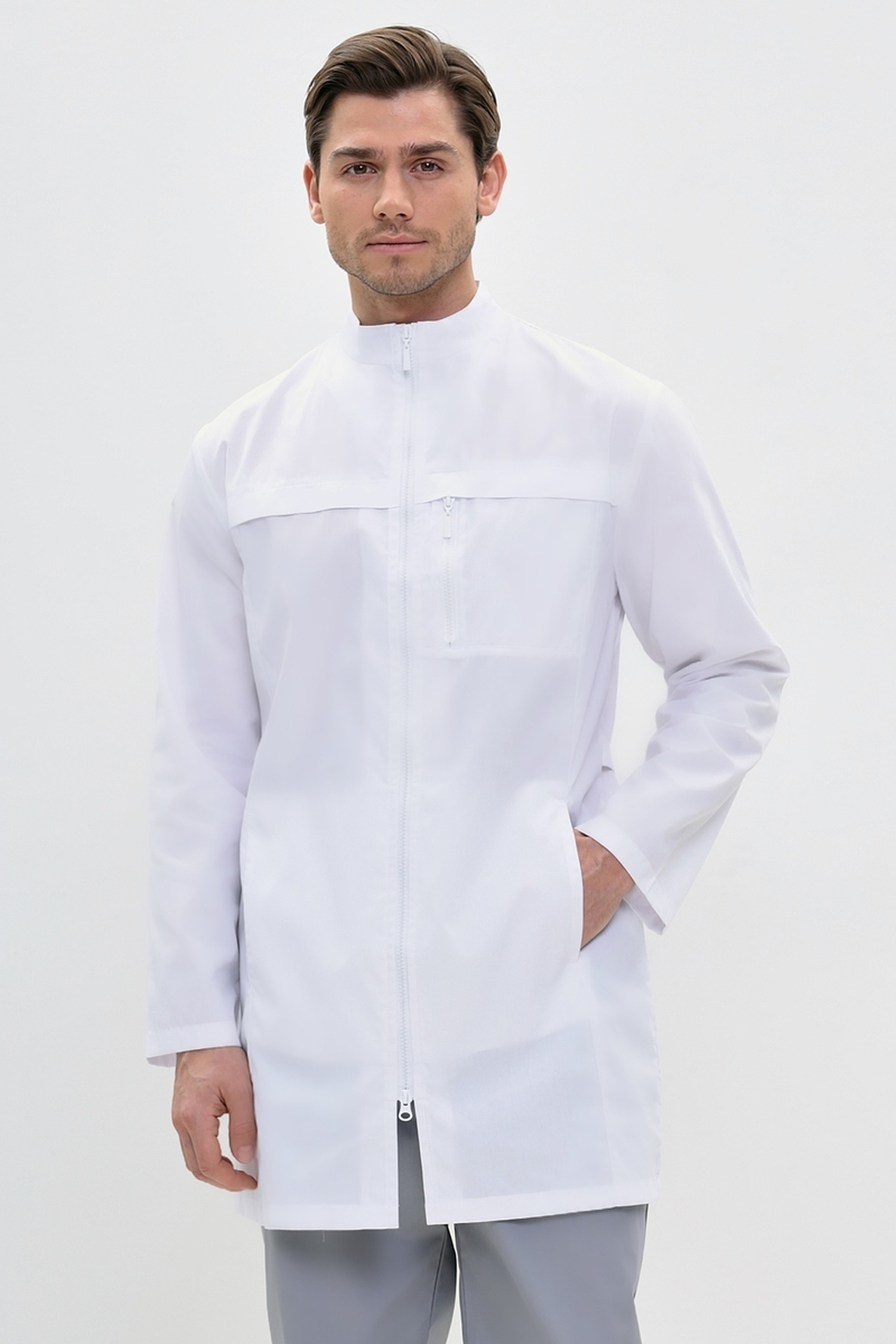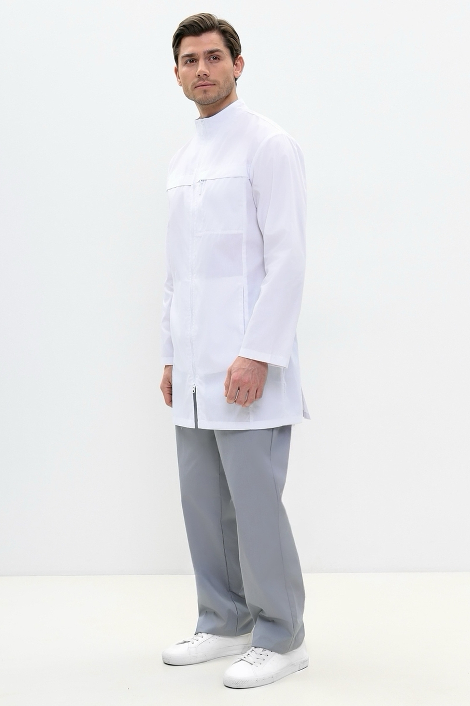 Мы предлагаем вашему вниманию оригинальную мужскую униформу для медицинского персонала. Элегантно укороченный неординарный мужской медицинский халат полуприлегающего силуэта. На модели присутствуют полочки с односторонними складками в швах и нижними карманами. Слева на халате расположен нагрудный карман с застежкой на молнию. Спинка со шлицей и двумя полупоясами, скрепленными между собой двумя кнопками. Изящный воротник-стойка. Неординарный втачной, одношовный рукав, длиной ниже запястья.