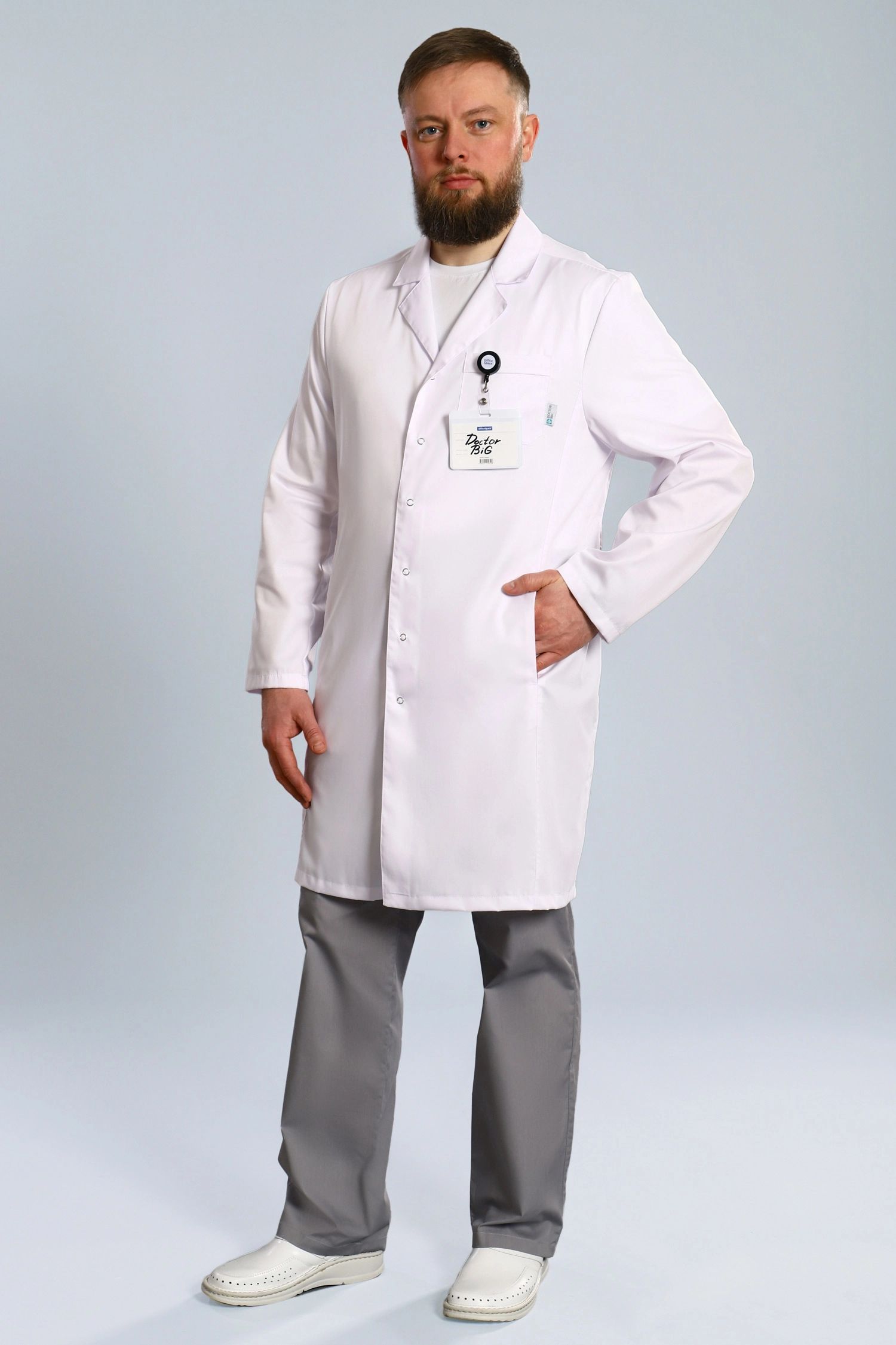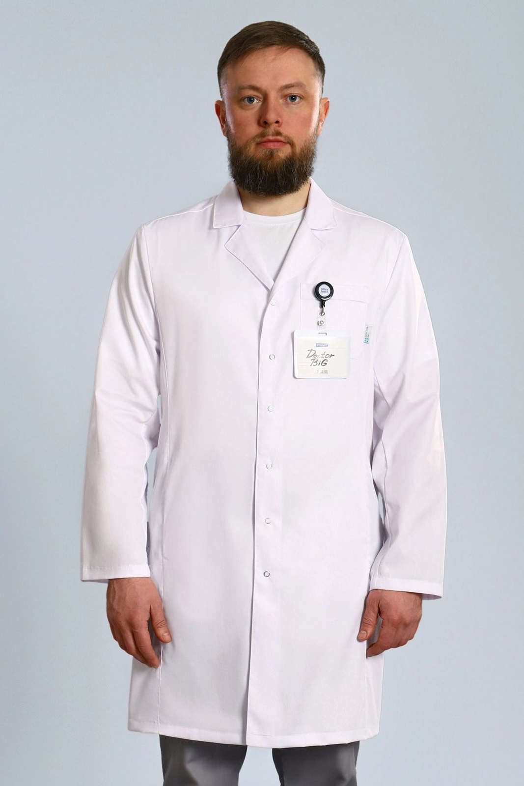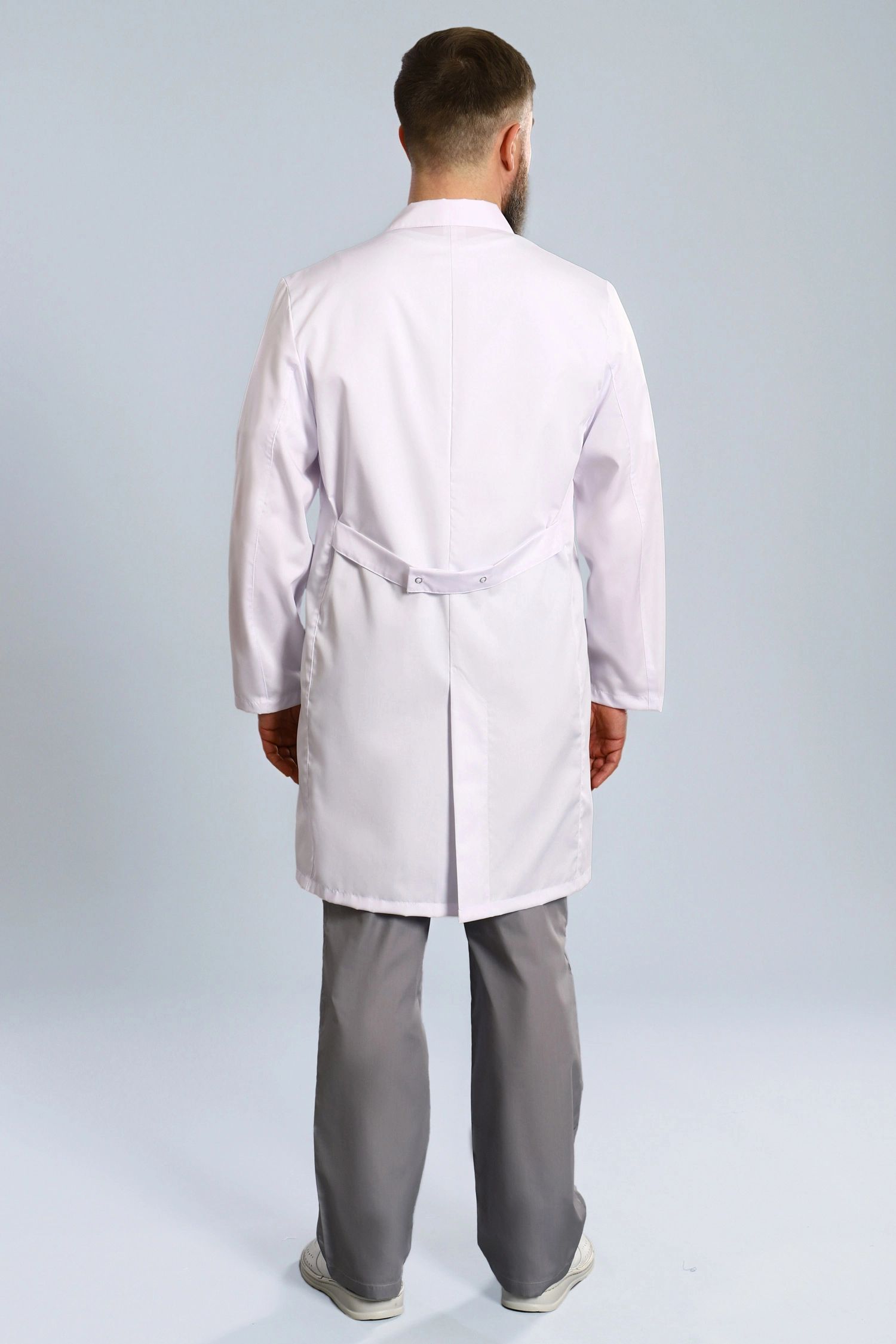 Интернет магазин медицинской одежды Медодежда.ру предлагает вашему вниманию оригинальную мужскую униформу для медицинского персонала. Строгий и элегантный мужской укороченный медицинский халат прямого силуэта, с изысканными длинными рукавами, который застегивается на эстетичные пуговицы, а изящная шлица и незаметные полупояса по спинке халата придадут вашей фигуре мужественность и стройность. Также на модели присутствует классический, изящный отложной воротник, практичные и функциональные, накладные карманы. Данная модель подойдет для любой фигуры, так как, она выполняется до 66 размера, что позволит вам с легкостью приобрести ее.