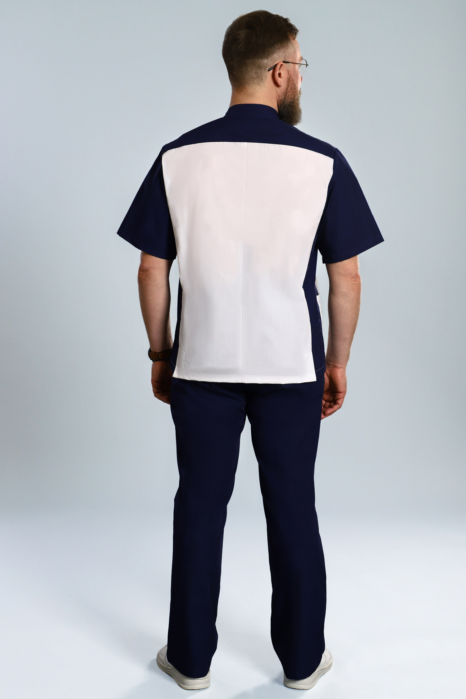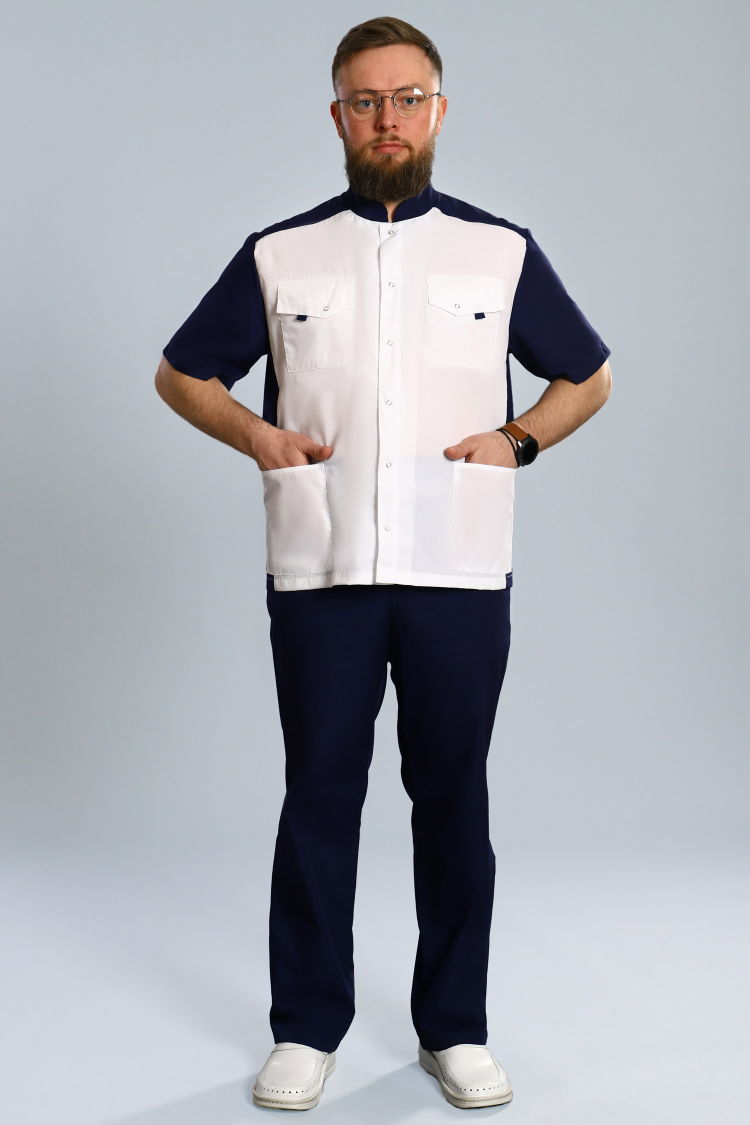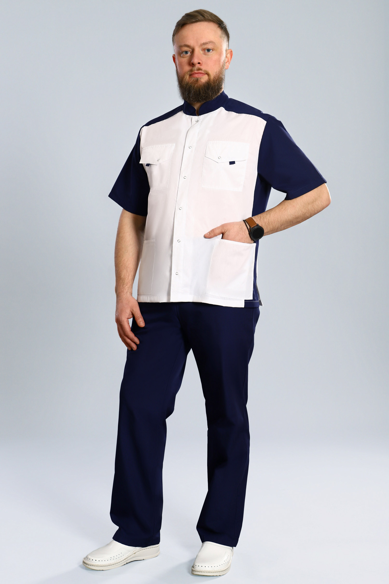 Наш магазин представляет вашему вниманию экстравагантный медицинский костюм для мужского персонала, который великолепно подчеркнет ваш изящный стиль и фигуру. Костюм состоит из яркого и неповторимого, приталенного блузона с цветной отделкой по рукавам, изысканной кокетке, воротнику, по бокам и полочкам в тон привлекательных брюк. Изящный воротник выполнен в виде грациозной стойки в комбинации с накладными, функциональными, объёмными карманами с клапанами на кнопках, которые правильно дополнят Ваш образ. Рукава одношовные, а центральная застёжка на блузоне добавляет некий изыск всему костюму. Брюки прямого кроя с боковыми, незаменимыми внутренними карманами сидят точно по фигуре. Данная модель выполняется до 56 размера.