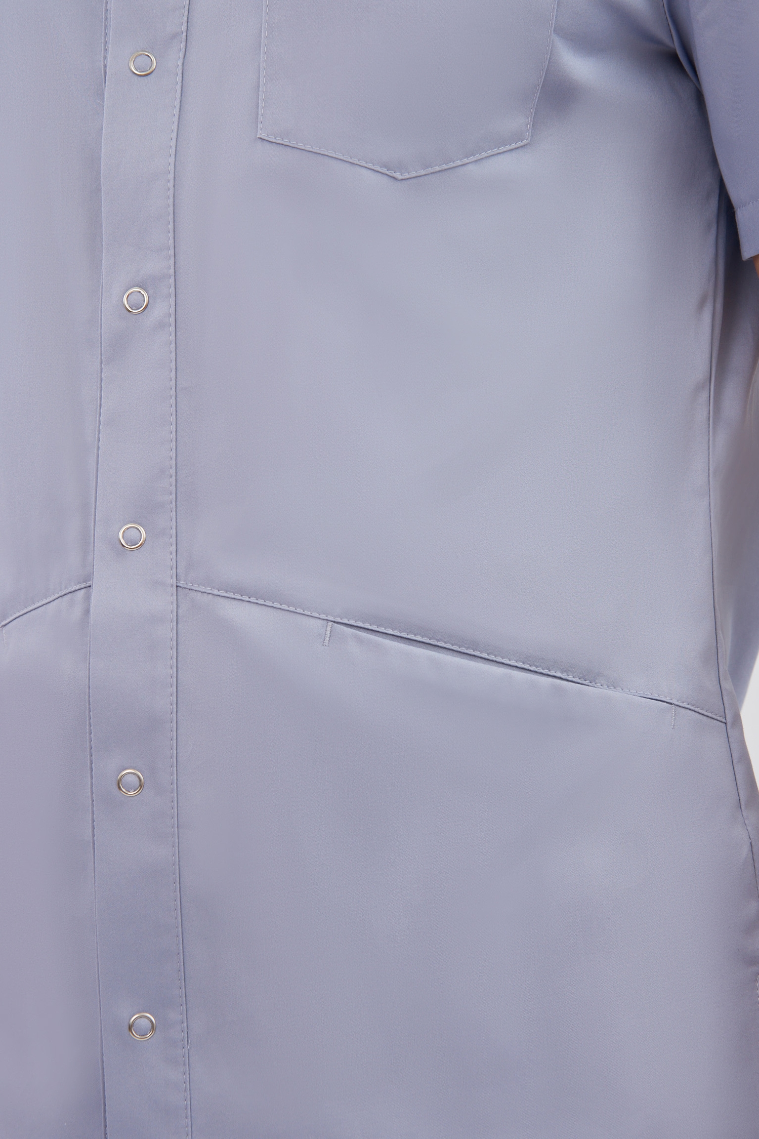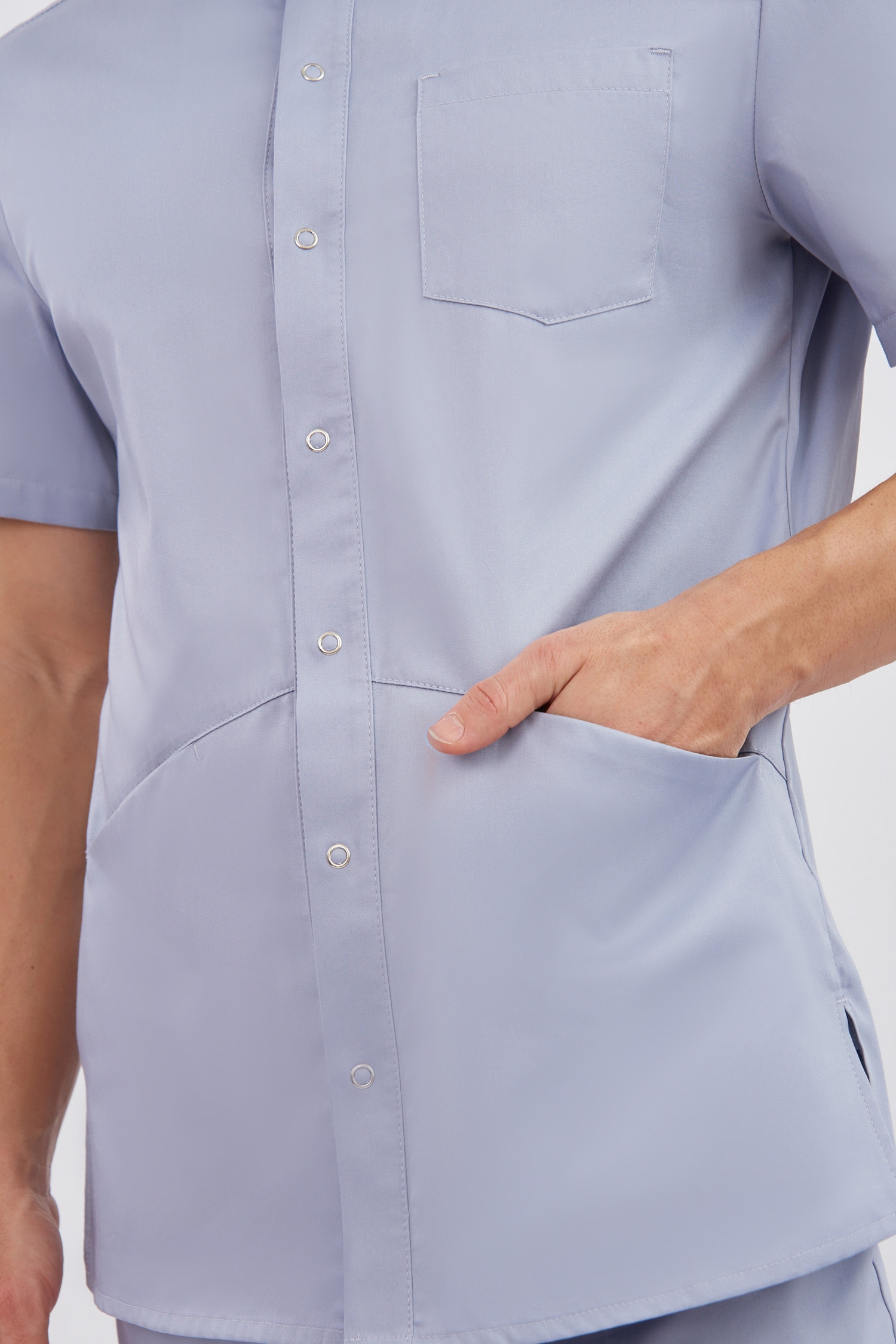 Частью костюма является строгая рубашка прямого силуэта, с центральной застежкой на 7 кнопок и 1 кнопкой на стойке воротника. Длина рубашки до уровня линии бедер и разрезы по низу боковых швов обеспечивают свободу движений во время работы. Нагрудный карман фигурной формы и два боковых кармана предоставляют достаточно места для хранения необходимых мелочей, а наклонные линии "входа" в карманы добавят стиля модели. Для дополнительного функционала, на правом рукаве рубашки размещается карман с отделением для карандаша.