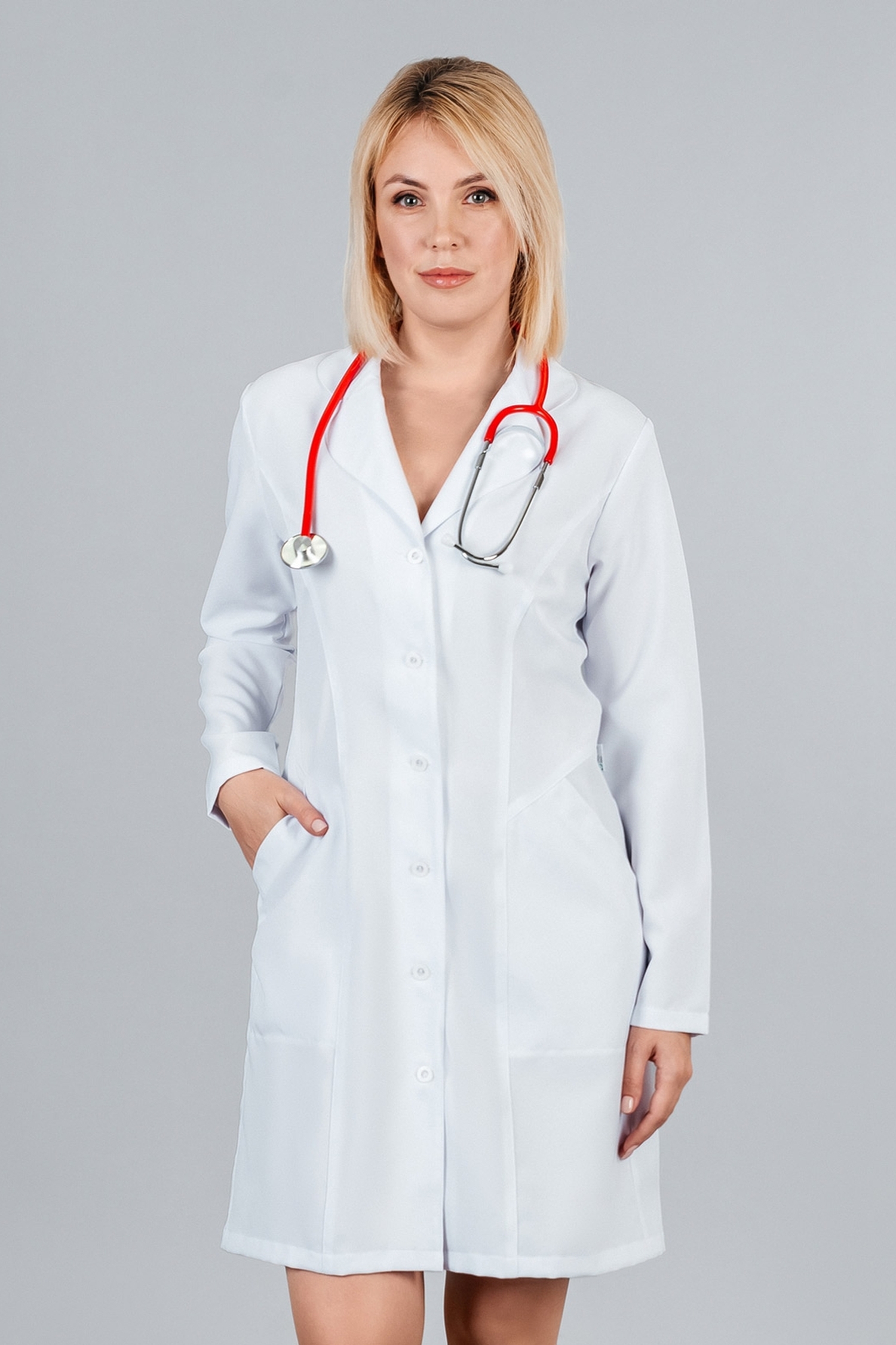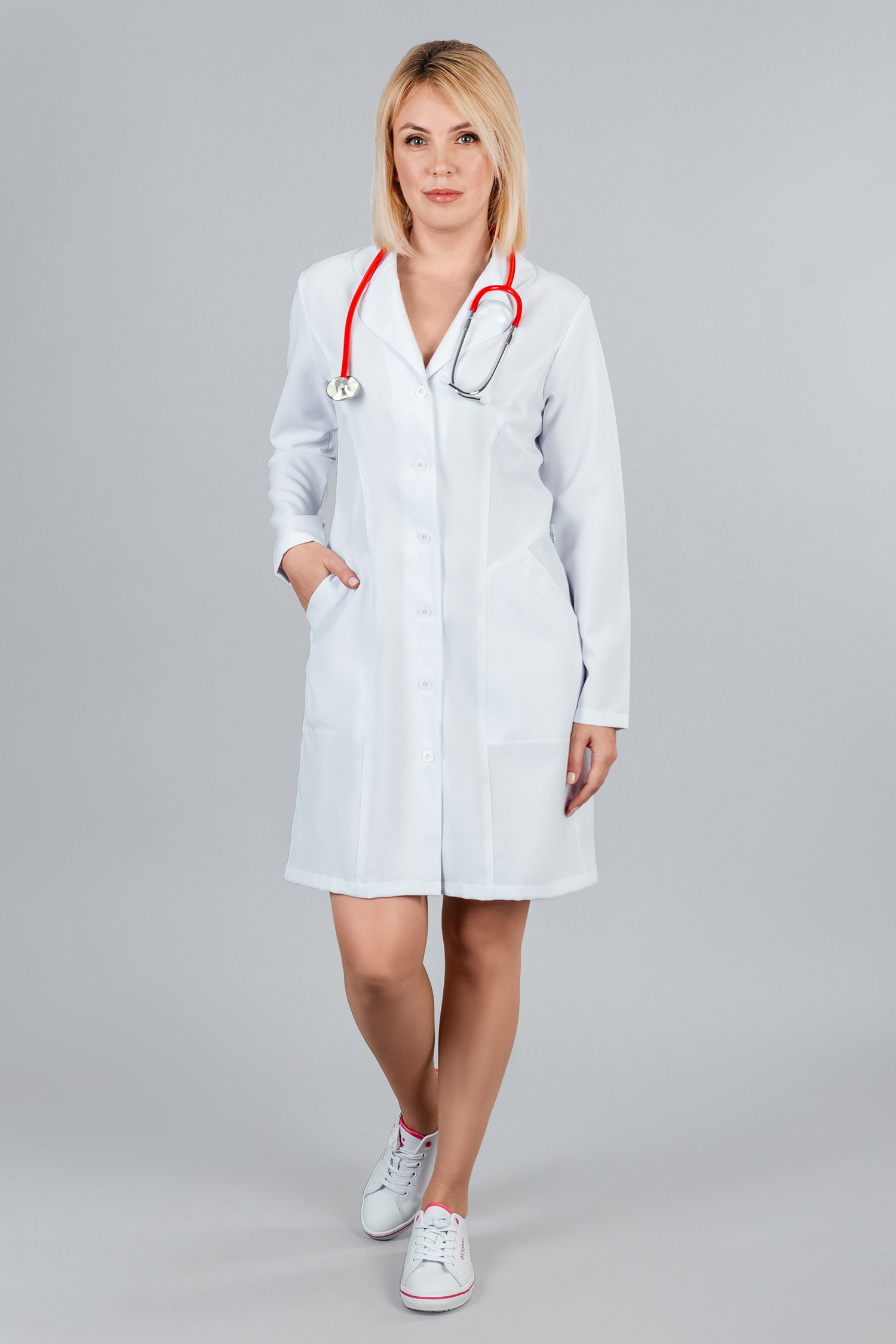 Удобный классический халат, изюминкой которого является отложной воротник с фигурными краями. Слегка приталенный силуэт, а также линии вытачек и карманов придают фигуре приятные женственные очертания. Материал Streich практически не мнется и сохраняет форму в течение всего дня, легко отстирывается от загрязнений и долго носится.