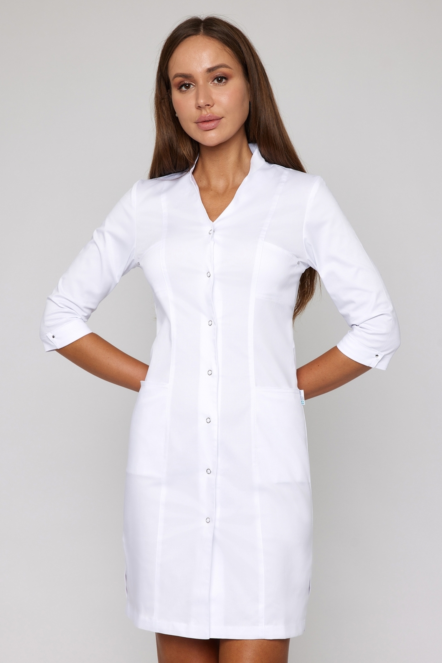 Медицинский халат арт. 2-07-03-3 - это удачное сочетание женственности и практичности. Ткань Streich устойчива к износу и почти не мнется. Четыре кармана позволяют держать все полезные мелочи при себе. Воротник-полустойка, V-образный вырез и небольшие разрезы по бокам создают образ одновременно и строгий, и женственный.