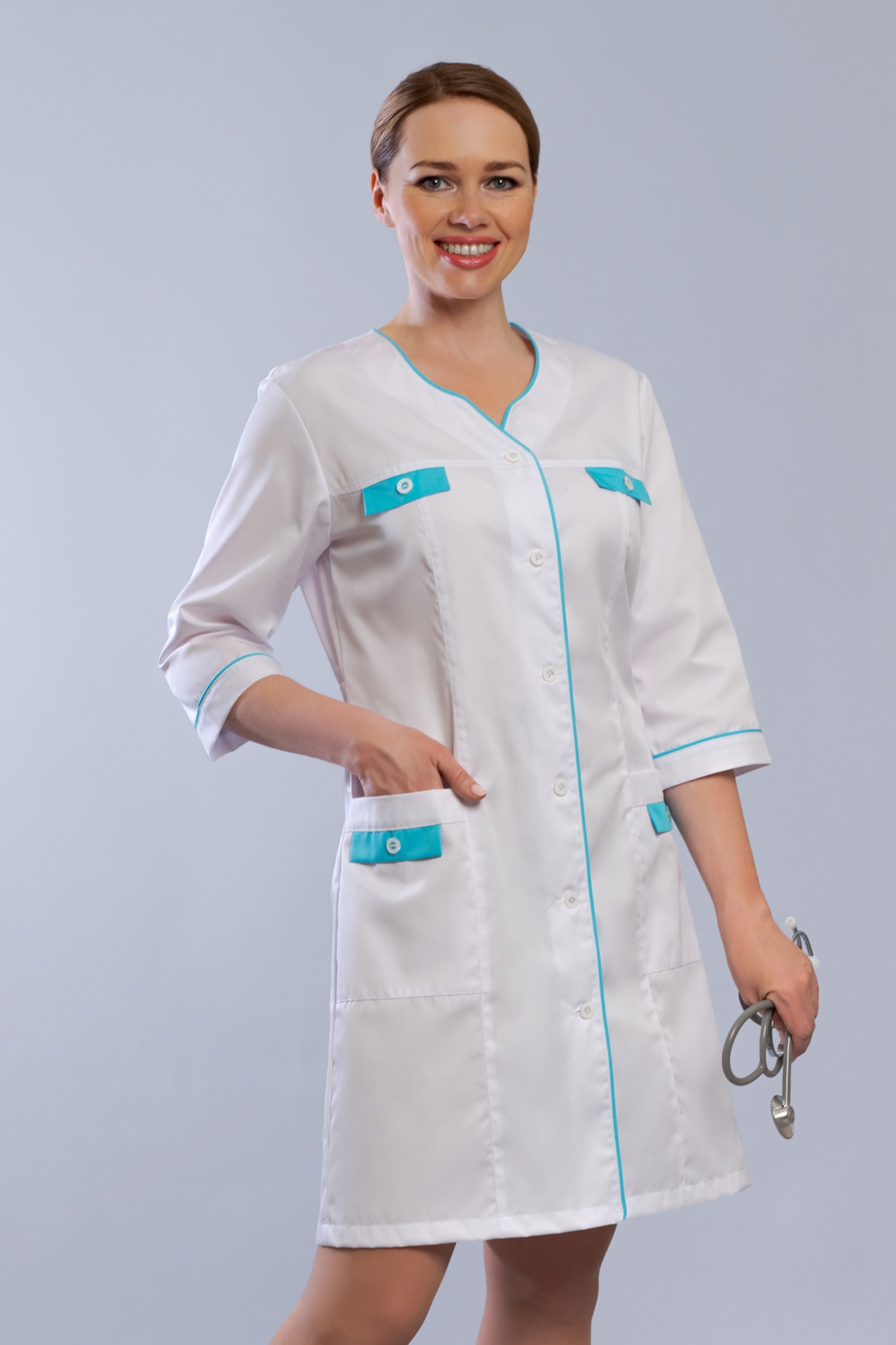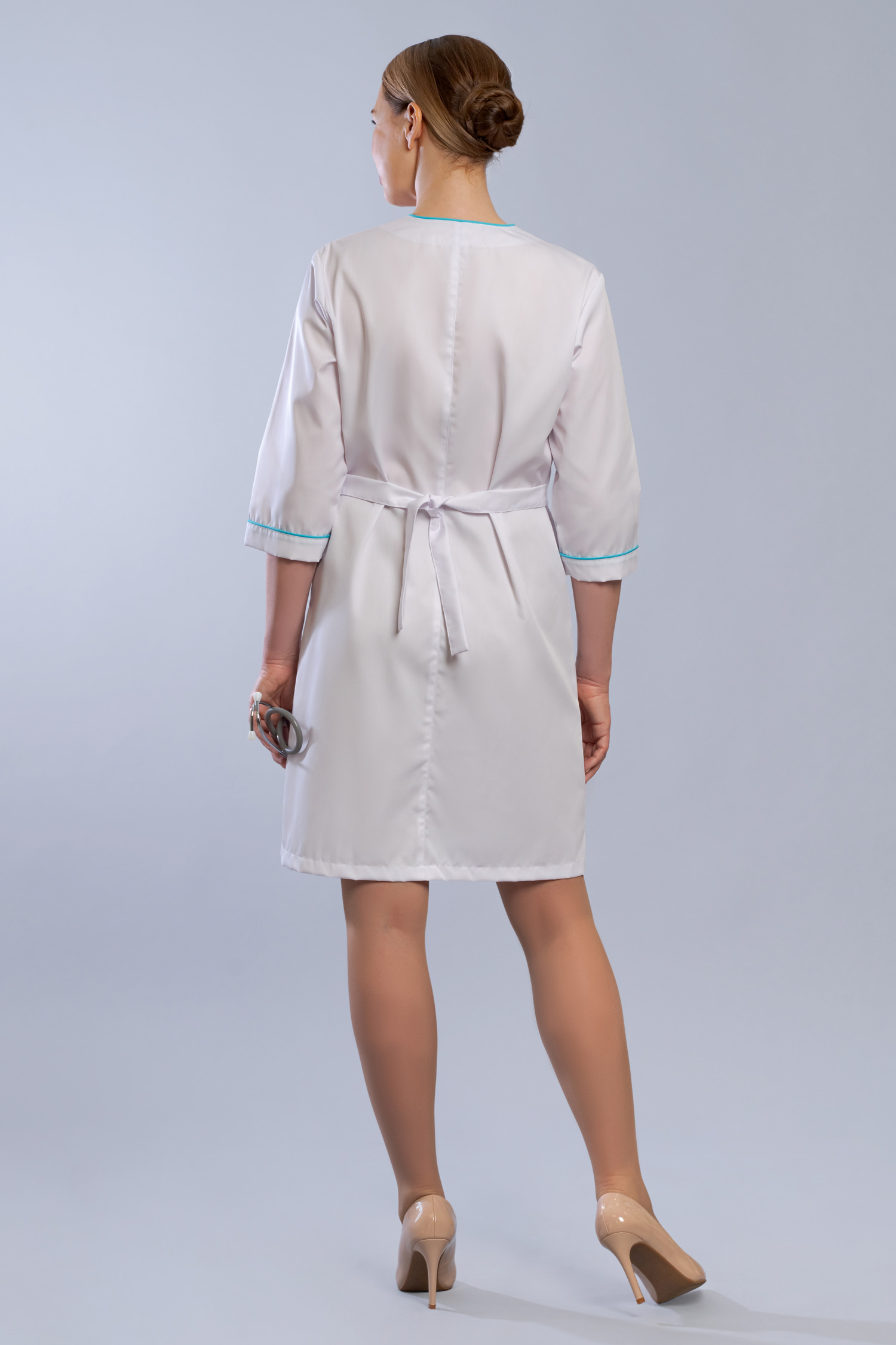 Полуприталенный силуэт модели подойдет практически к любой фигуре. Рукав три четверти. Аккуратно подчеркнут линию талии регулируемые хлястики на спинке изделия. Стильный акцент – яркие вставки по фигурной линии горловины и застежки. Цветная отделка повторяется и на карманах. Удобная застежка на пуговицах. В таком халате вы точно привлечете внимание и массу комплиментов. Вы можете заказать любой размер до 72.