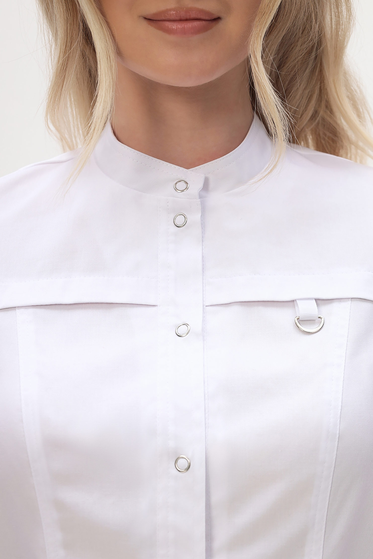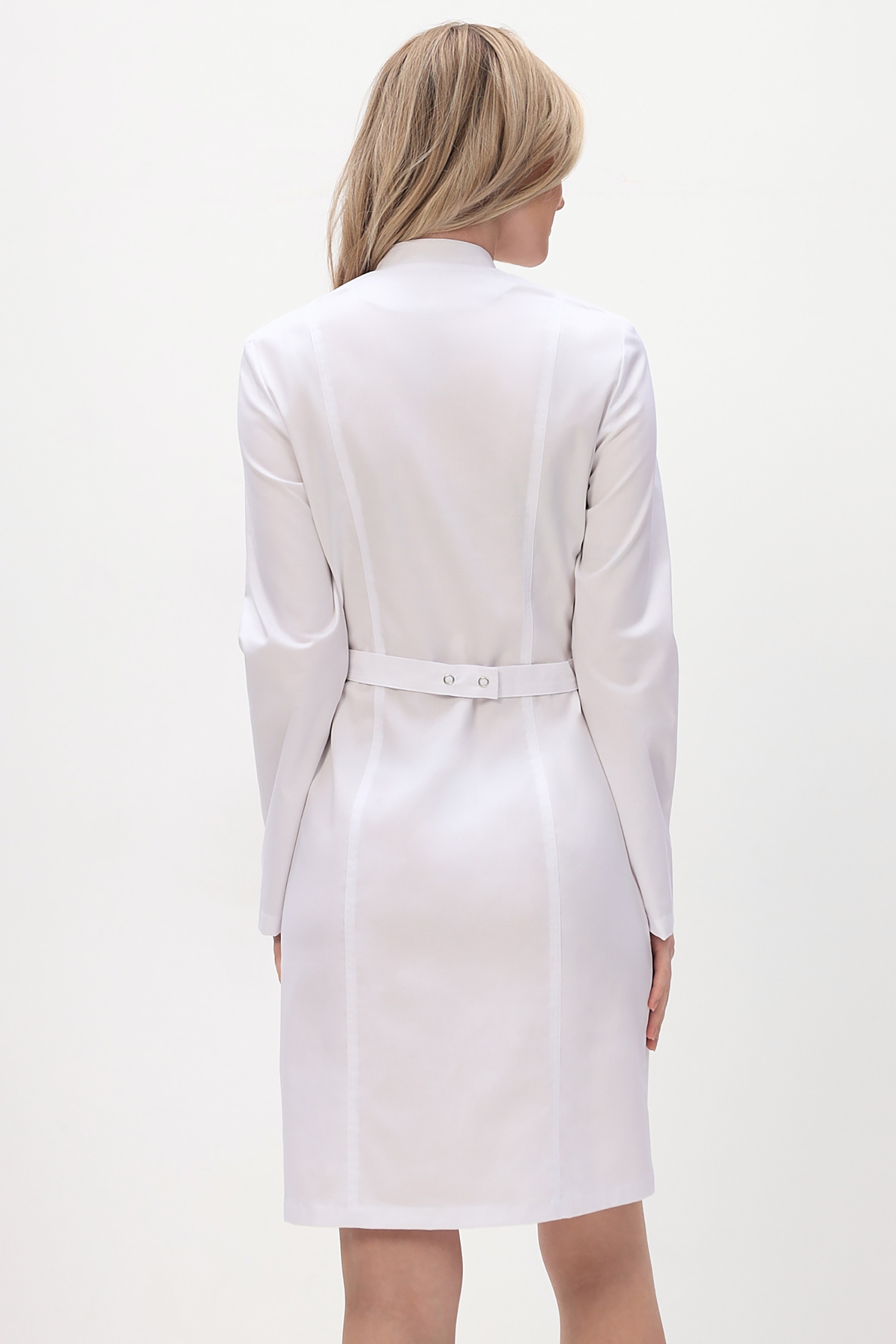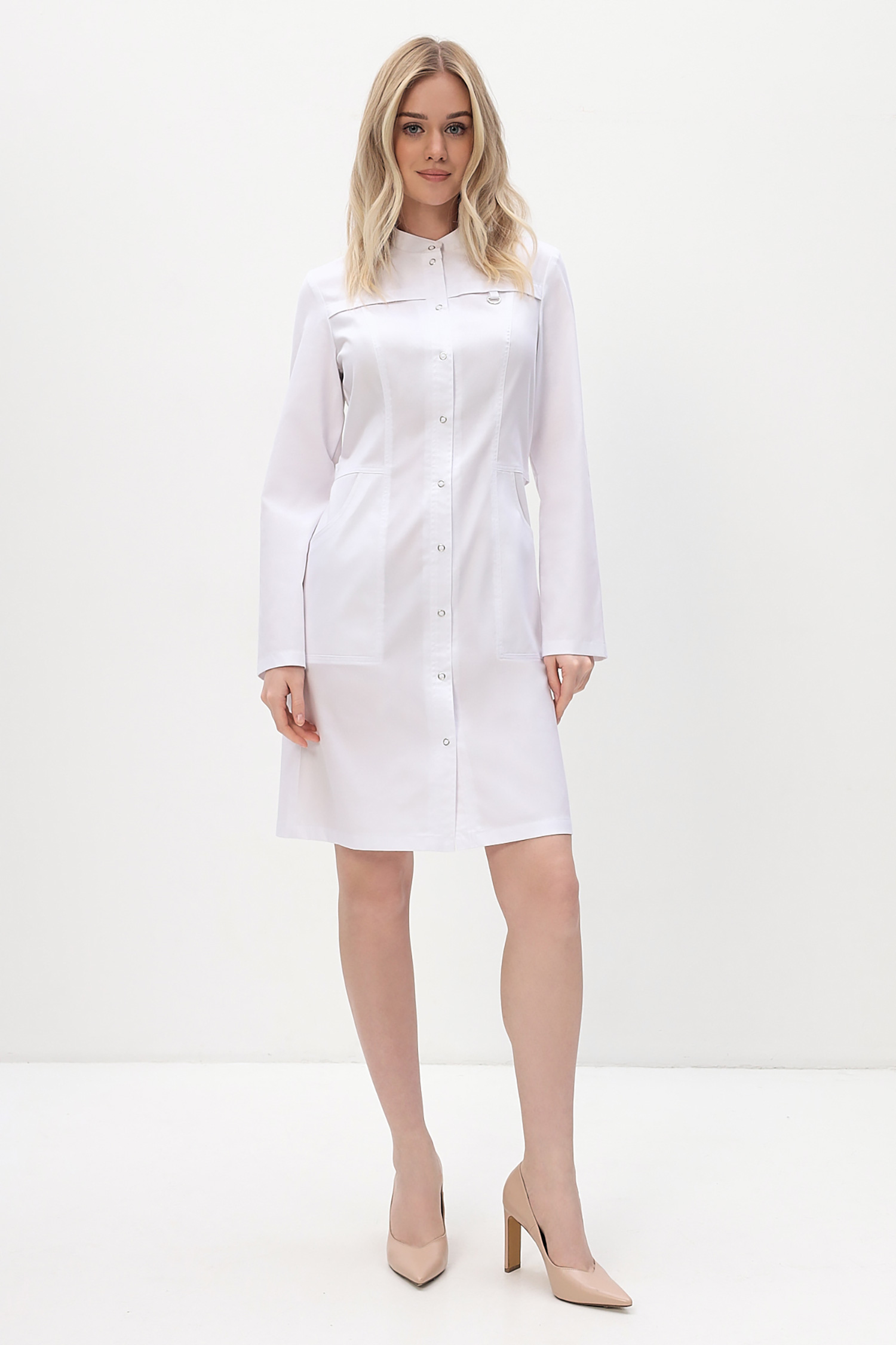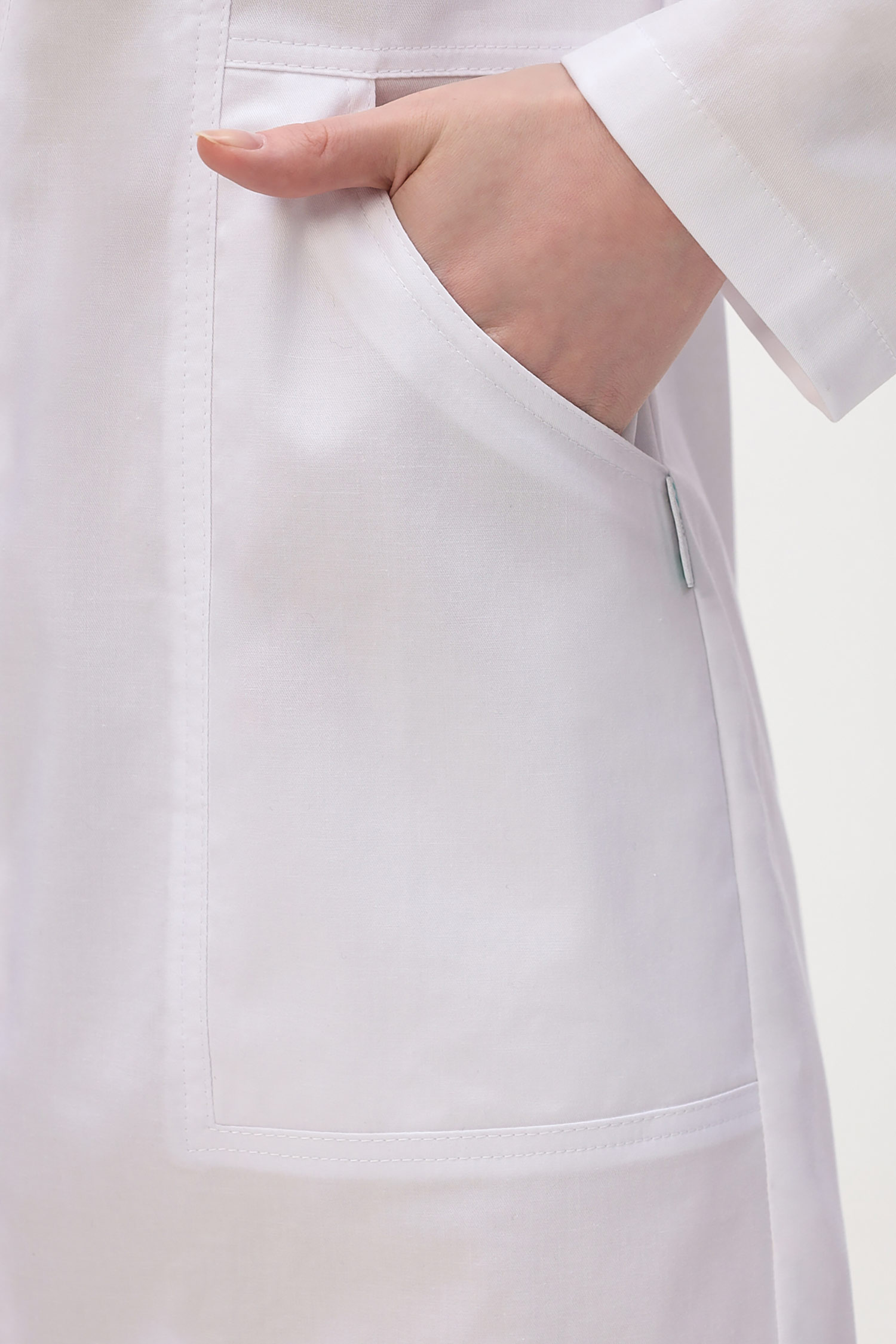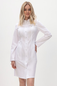 Халат полуприталенного кроя, рукав ¾ , застежка на кнопках. В этой модели особое внимание уделено отделке рукавов, горловины и подбортка контрастным цветом. Рельефные швы по спинке и полочке изделия формируют привлекательный силуэт обладательницы и зрительно удлиняют фигуру. Удобные карманы вместят все необходимые мелочи для работы. Эта модель подтверждает, что медицинская униформа может быть не только удобной и практичной, но также красивой и современной. Доступны к заказу размеры до 52.