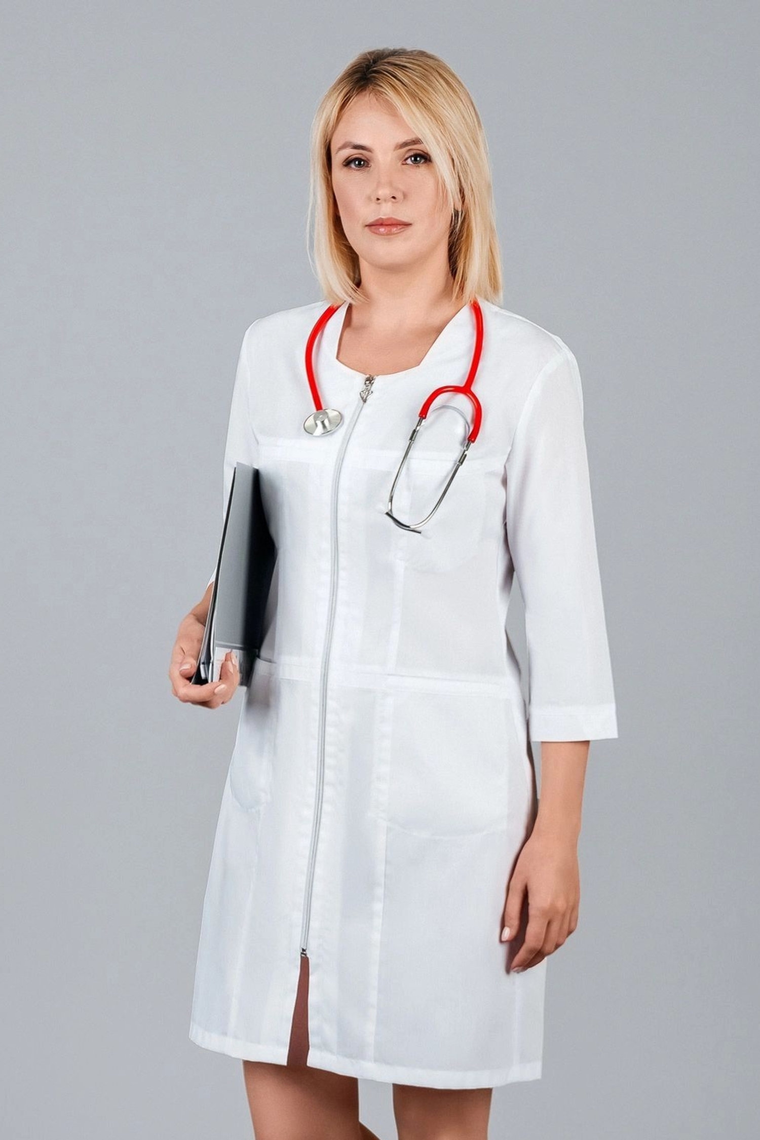 Модный, укороченный халат. Приталенный крой аккуратно подчеркнет достоинства фигуры обладательницы. Оригинальный вырез горловины придает изюминку образу. Качество ткани позволяет медицинской униформе выглядеть опрятно даже после тяжелого рабочего дня. Водоотталкивающая пропитка халата защищает его от загрязнений. В такой модели Вы будете чувствовать себя уверенно и комфортно. Застежка молния надежна и практична в использовании. Изделие выполняется до 52 размера.