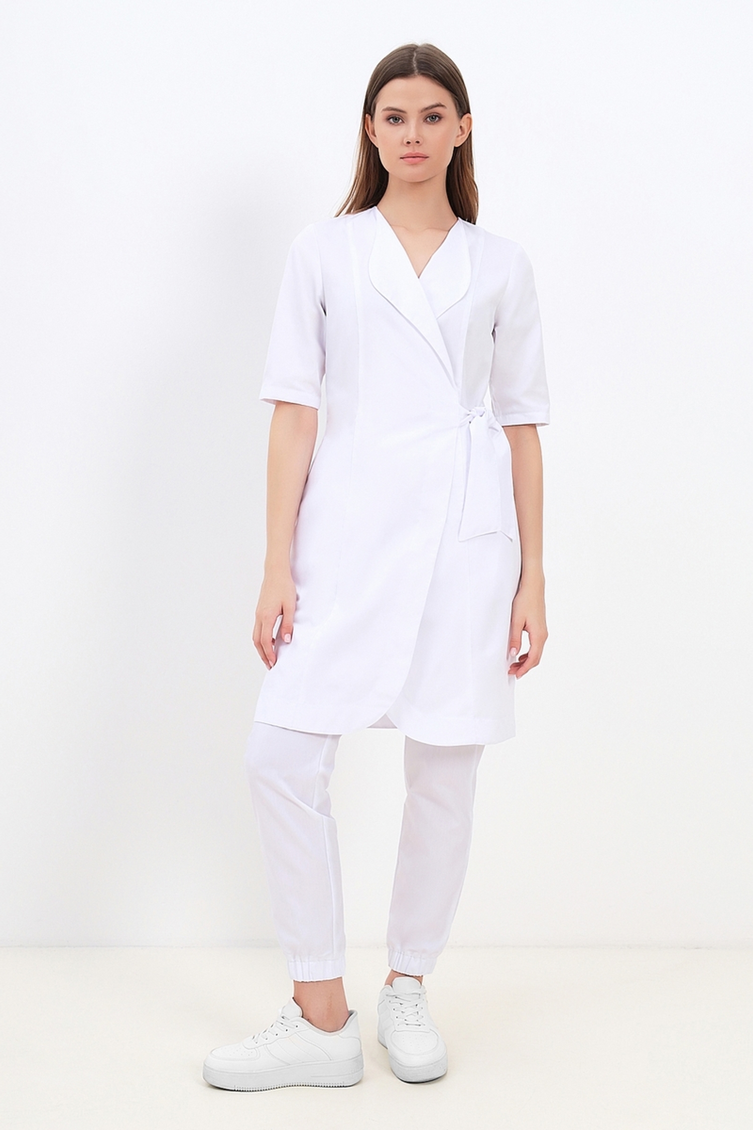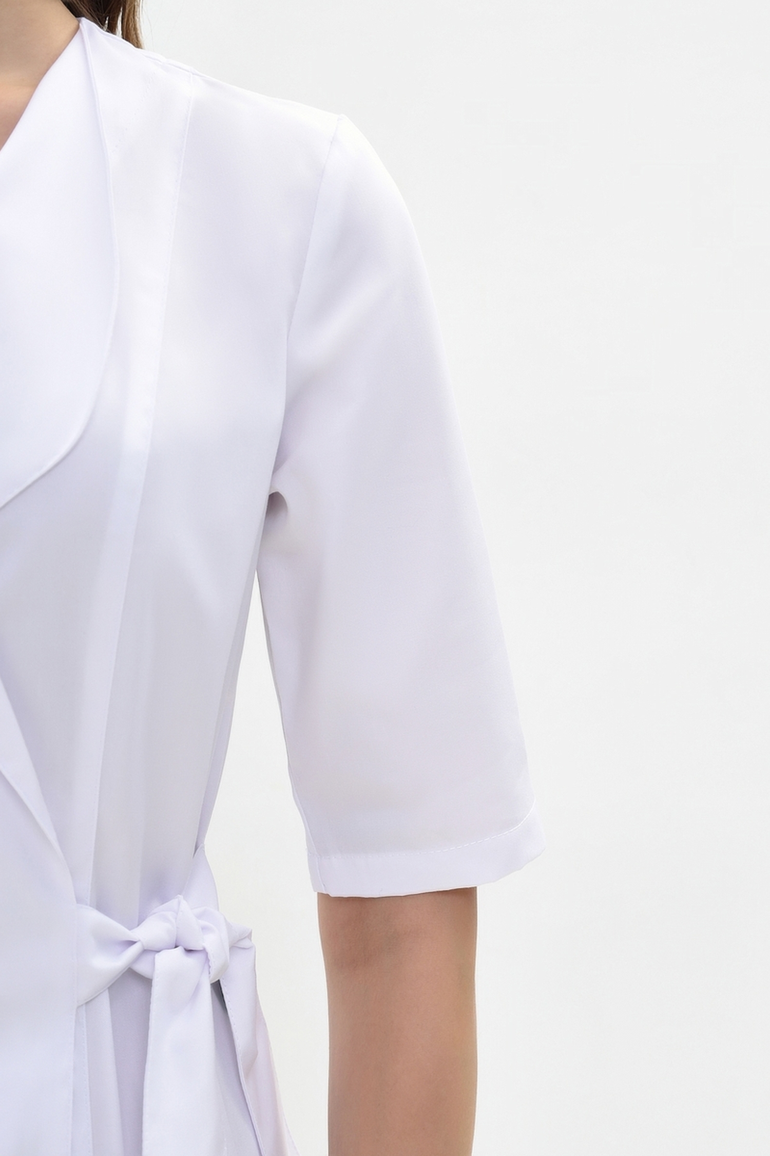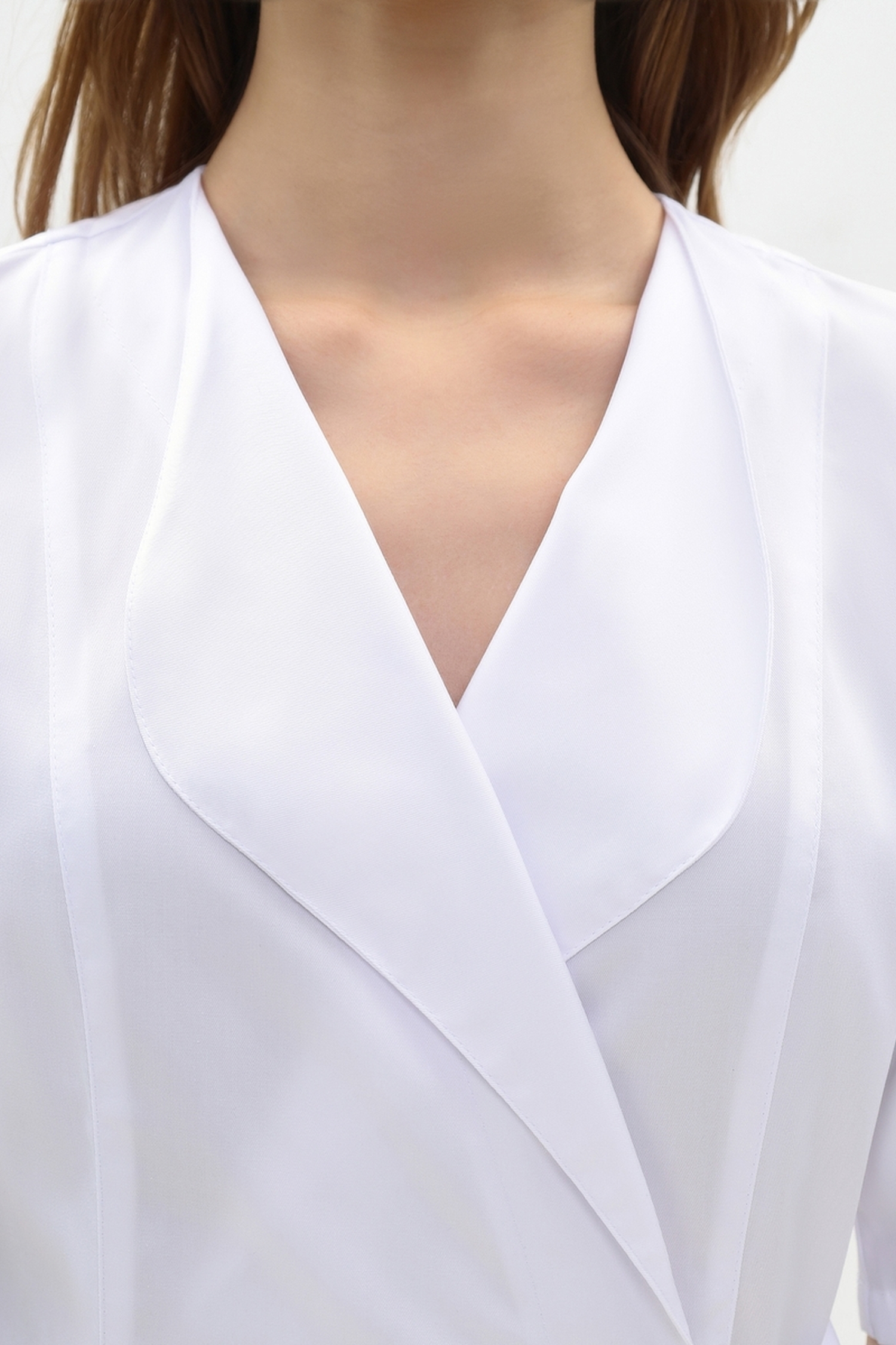Даже в профессиональной форме можно подчеркнуть свою индивидуальность и выглядеть стильно! С этой задачей прекрасно справится наша новинка – элегантный запашной халат приталенного силуэта арт.285. Запах и шалевый воротник образуют красивую линию декольте, а оптимальная длина халата до линии колен и рукав длиной 1/2 обеспечивают комфорт в течение всего дня. Модель имеет два вместительных кармана, спрятанных в боковых швах. Левый лацкан, выполненный из отделочного материала, делает халат одновременно деловым и женственным, что как нельзя лучше отражает образ современного врача.