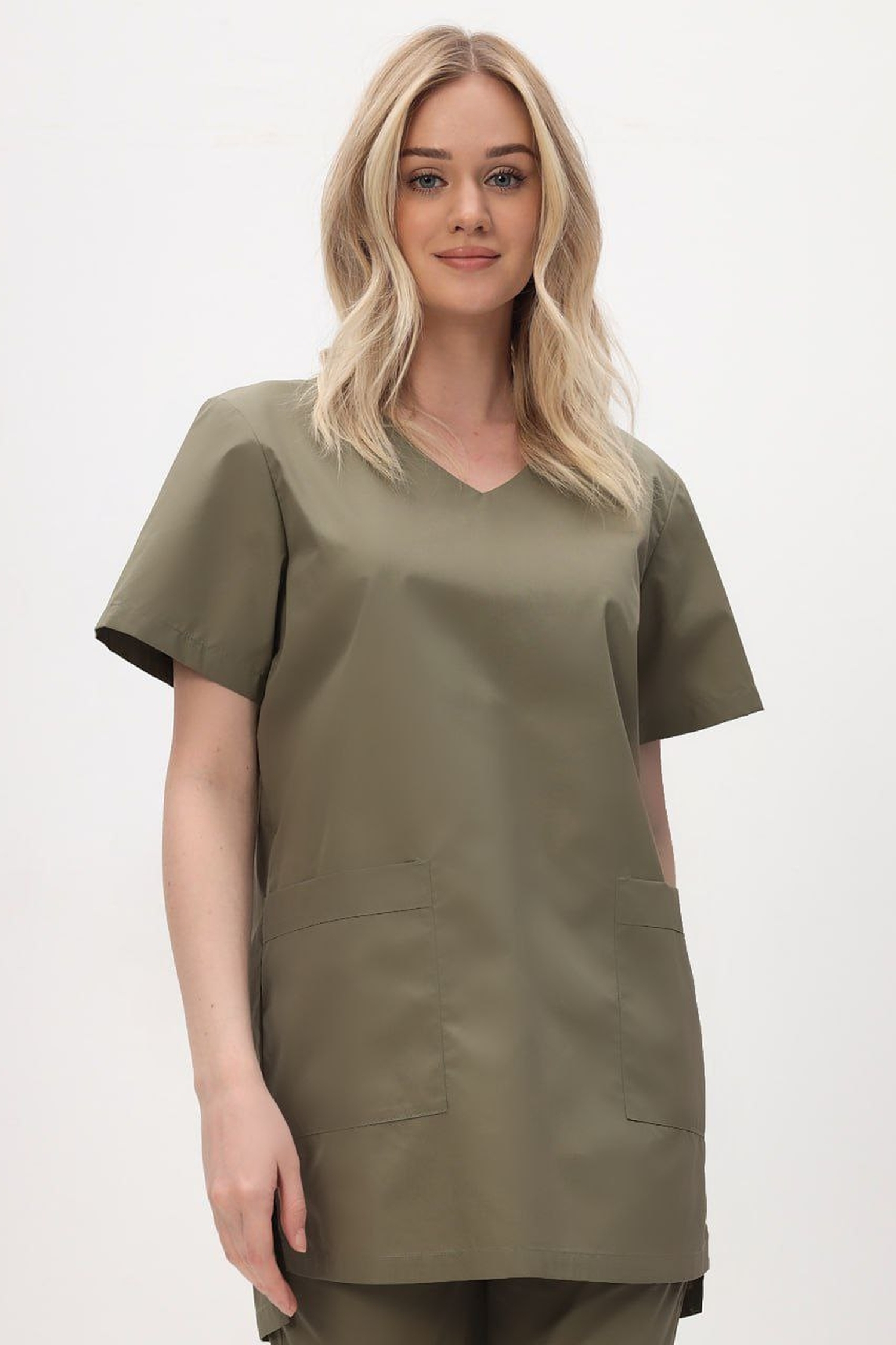 Топ с V-образным вырезом и коротким рукавом делают акцент на легкости и непринужденности в образе. Два глубоких накладных кармана, расположенных на топе, позволят удобно хранить всё необходимое. В соответствии с тенденциями моды 2023 передняя часть топа (полочка) короче спинки, ведь стиль - это про Вас!